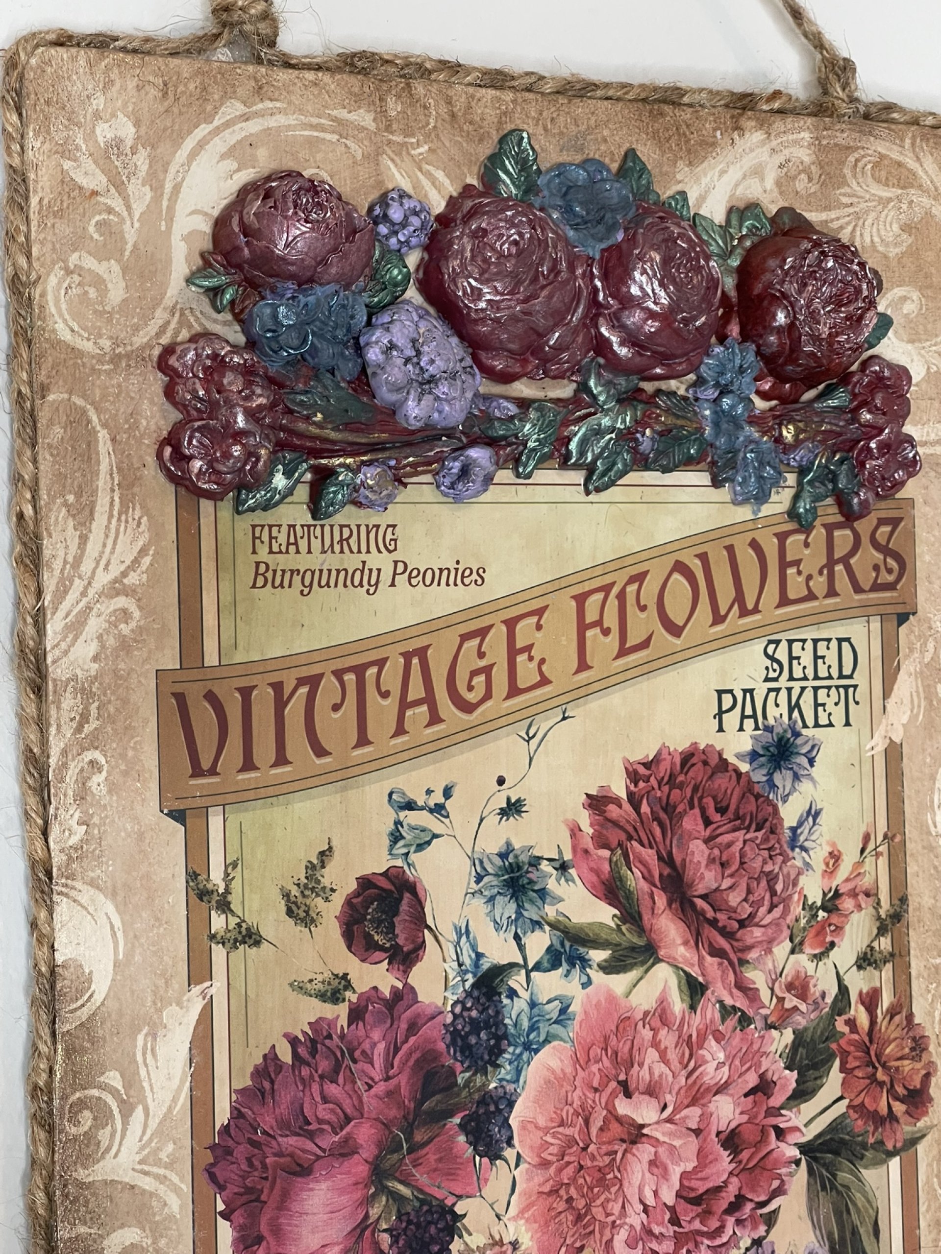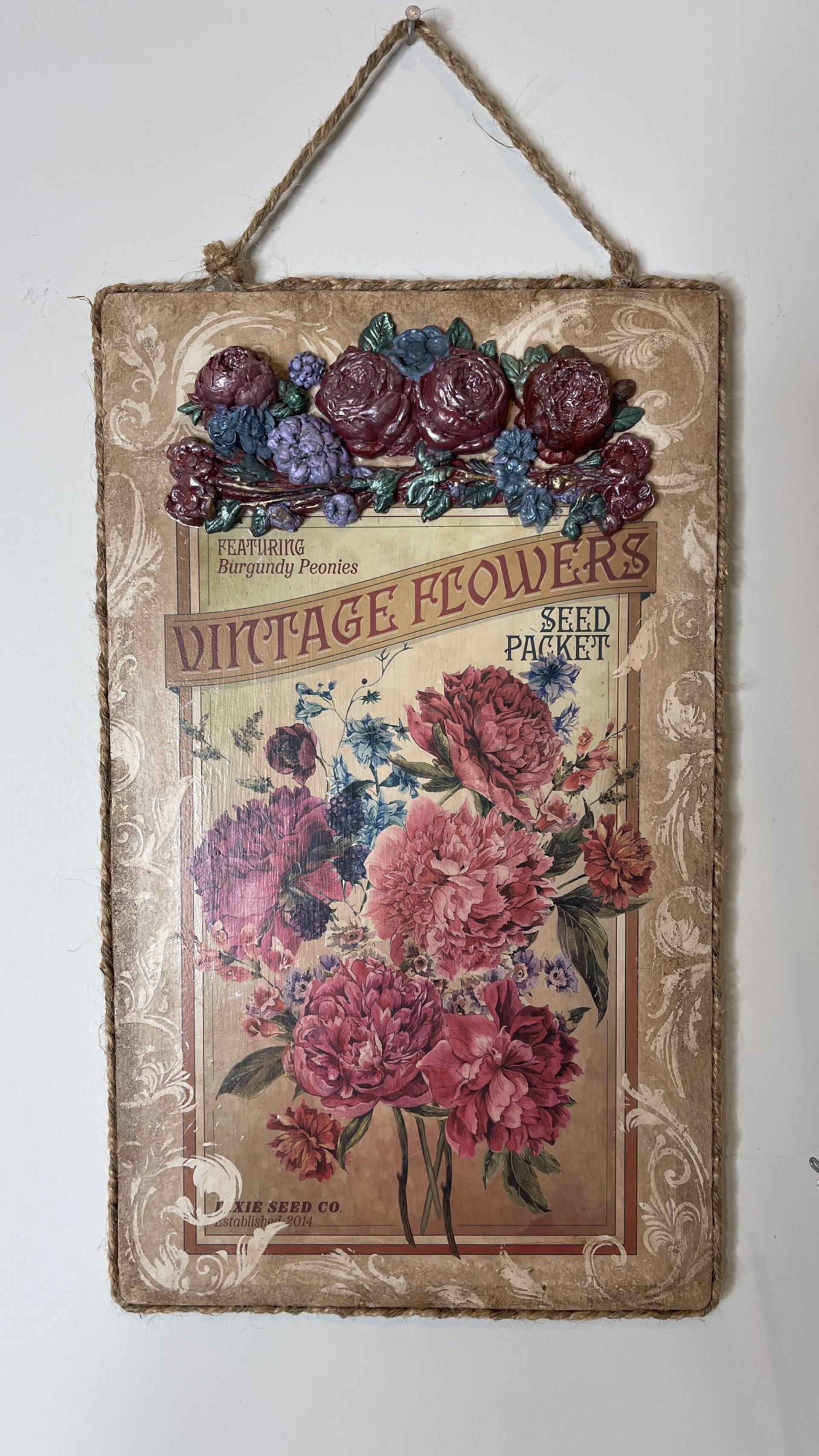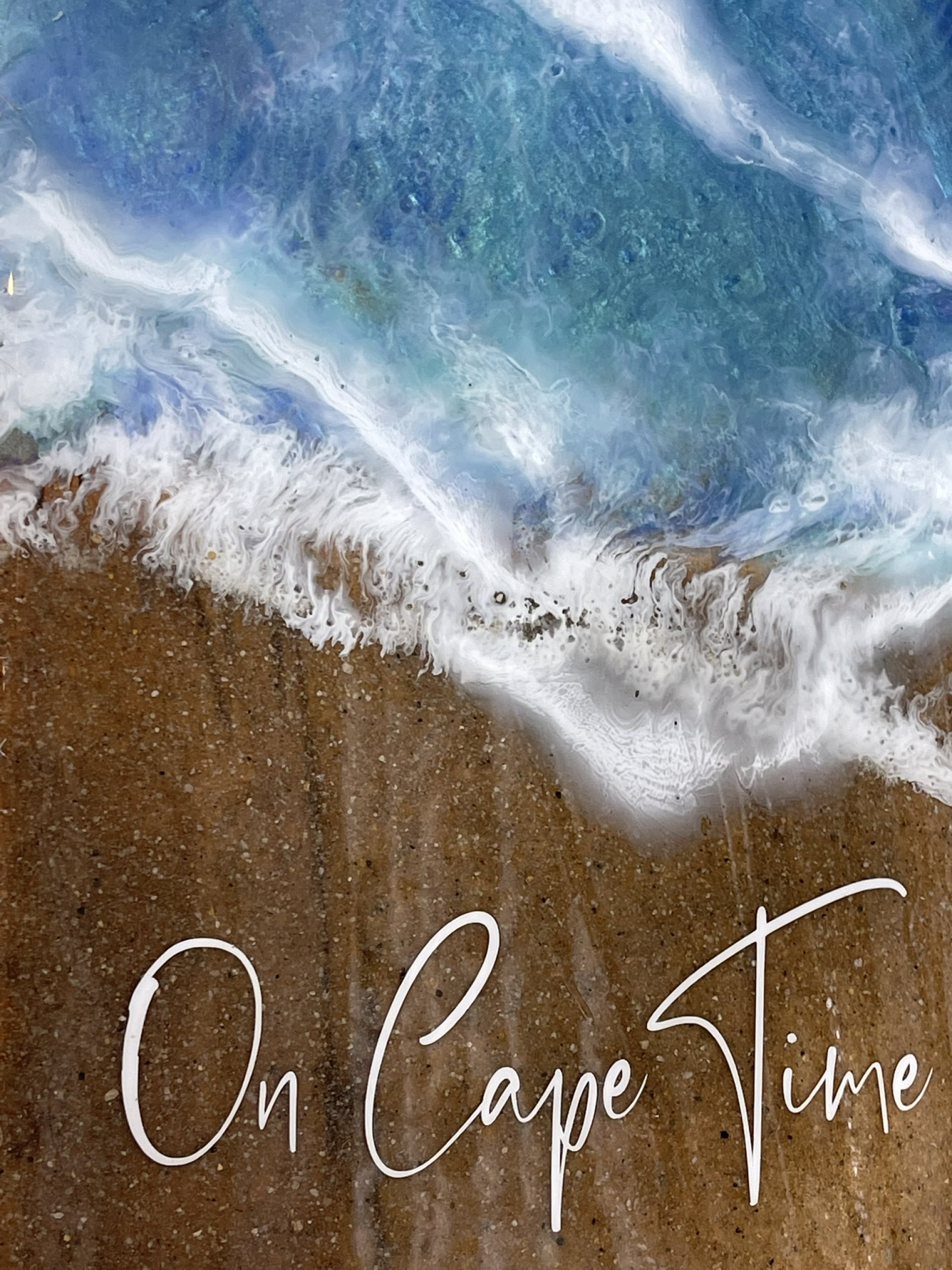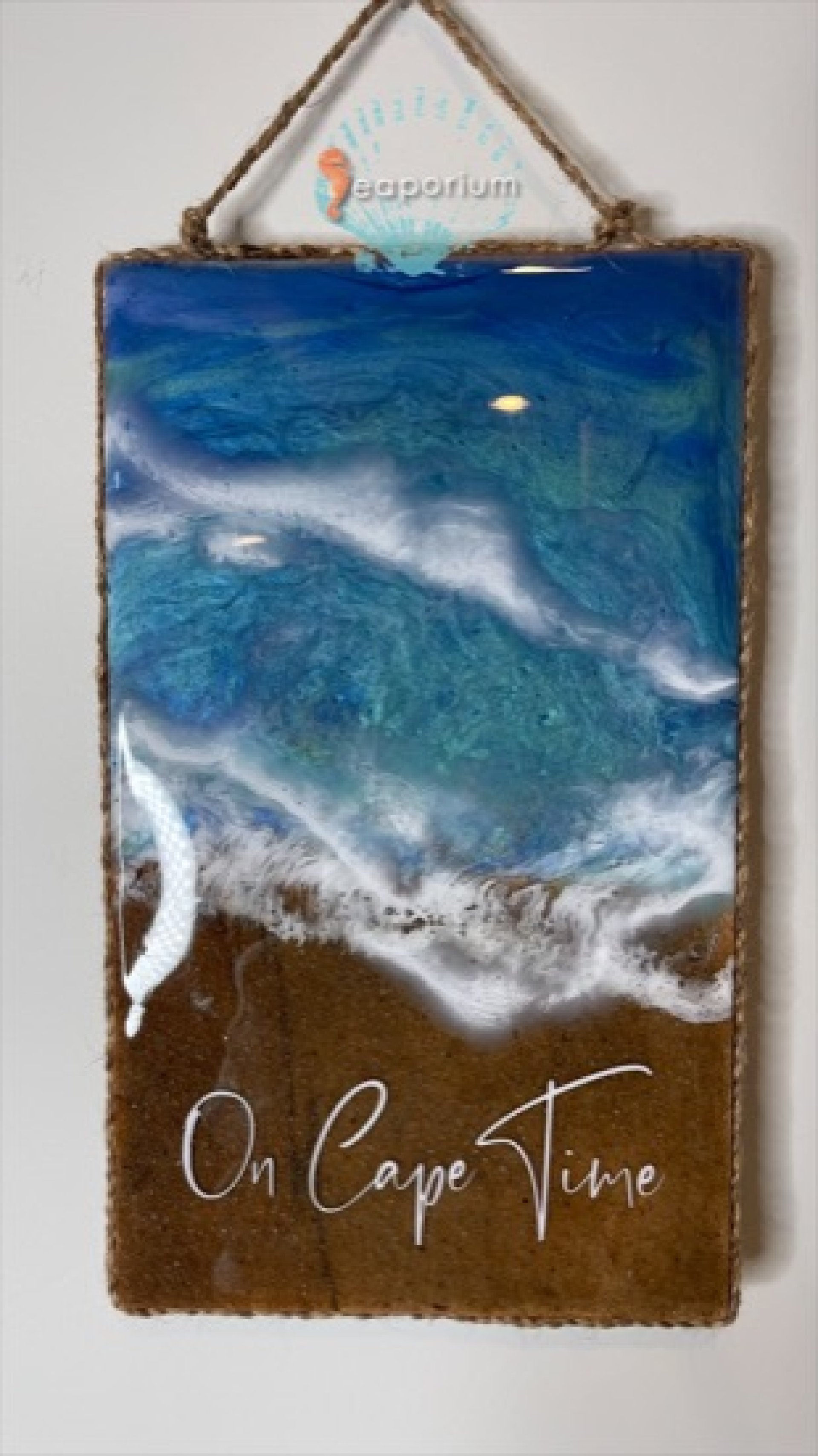A truly unique piece indeed! Beautiful resin wave artwork with words "On Cape Time" on side. The other side features a vintage style that has vintage floral moulds, artwork with likeness to a seed package. I use food safe resin and in this case, I added some real Cape Cod beach sand! The floral side has moulds I hand moulded and painted along with other fine details as stenciled background to the image. Braided twine encompasses it all.