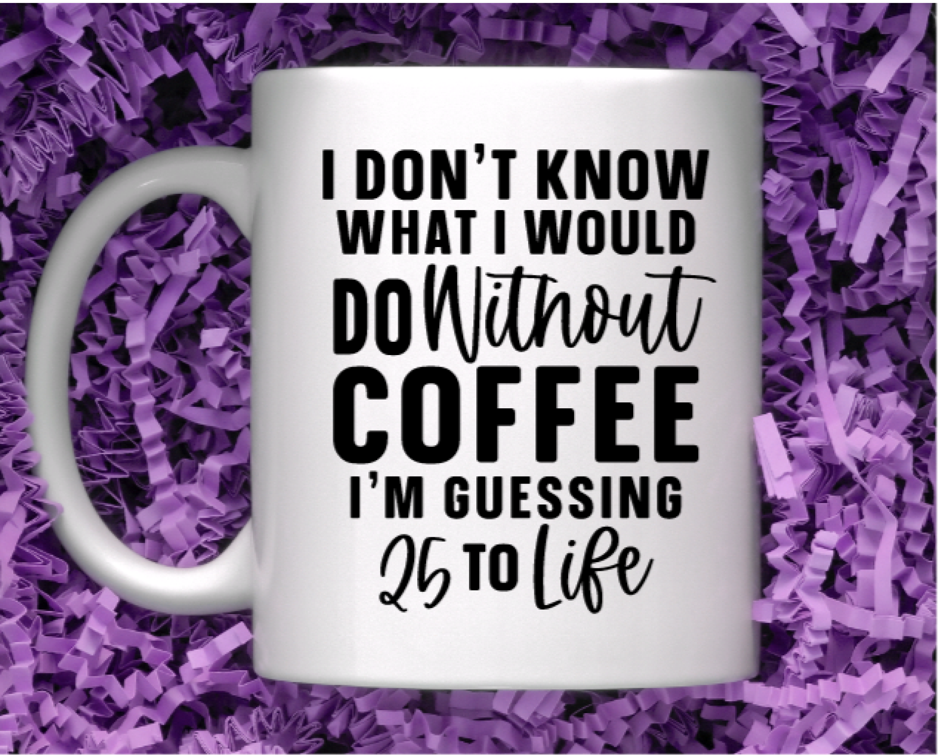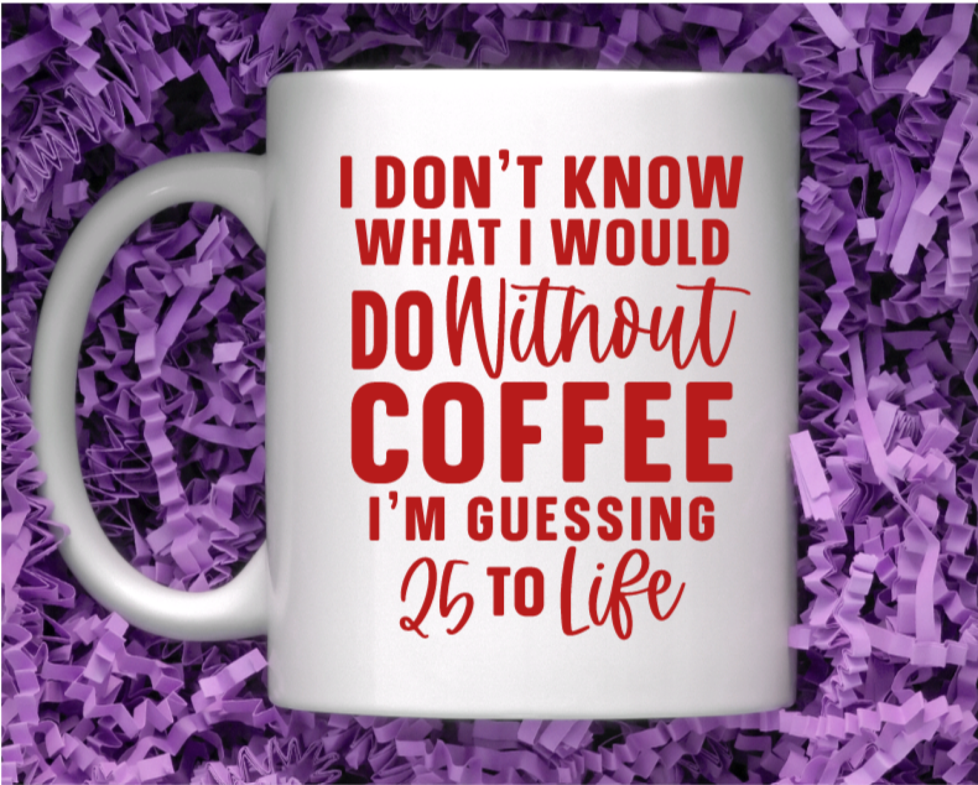 Design reads "I don't know what I'd do without coffee I'm guessing 25 to life"
