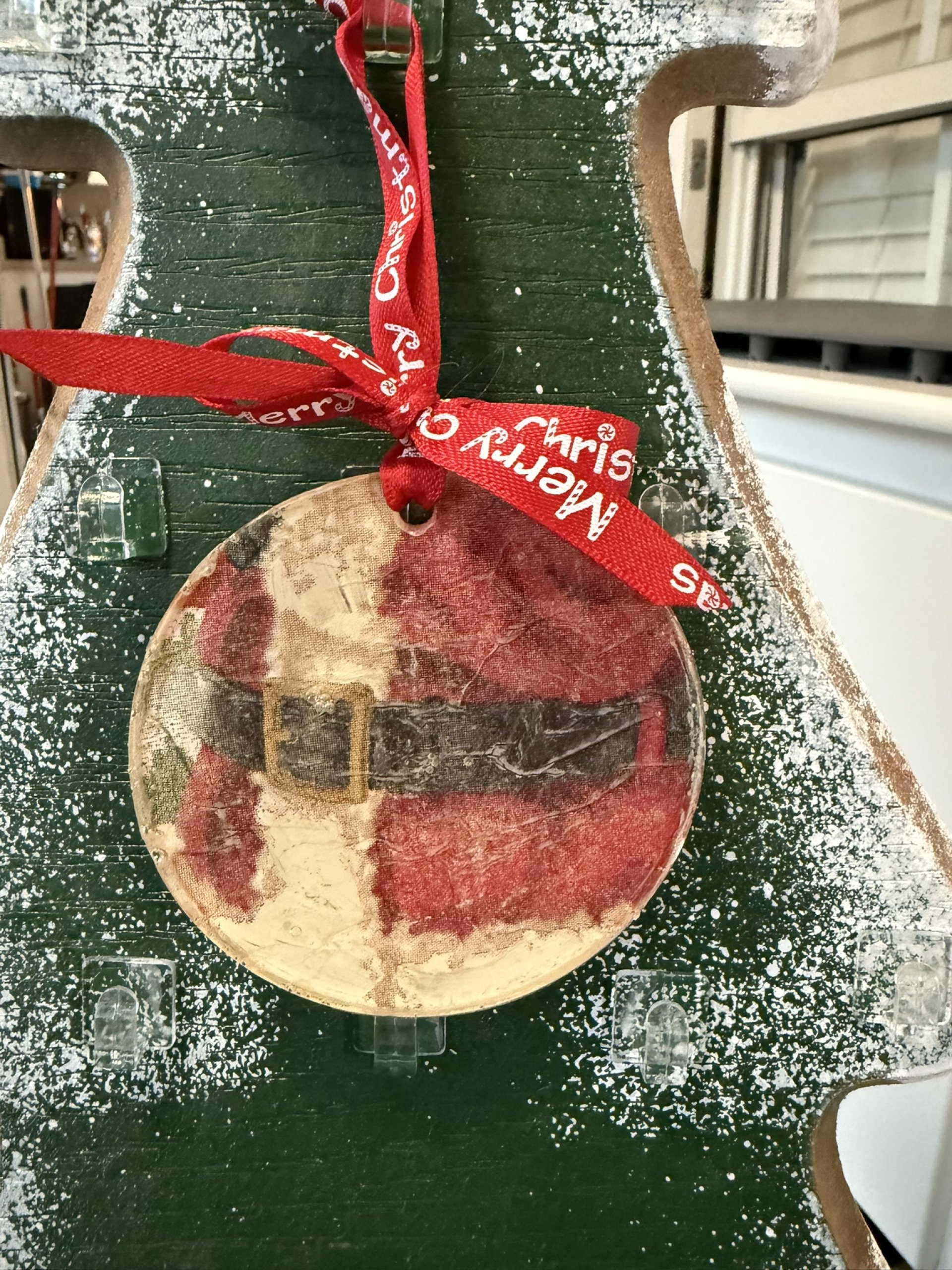 Bring festive cheer to your Christmas tree with this unique, hand-poured resin ornament. Measuring 3 inches in diameter, this round decoration captures a charming, up-close portrait of jolly old Saint Nick's belly. Its a whimsical keepsake that celebrates the magic of the holiday season. Unlike traditional glass ornaments, this resin ornament is shatterproof and lightweight, making it a perfect addition to any tree, garland, or wreath without weighing it down. Ready to hang with pre-attached ribbon.