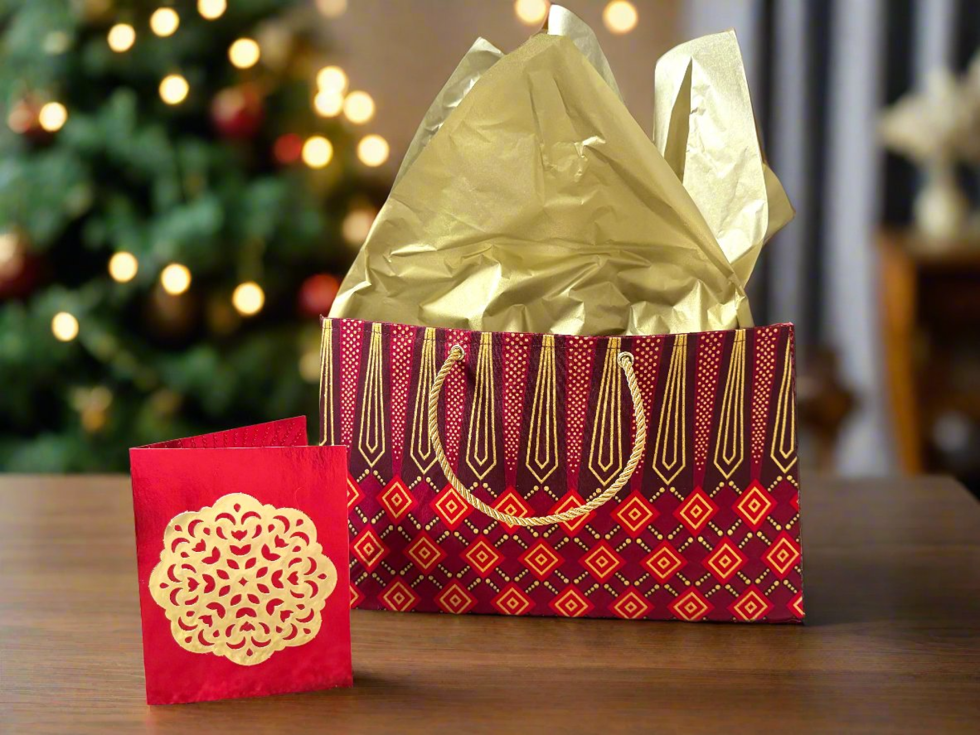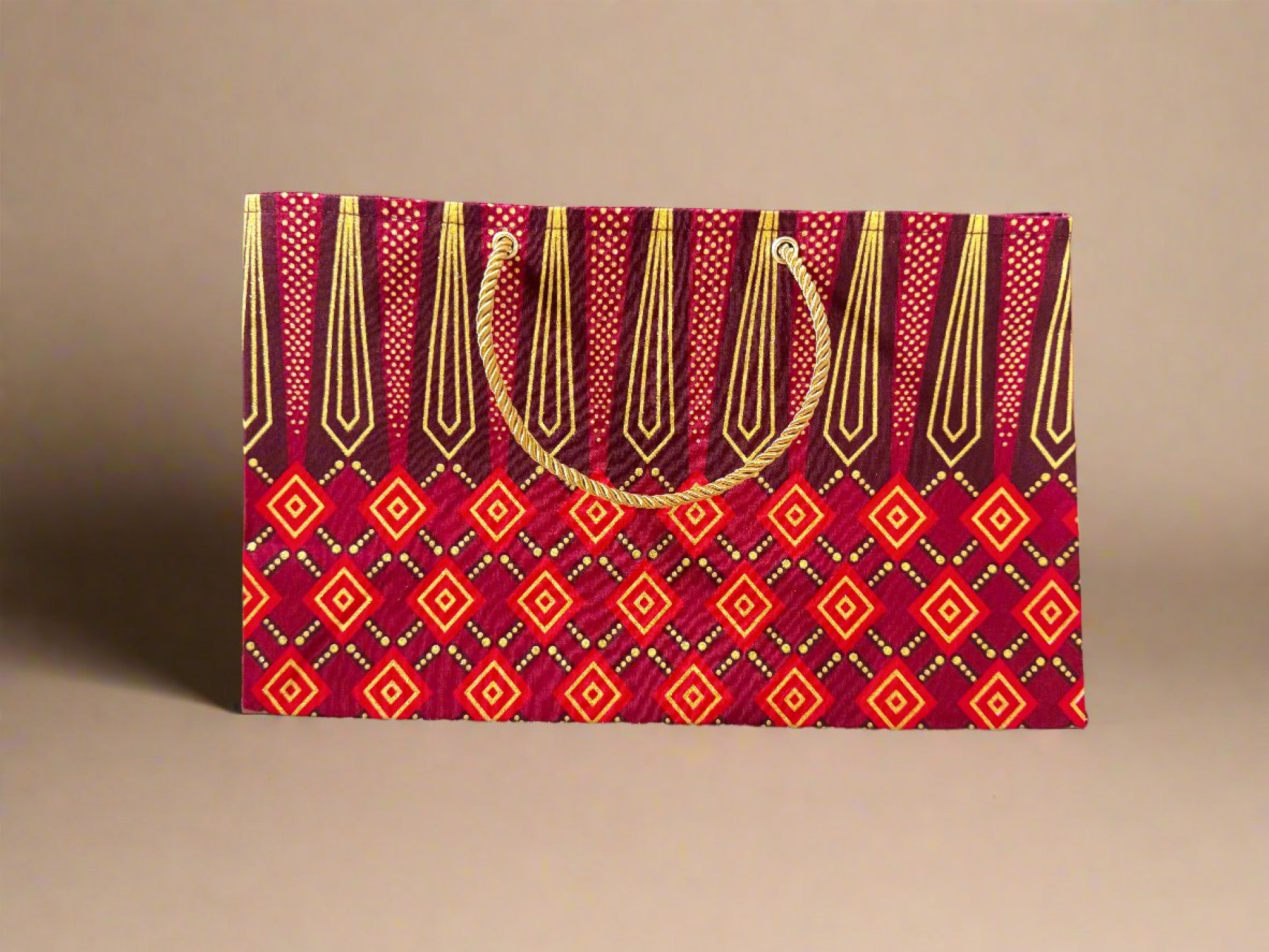 Elevate your gift-giving experience with our Medium Wardrobe Gift Bag  , crafted from vibrant African wax print fabric. Measuring 7.25” x 12.25” x 4.75”, this bag is perfect for clothing, spa sets, or other medium-sized gifts. Each bag is handmade, ensuring it is as unique as the gifts it holds. Reusable and eco-friendly, this bag is ideal for birthdays, anniversaries, holidays, and more, adding cultural sophistication to your presents.