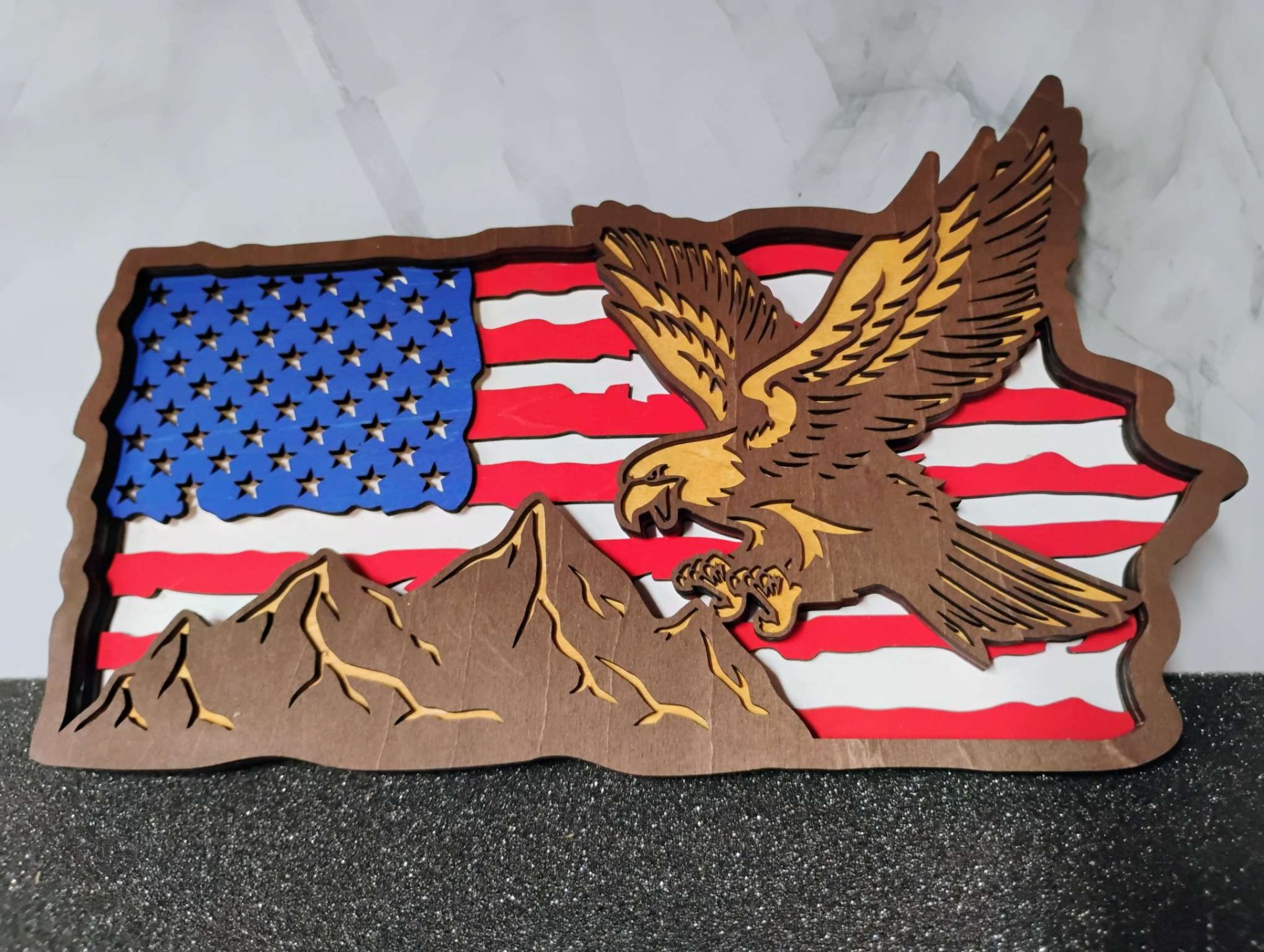 This 6.25x10.5" piece is cut from basswood plywood, each of the 5 layers is individually stained or painted and assembled into this patriotic artwork that's sure to be a conversation starter.