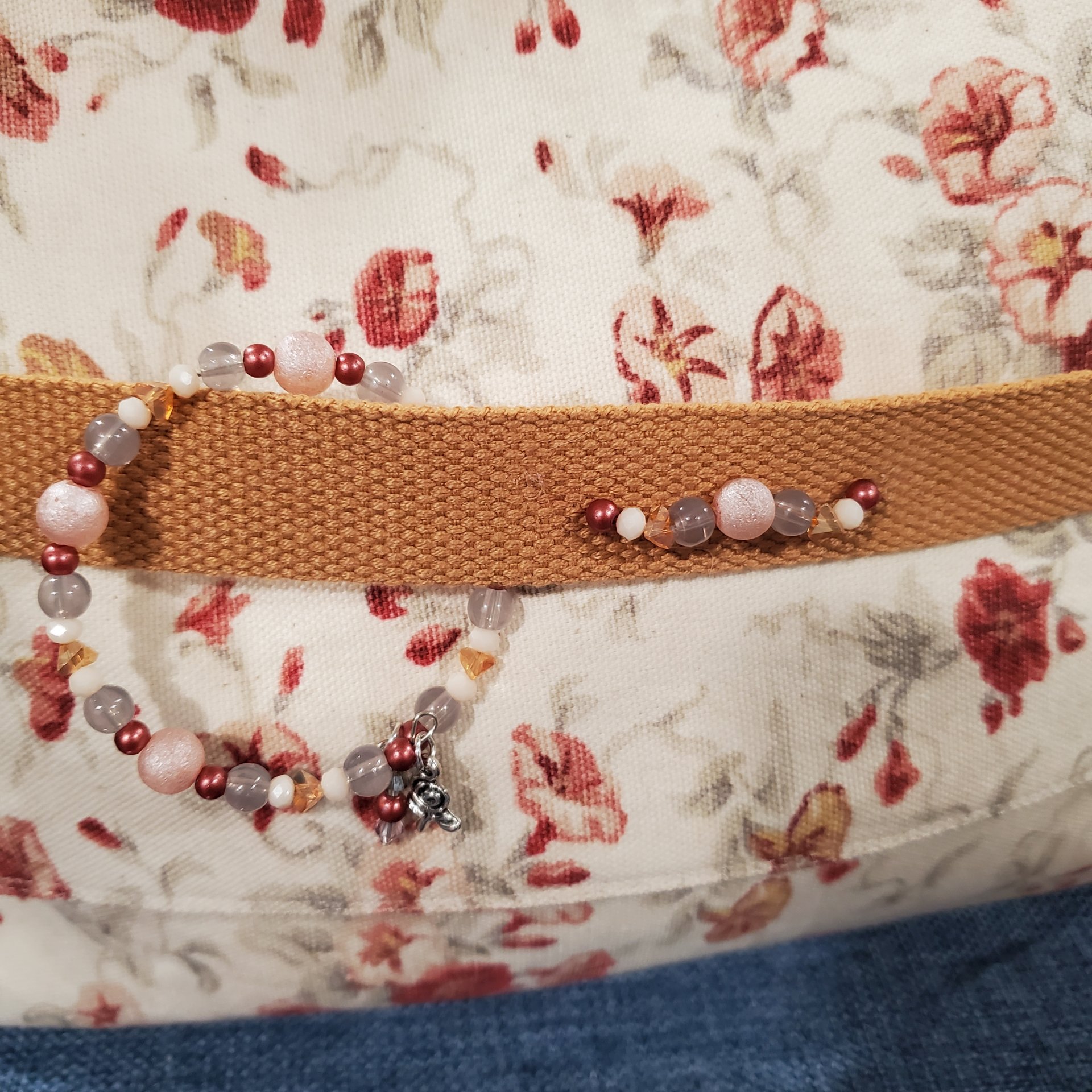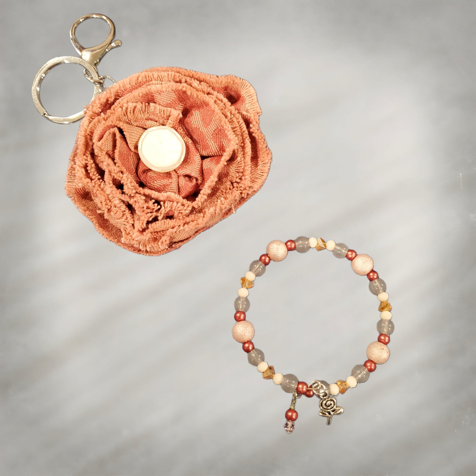 - Coordinating fabric flower keychain/fob with vintage button and silver-tone bracelet
