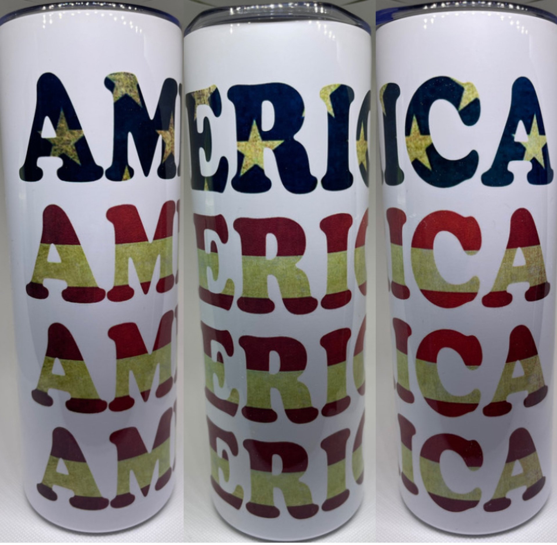 Loud, proud, and unapologetically patriotic — this America Repeat tumbler is a celebration of red, white, and blue in bold vintage style. Featuring stacked “AMERICA” lettering with stars, stripes, and weathered flag texture, it’s perfect for showing off your love of country all year long. From fireworks to cookouts, parades to picnics, this tumbler is ready to keep your drink cool while your American pride stays strong.