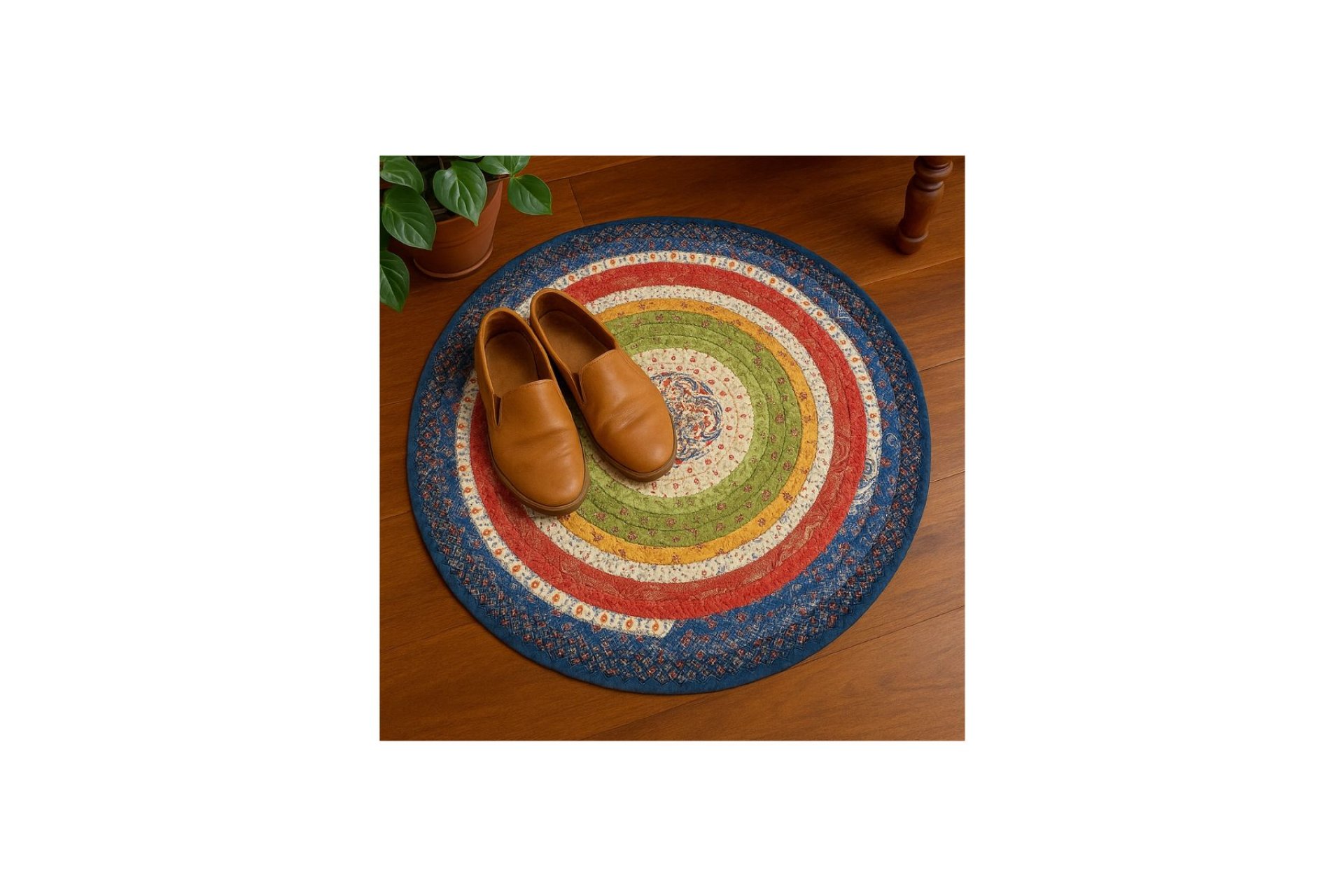 "American in Bloom" is a 26" handmade cotton creation, rich with vintage charm and patriotic flair. Layers of floral prints, paisleys, and gingham's in shades of red, white, blue and olive green evoke the spirit of country summers and cozy front porch sitting. This versatile oval accent works beautifully as a cheerful table topper or a welcoming small rug, perfect for entryways.
