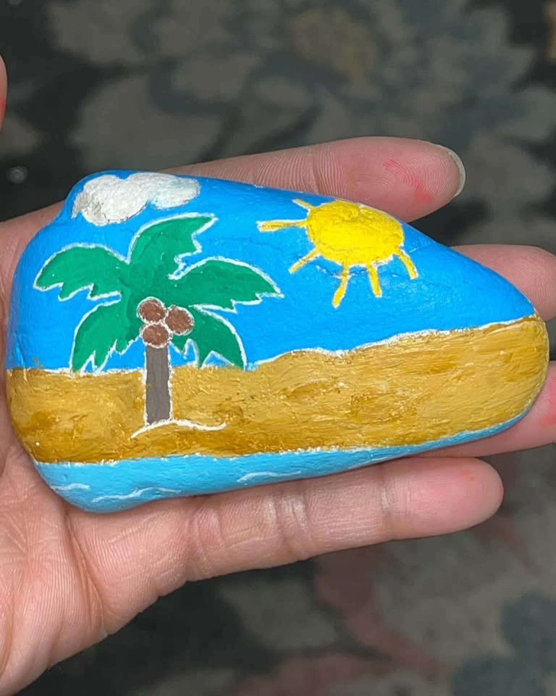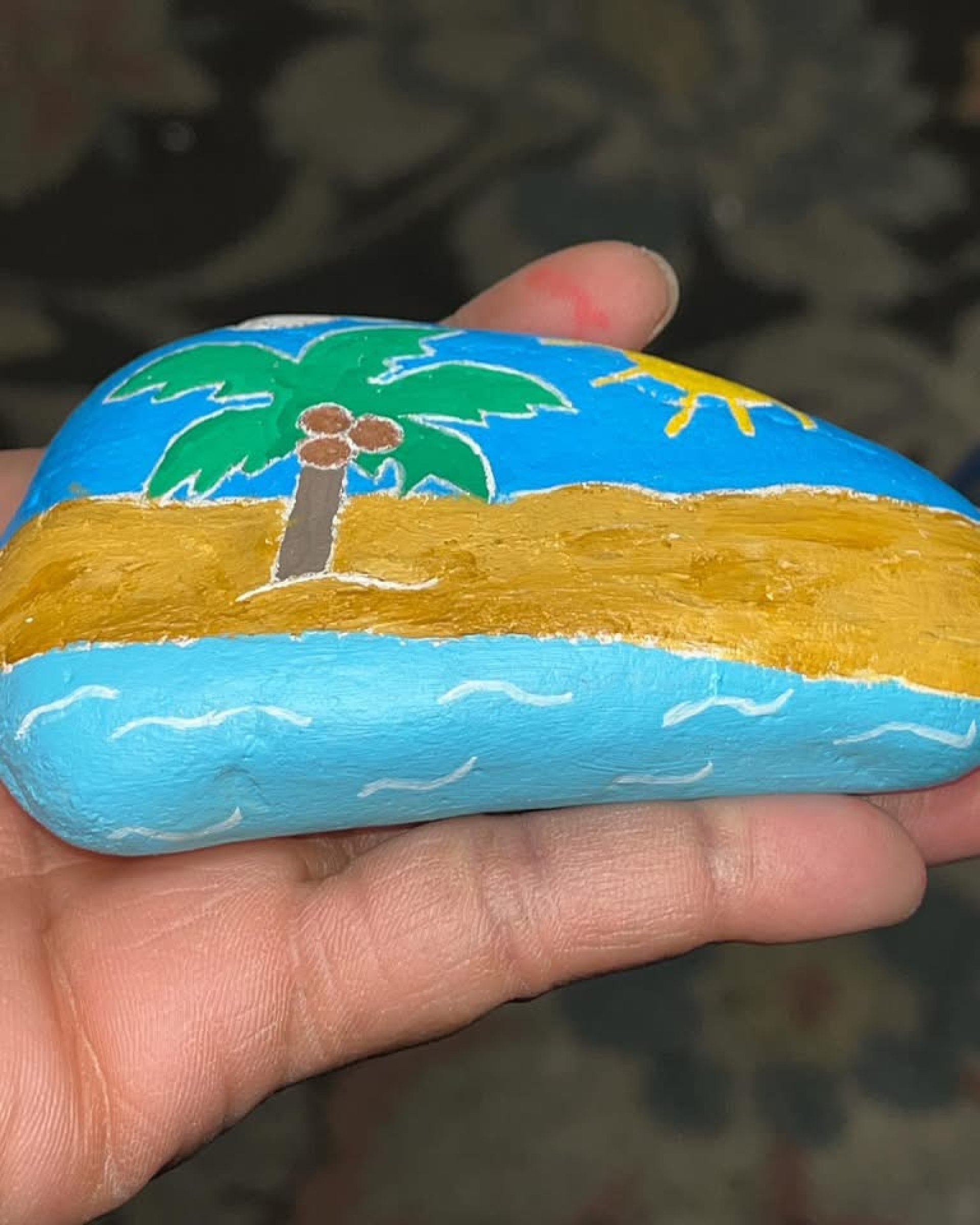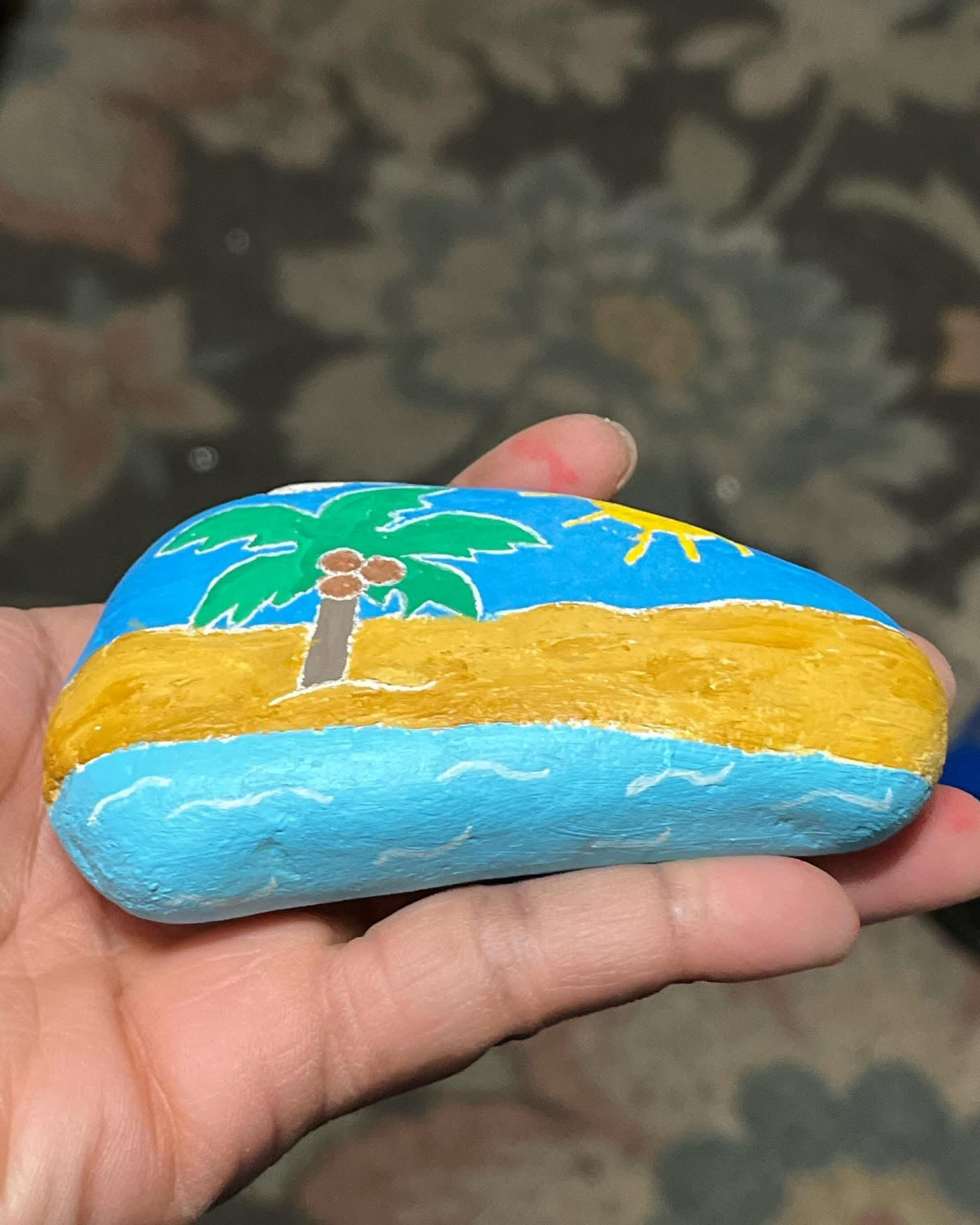 Transform your living space with a touch of coastal charm through our hand-painted beach stone portraits...hand-painted by yours truly, Lovechild! Perfect for both indoor and outdoor settings, these unique art pieces are crafted specifically for beach lovers who want to bring the essence of the shoreline into their homes. Please allow up to 1 week of production time before it is shipped. Each stone is carefully painted, capturing the beauty of ocean life and landscapes in vibrant colors, making them ideal for decorating gardens, patios, or your cozy beach-themed interior. These eye-catching portraits not only serve as stunning decor but also evoke memories of sun-soaked days and the soothing sounds of waves. Each random shaped stone is about 2.75" x 4.5" long and 0.75" thick. Whether you're looking for a thoughtful gift or a personal treasure, our beach stone portraits are a delightful way to celebrate your love for the sea. Embrace the spirit of the beach and let these enchanting pieces of Lovechild's Lovely Creations add a refreshing touch to your surroundings.