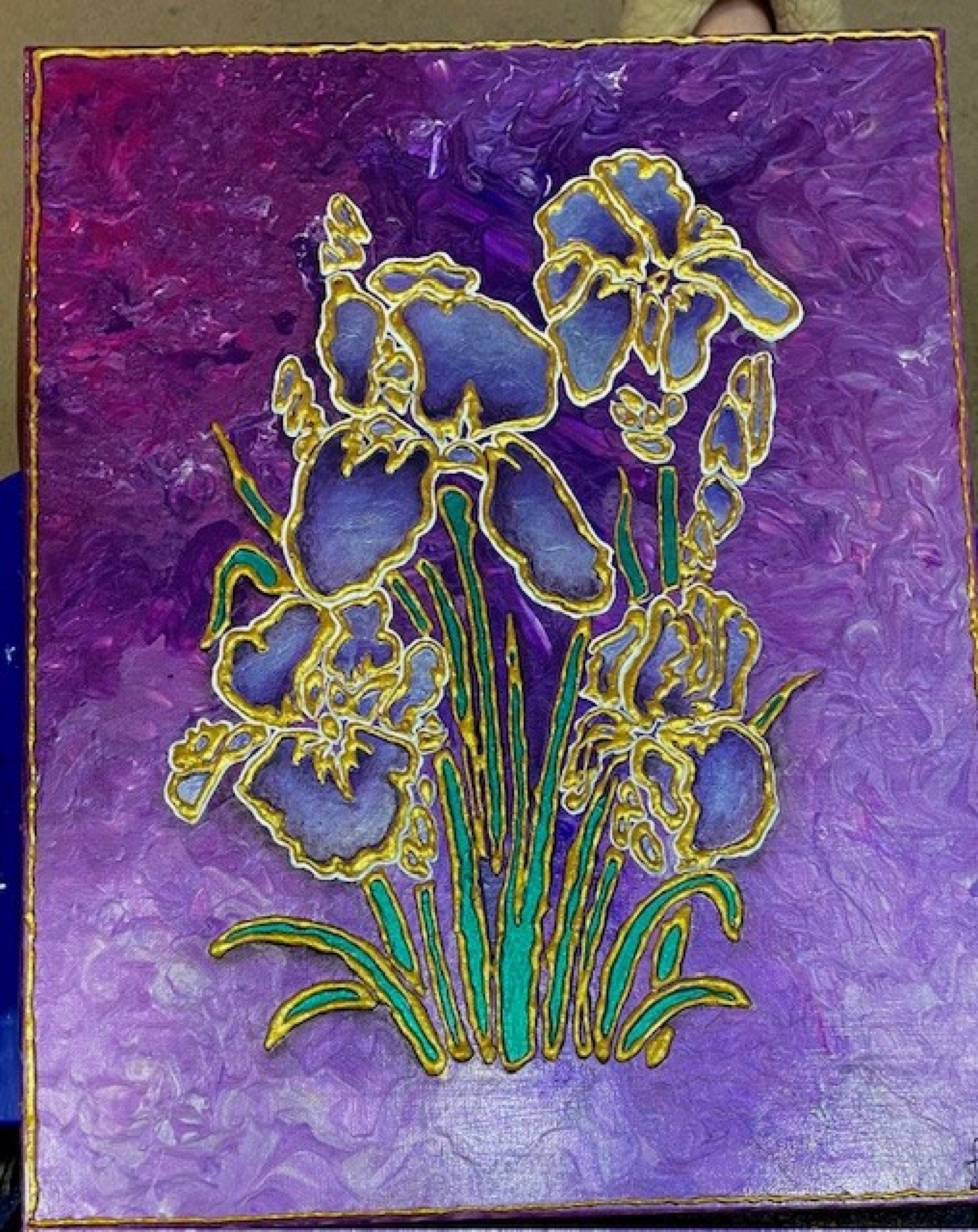 This piece is offered as a special request commissioned piece. This was a commissioned piece that has sold. If interested, please reach out to me to discuss the details of what might be of interest to you. My mom's garden always included tons of irises in every color you could imagine. It was her favorite flower, and it brought me great joy to create this piece for an older neighbor lady who shared the same love for this beautiful flower. After settling on the background color, I used a hot glue gun to create the outlines for each flower. I then carefully painted and shaded each crevice and outline. The picture shown measures 24" x 32". The final step included adding a high gloss sealant.
