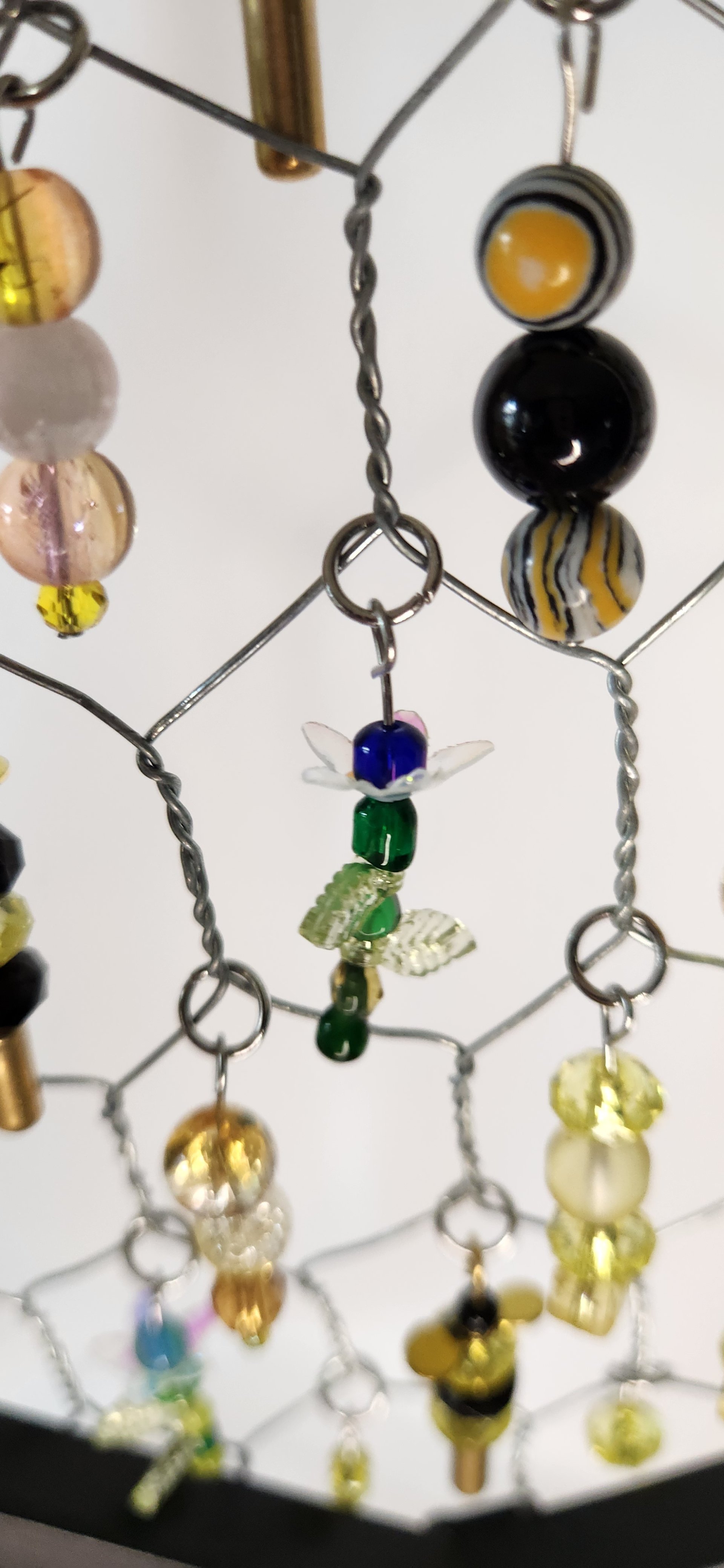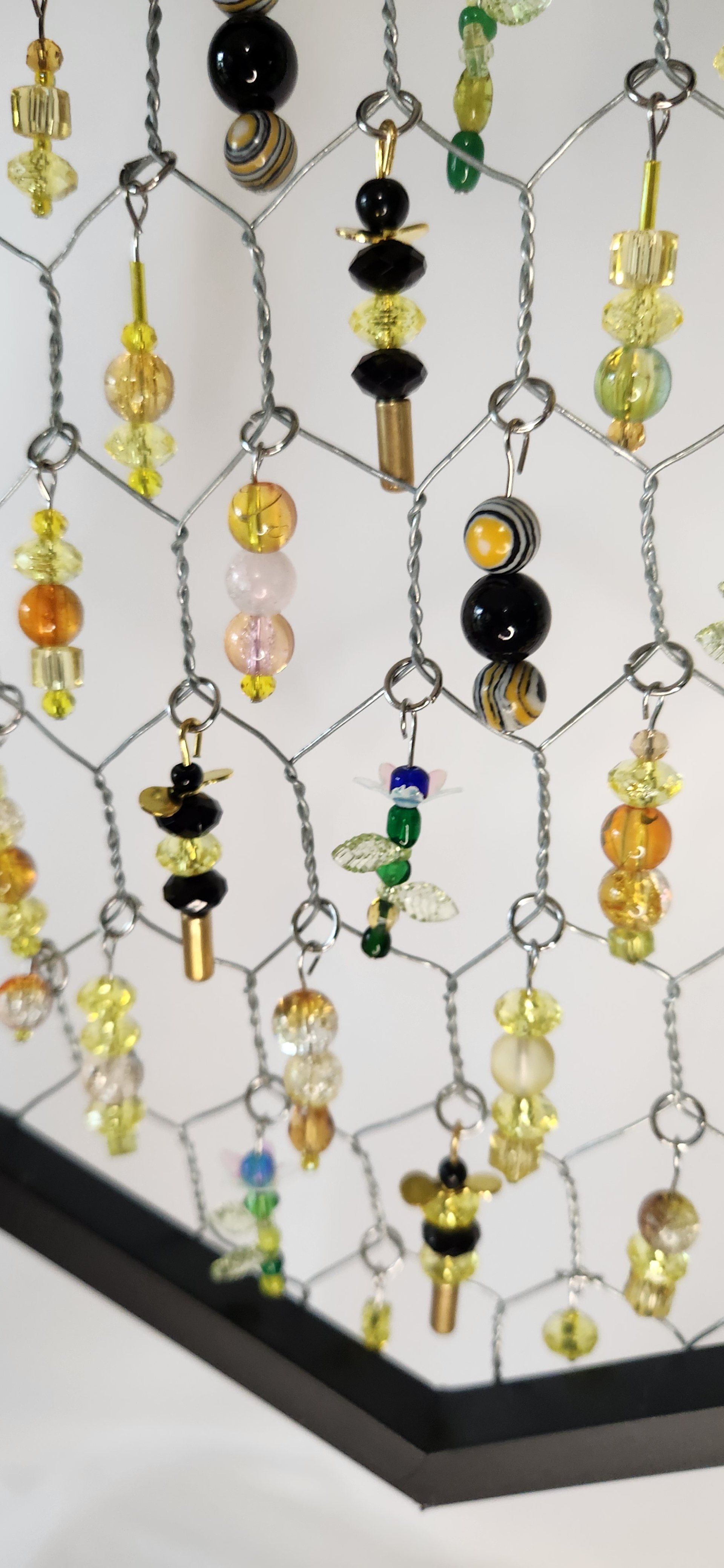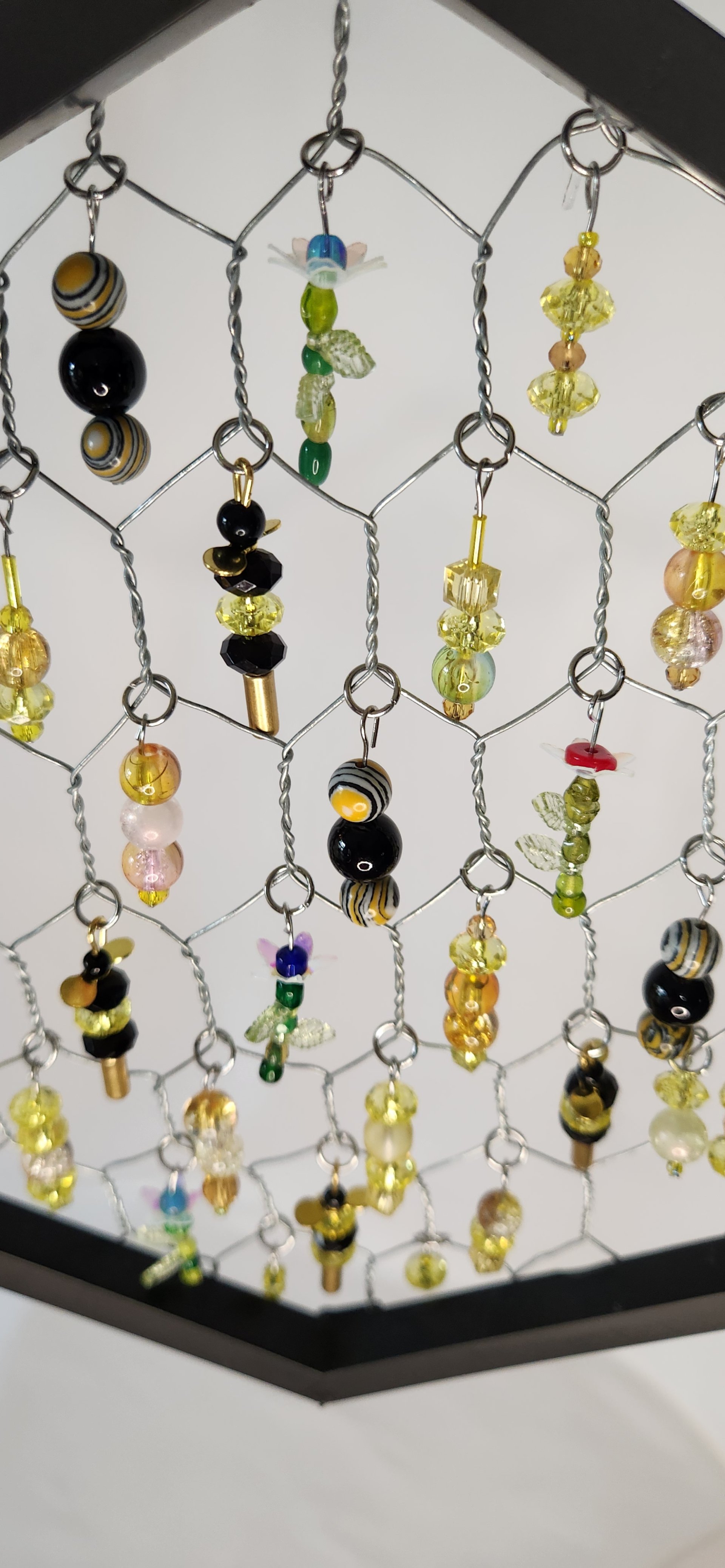 Oh, this piece is absolutely breathtaking! It's simply bee-utiful! Picture an octagon frame, wrapped in delicate chicken wire and embellished with beads that glisten and shine in the sunlight. Each bead is a masterpiece in itself - some resembling delicate flowers, while others take on the appearance of mesmerizing wings, much like those of bees. This creation is truly a work of art that stirs the soul and ignites a fire in the heart. It's a sight to behold, a true masterpiece that captures the essence of beauty and grace.