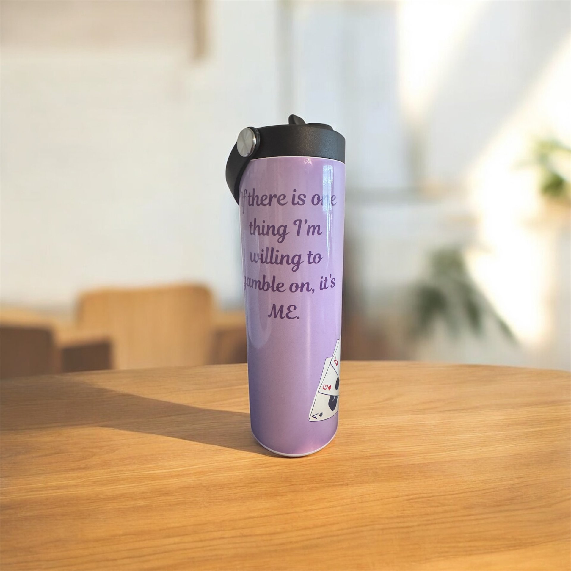 This eye-catching purple water bottle pairs a clean, modern design with a motivating message: “If there is one thing I’m willing to gamble on, it’s ME.” Perfect for hustlers, dreamers, gamers, poker lovers, and anyone building a life they refuse to play small in.