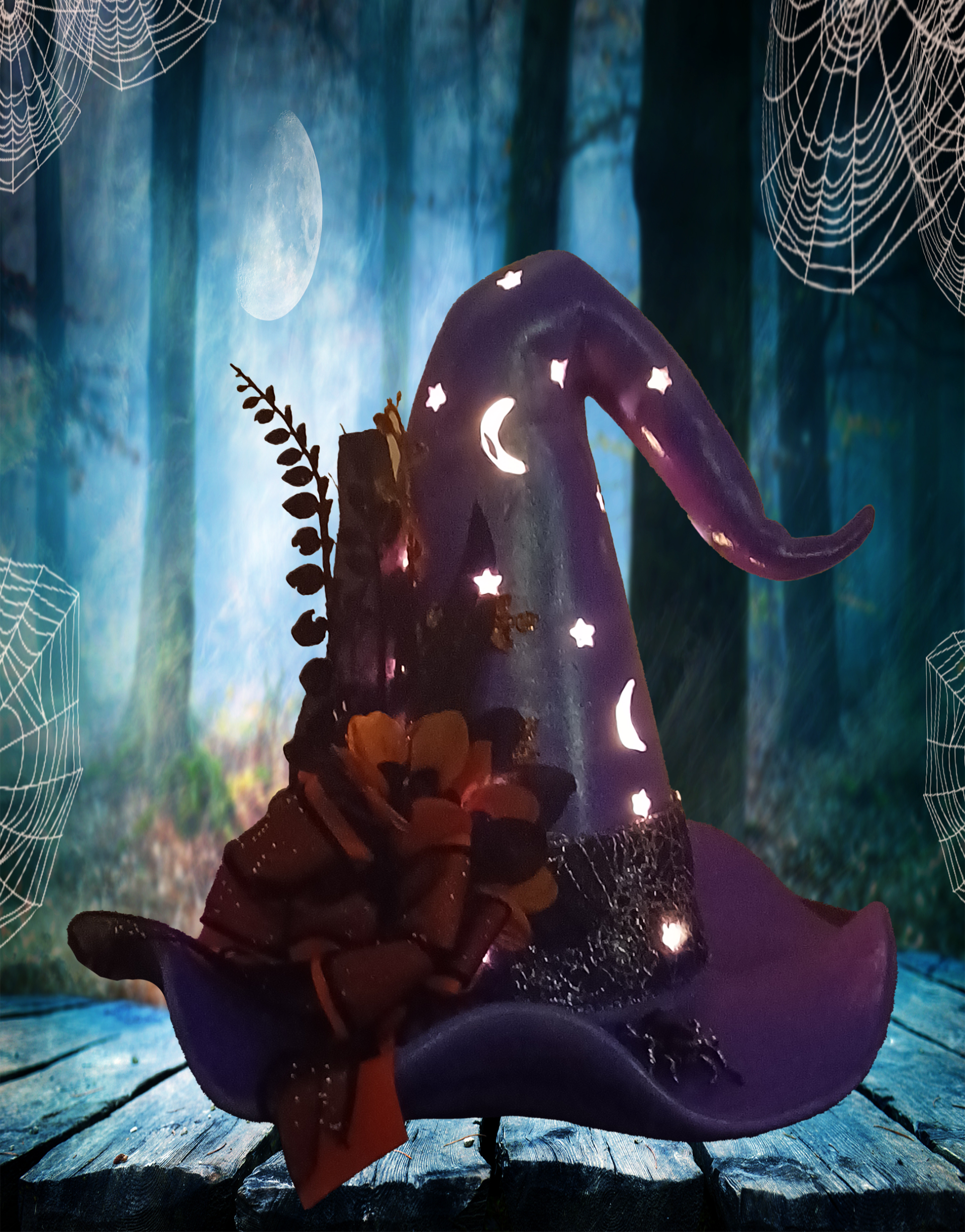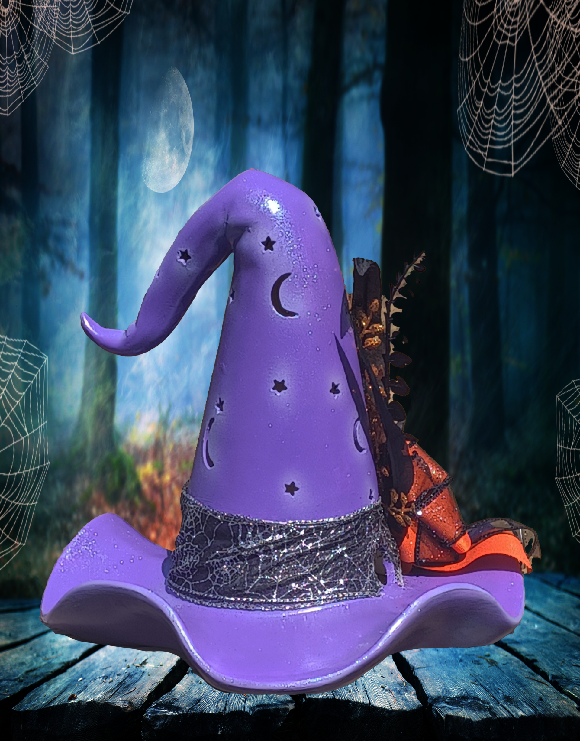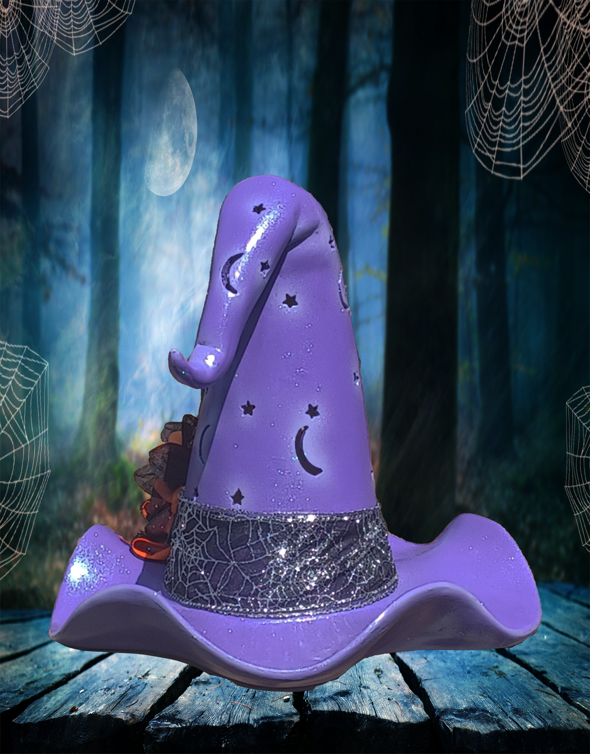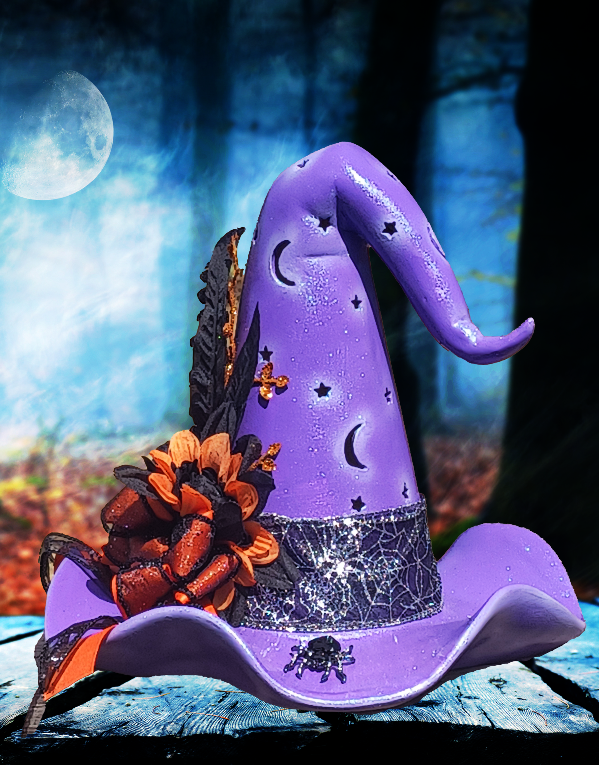 a mystical purple witch's hat adorned with a stunning floral arrangement and a sparkling jeweled spider on the brim. This elegant piece adds a touch of magical charm and spooky sophistication to your Halloween décor!
