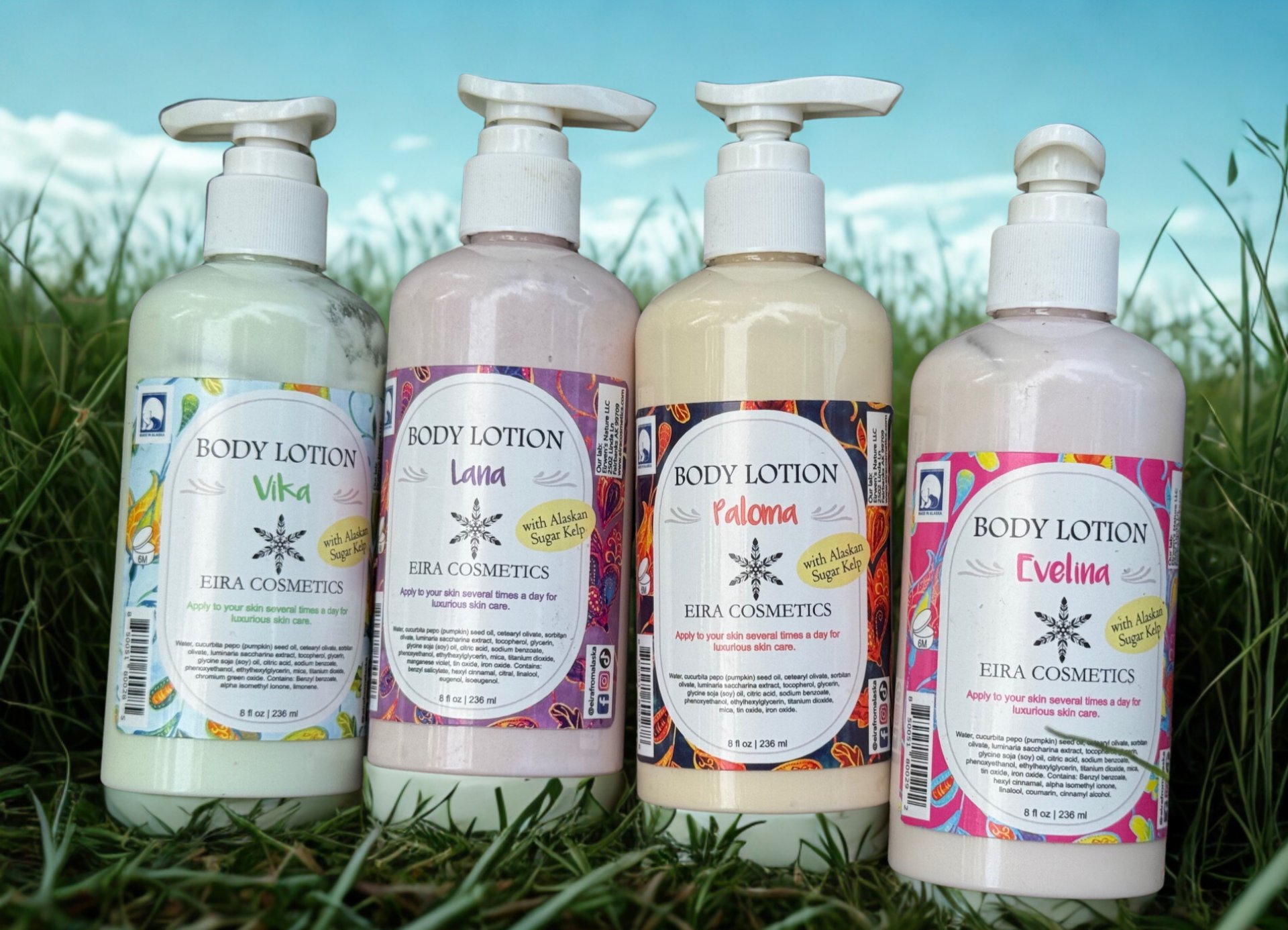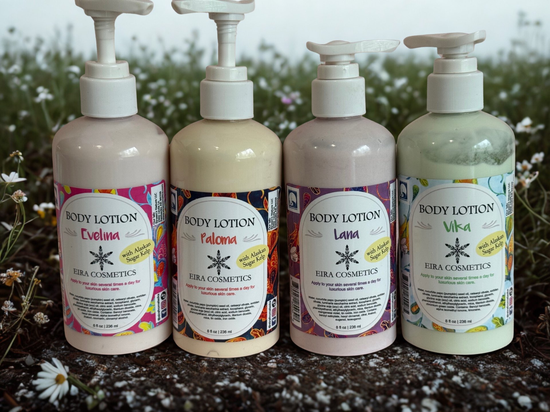 Your Skin, Your Scent, Your Mood. Meet the Eira Cosmetics body lotion collection—where serious hydration meets a personalized fragrance experience. Dive into four distinct scents crafted to become your daily dose of self-expression: Paloma, Vika, Lana, and Evelina. Hydration, Perfected. We’ve bottled a powerful duo for your skin: Sugar Kelp for a deep-dose of moisture that leaves skin feeling velvety-smooth, and soothing Pumpkin Seed Oil to comfort and calm. It’s the luxurious feel you crave, with the skincare your skin deserves. Which Scent is You Today? Evelina: For Your Calm. Unwind with the tranquil blend of cherry blossom, white lily, and vanilla. Pure serenity.