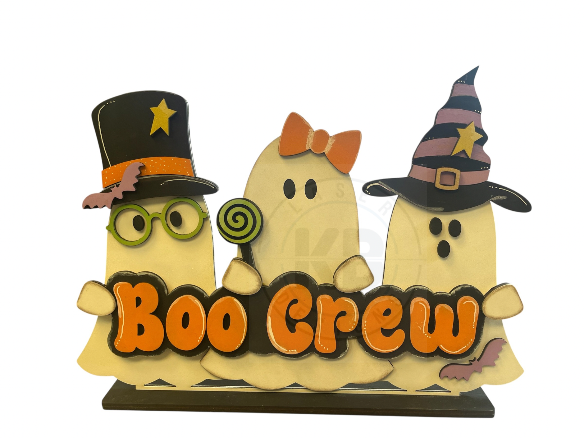Bring a dash of charm (and just the right amount of spook) to your Halloween décor with this adorable Boo Crew Ghost Shelf Sitter. Featuring ghosts dressed in festive costumes - a top hat with glasses, a sweet bow, and a stripped witch hat - this piece is full of personality. The bright "Boo Crew" lettering pops in vibrant orange against a classic black border, while playful details like a lollipop and bats add extra seasonal fun.