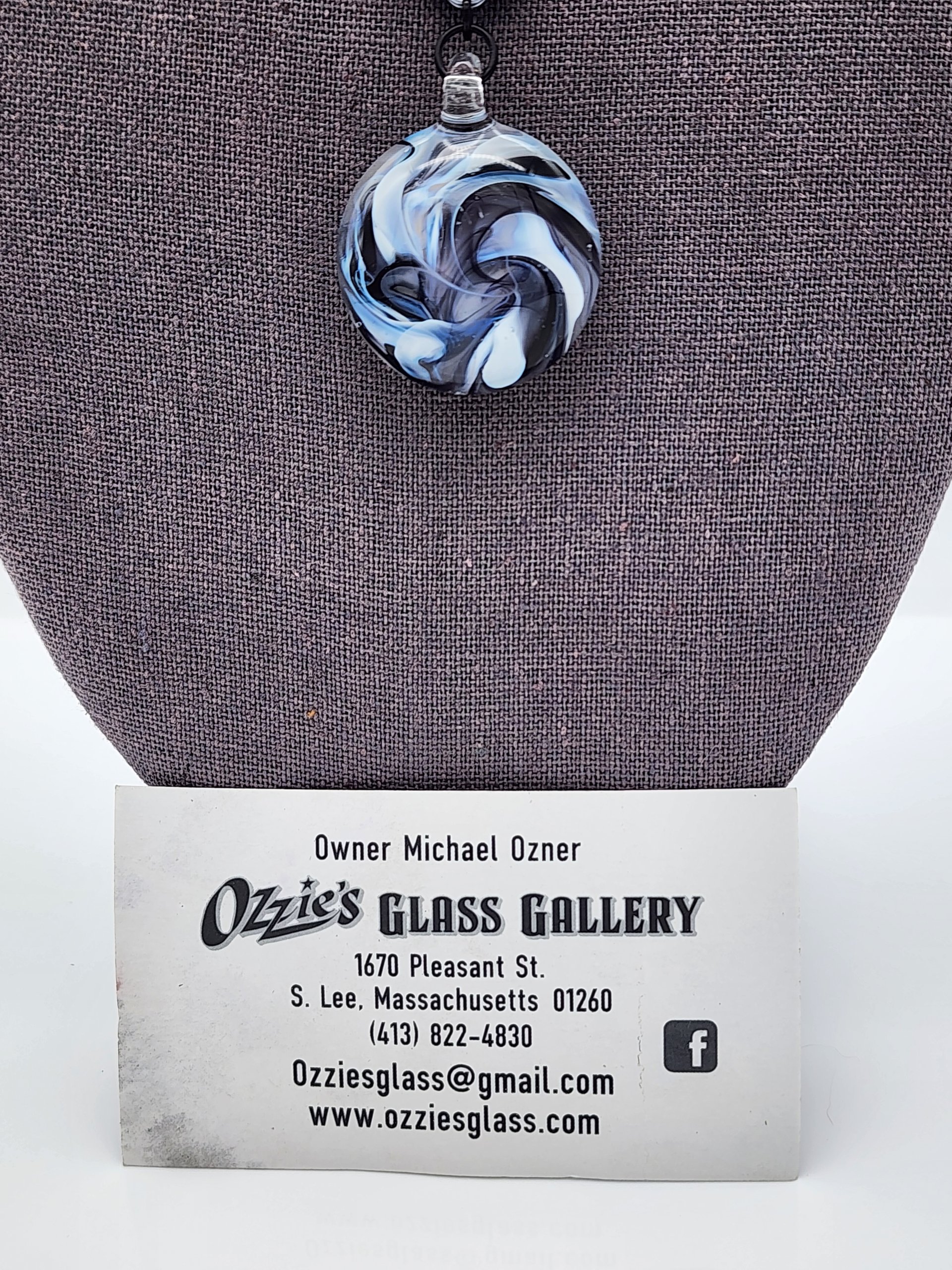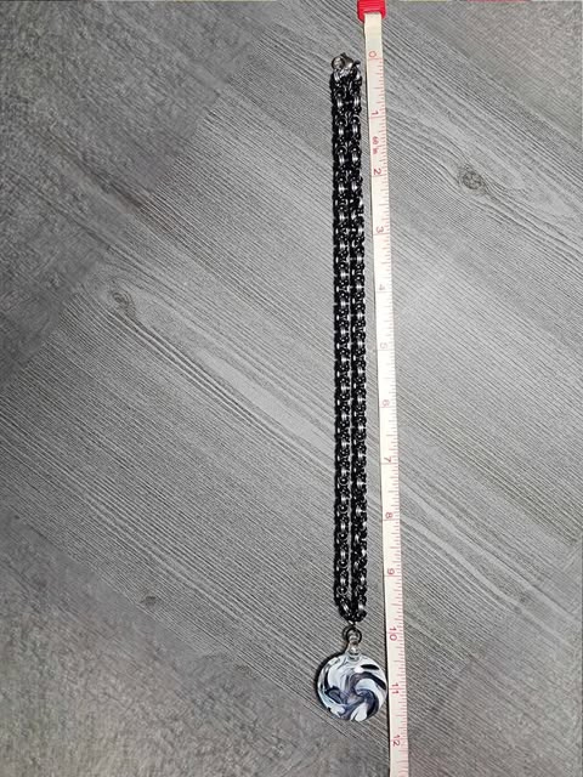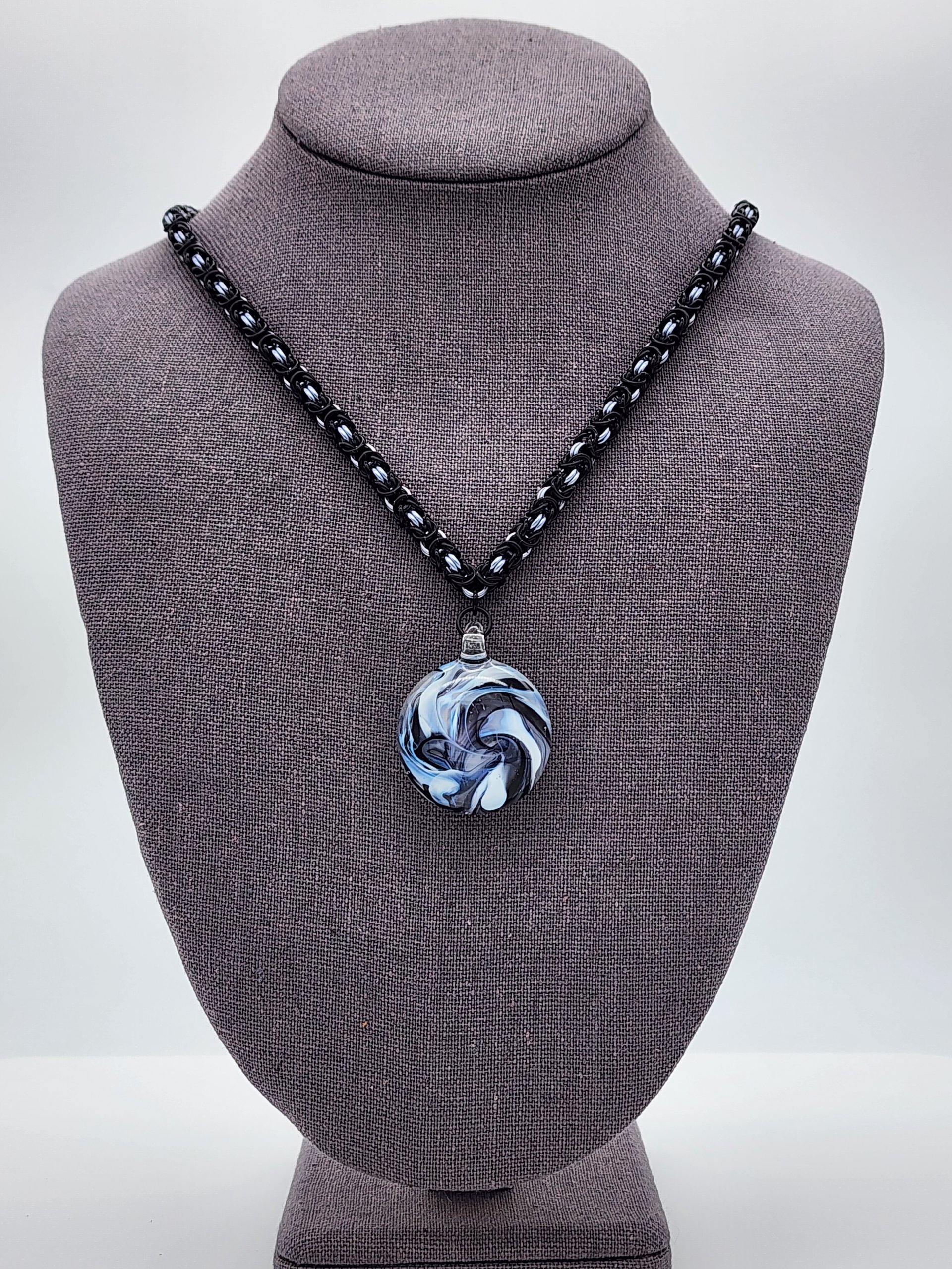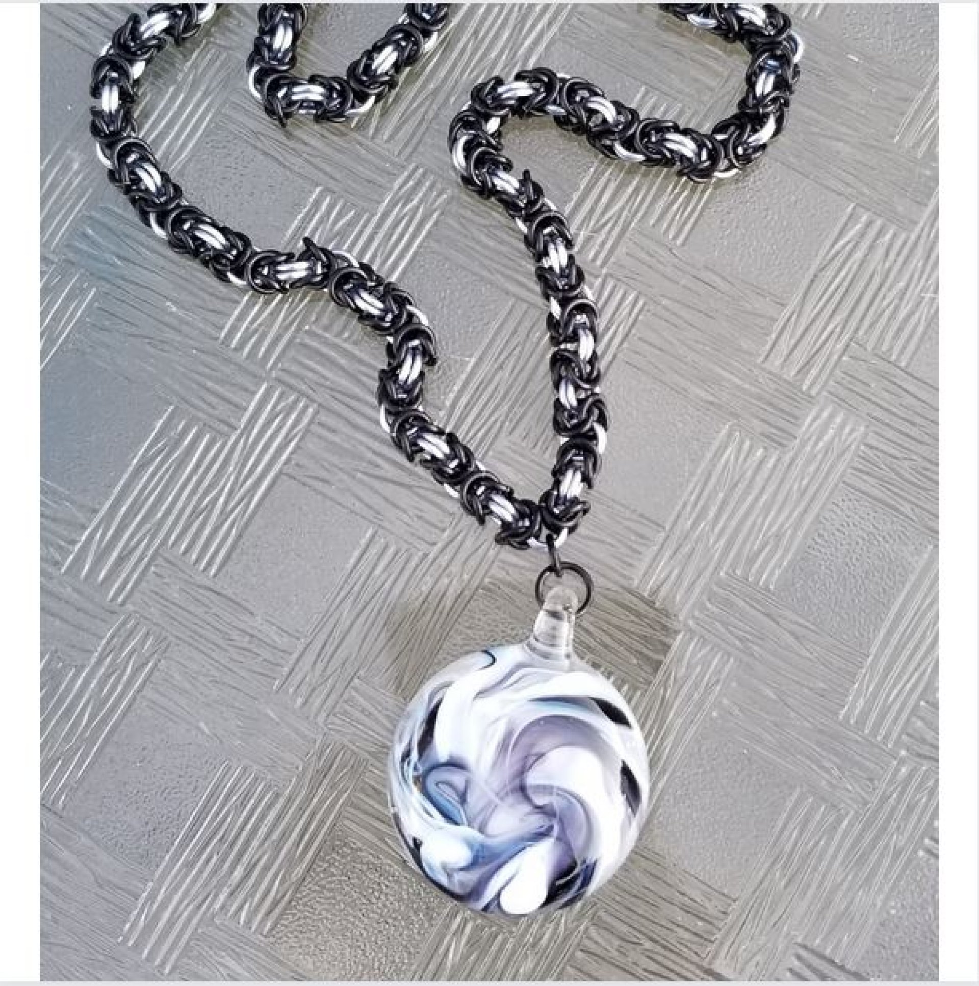 Elevate your style with this exquisite Byzantine weave necklace, crafted from anodized aluminum. Featuring a unique, handmade glass focal piece from Ozzie's Glass Gallery in Lee, MA, this one-of-a-kind creation is a true statement piece!