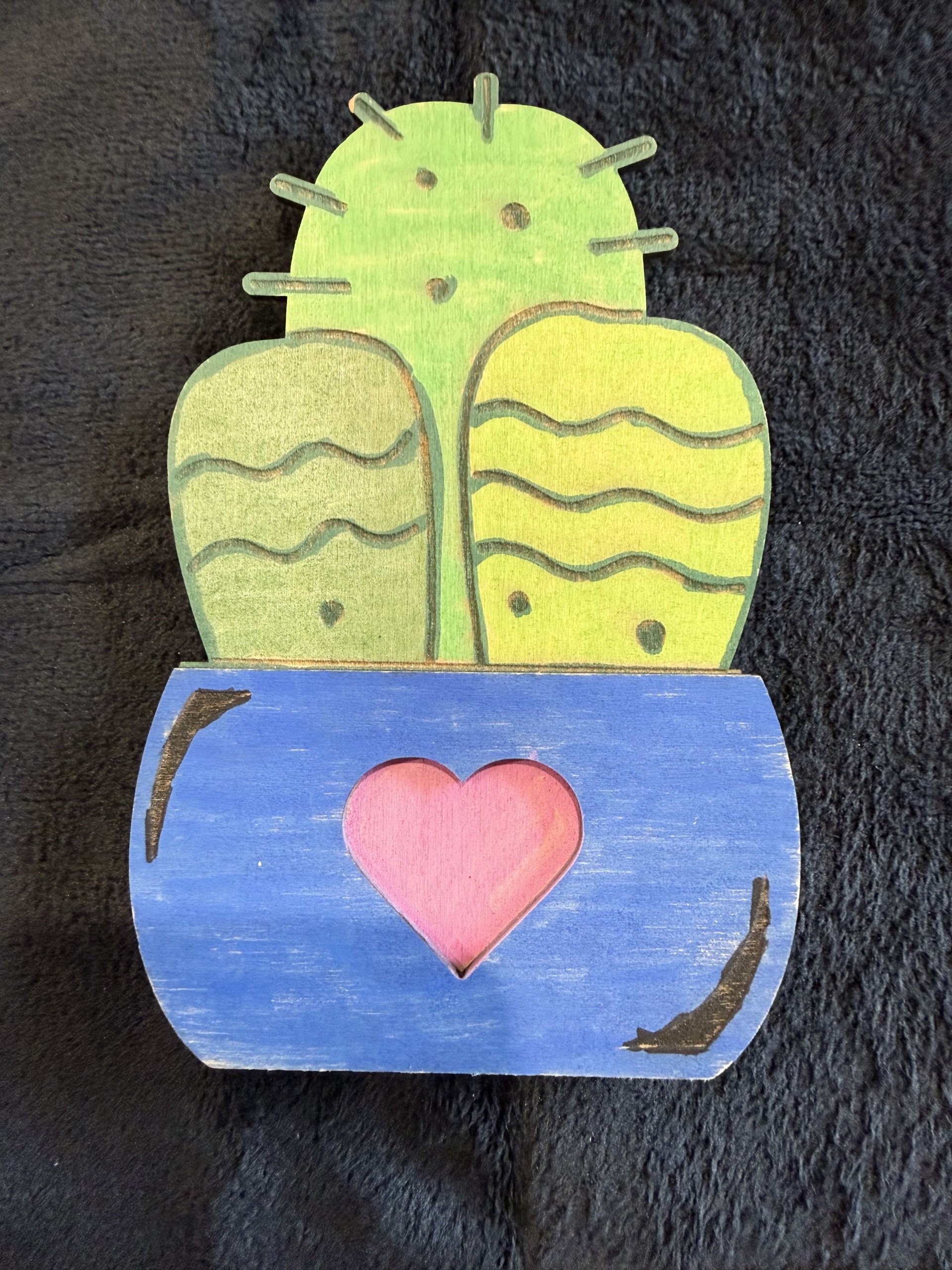 Featuring three stylized, hand-painted cacti nestled in a cheerful blue pot with a pink heart cutout, this design is perfect for any occasion. But the real surprise? A hidden slot on the back holds a standard-sized gift card—making it a keepsake and a clever delivery method in one.