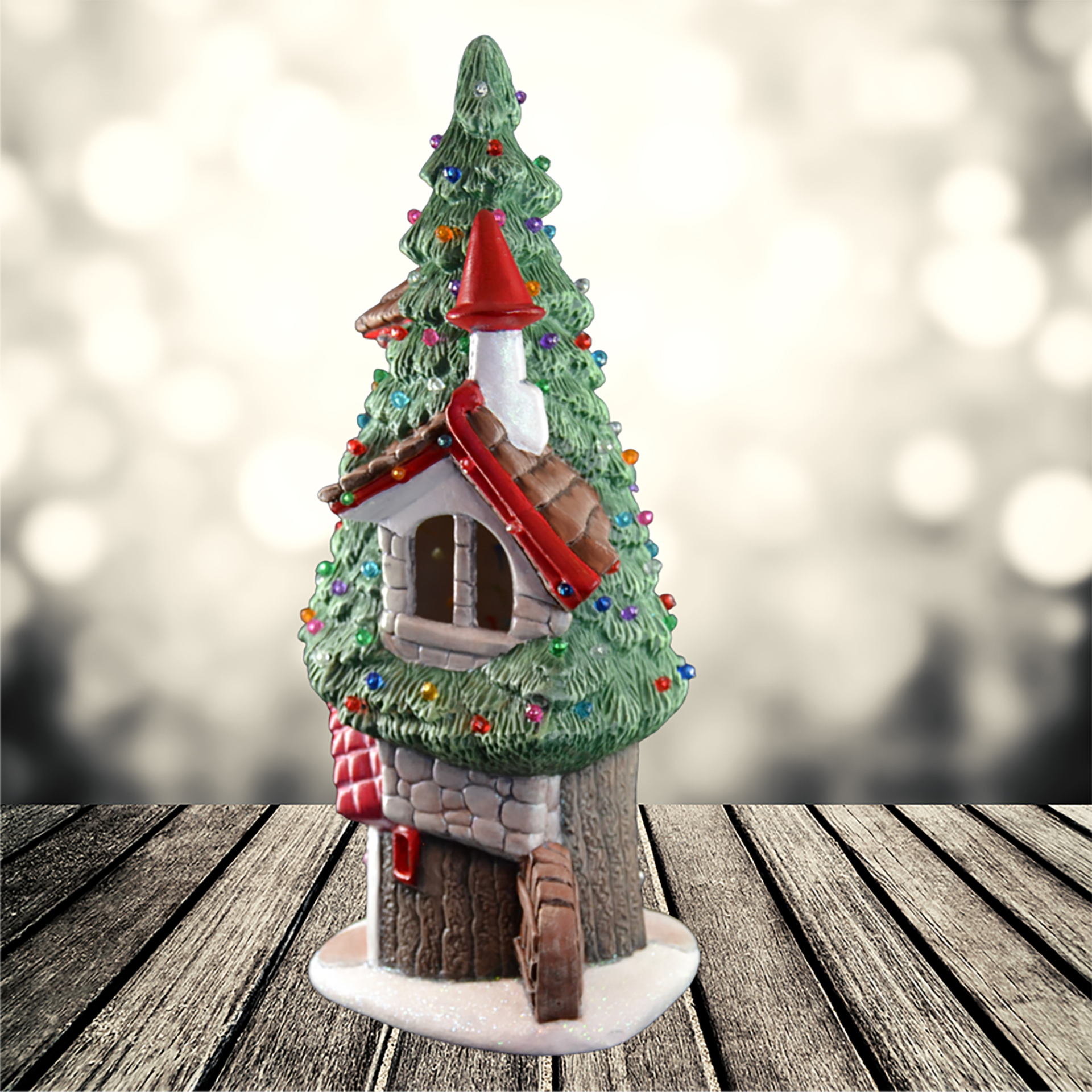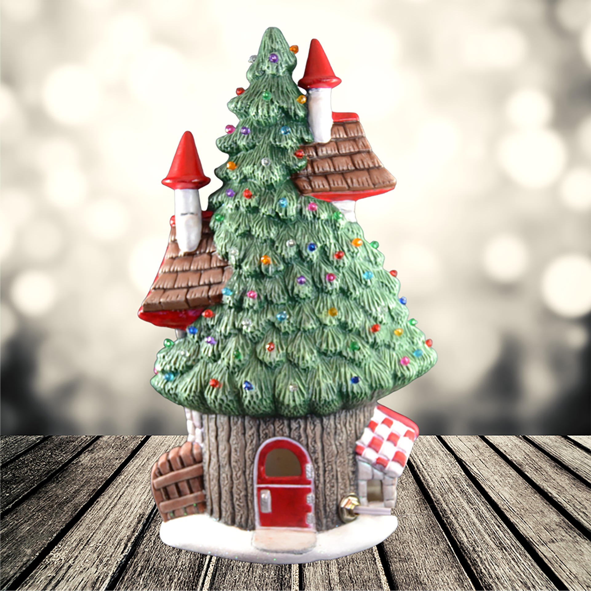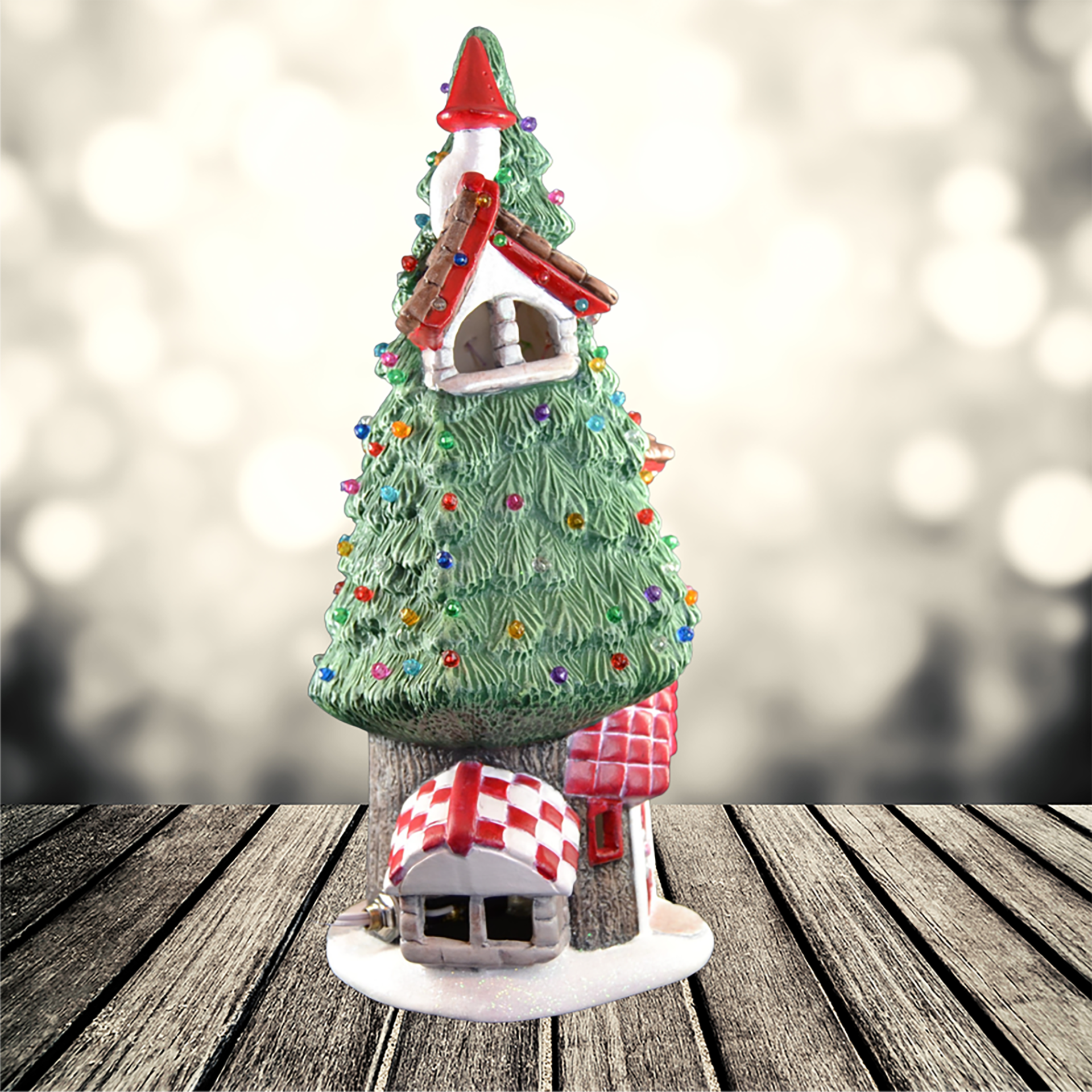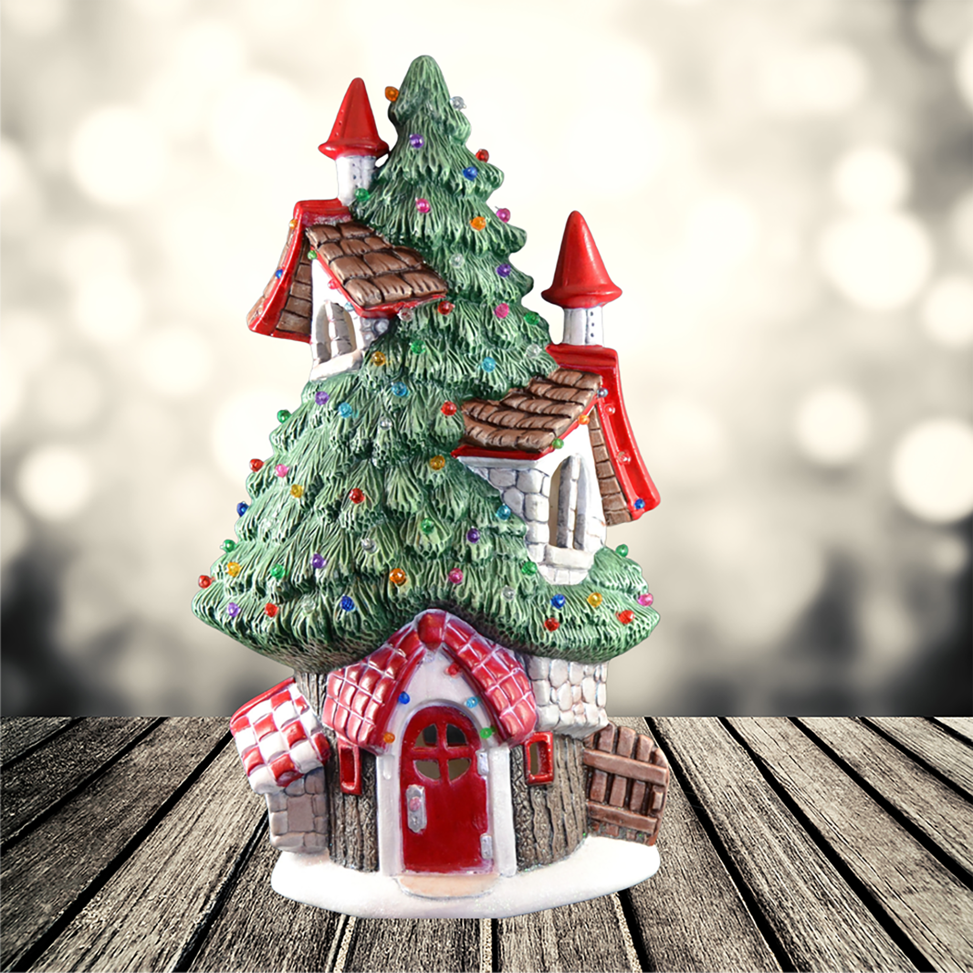 a delightful ceramic piece featuring a whimsical tree house made entirely of candy canes and peppermint accents. This festive decoration brings a sweet and magical touch to your holiday décor, perfect for adding a playful, Christmassy charm to any space!