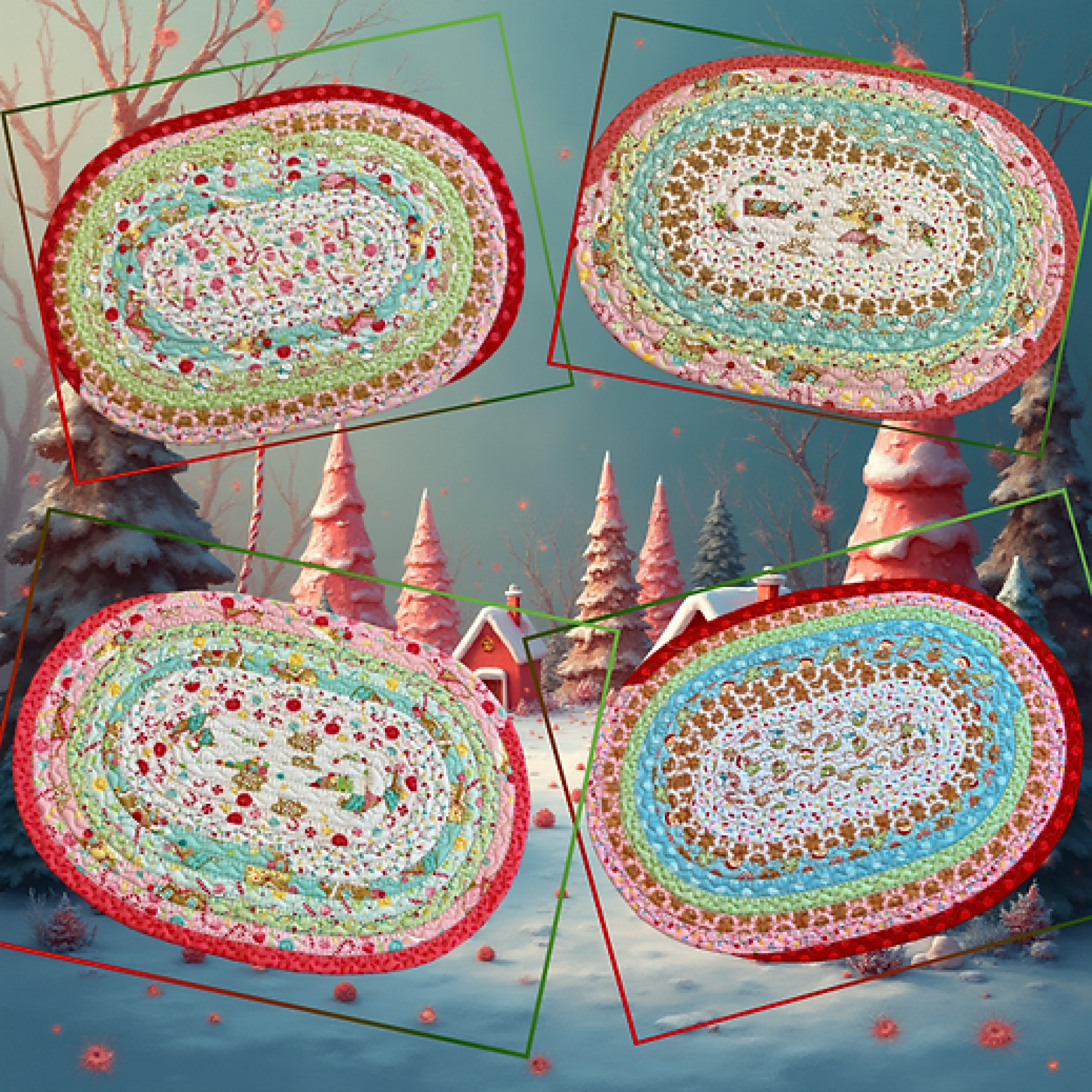 Candyland Christmas Placemats are a delightful set of handcrafted oval placemats bursting with festive charm. Each mat is created using a cheerful mix of peppermint swirls, gingerbread friends, gumdrops, candy canes, and pastel holiday prints. The layered, quilted design creates a beautiful effect, adding texture, durability, and irresistible whimsy to your holiday table. Vibrant shades of pink, mint, red, and aqua come together to create a sweet, nostalgic Christmas look that’s perfect for family gatherings, holiday parties, or simply adding joy to your everyday décor. These placemats are not only decorative but also soft, sturdy, and wonderfully unique—sure to become a favorite part of your seasonal traditions.