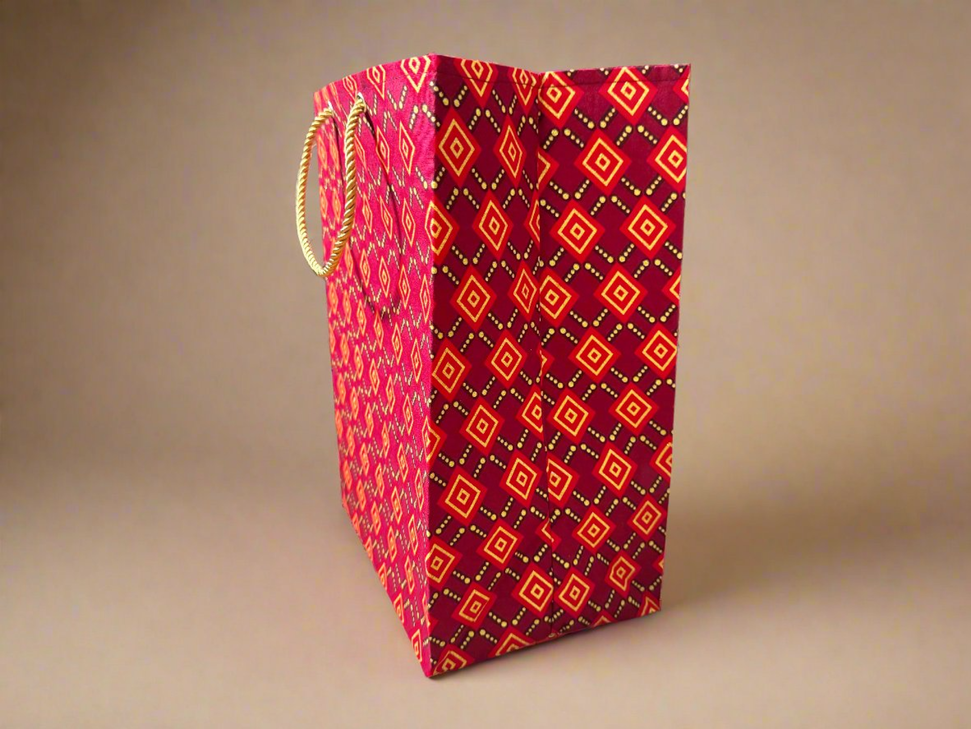 MEB100148 - Chic, Fabric, Handmade Medium Square Gift Bag Red and Maroon with Gold Accents
