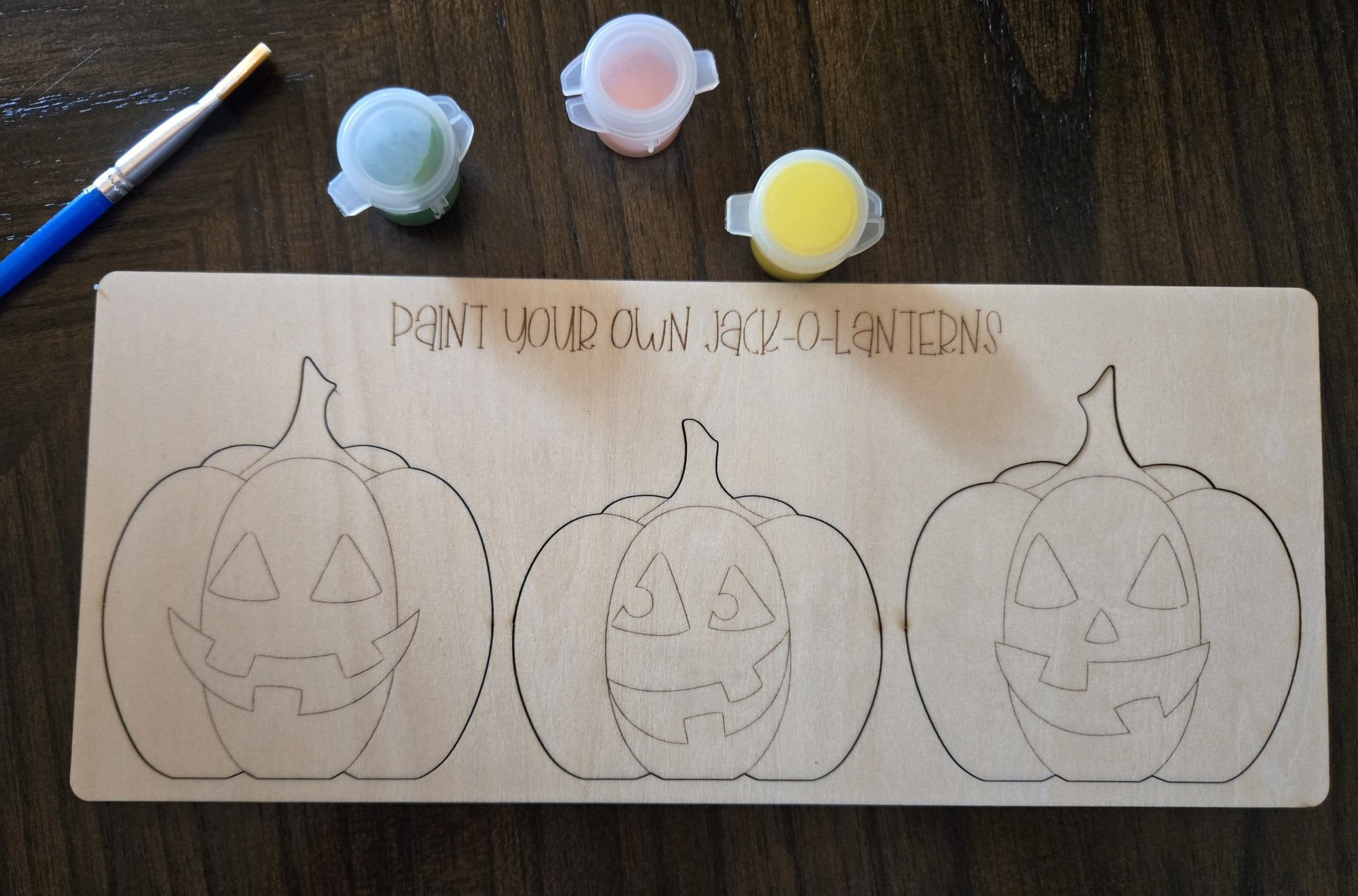 Each kit includes three wooden jack-o'-lantern cutouts, a set of paints, and a paintbrush.