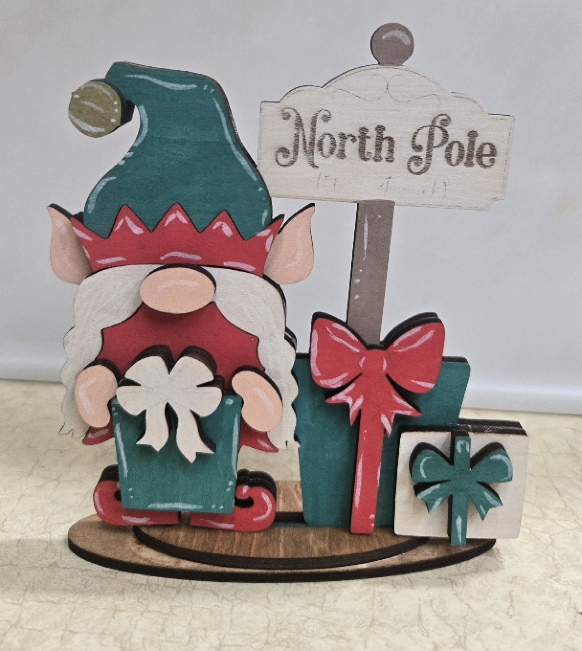Looking for a unique, handcrafted holiday accent? This festive elf gnome, complete with a tiny North Pole sign and presents, is cut with a laser saw for perfect precision and handpainted for a charming, personal touch.