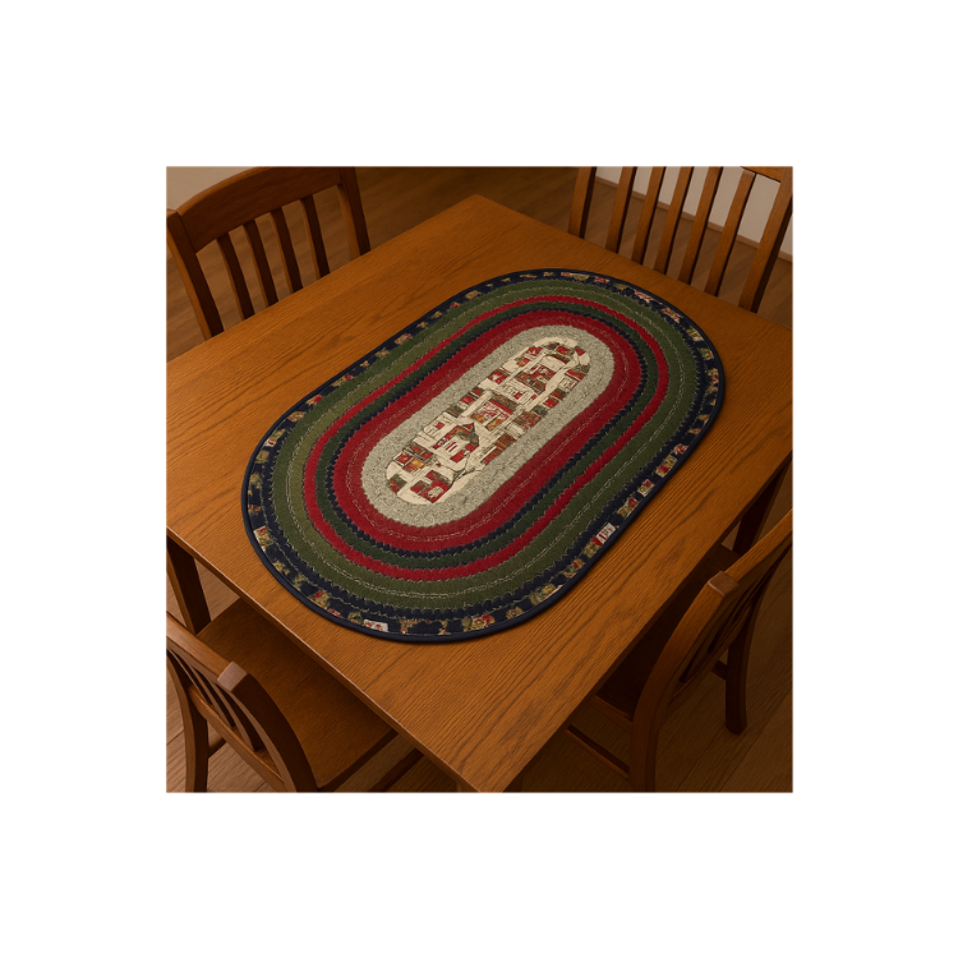 The “Christmas Shopping” table runner is a charming, handcrafted piece measuring 33" x 18", designed in a classic oval shape. Its layered, quilted construction features beautifully coordinated fabrics in deep holiday greens, rich reds, warm creams, and festive prints. At the heart of the runner are whimsical Christmas village shoppe motifs—tiny storefronts, candy stripes, wreaths, and snowy details—creating a cozy, storybook feel. Radiating outward, the runner transitions through textured patterns of pine-needle prints, holly greens, and bold reds, all stitched together with decorative zig-zag quilting that adds depth and movement. The outer border showcases a blend of woodland scenes and festive accents, tying the entire piece together with a traditional holiday charm. Perfect for a dining table, sideboard or even a small entryway rug, this runner brings the nostalgic magic of a bustling Christmas village right into the home—warm, inviting, and full of seasonal character.