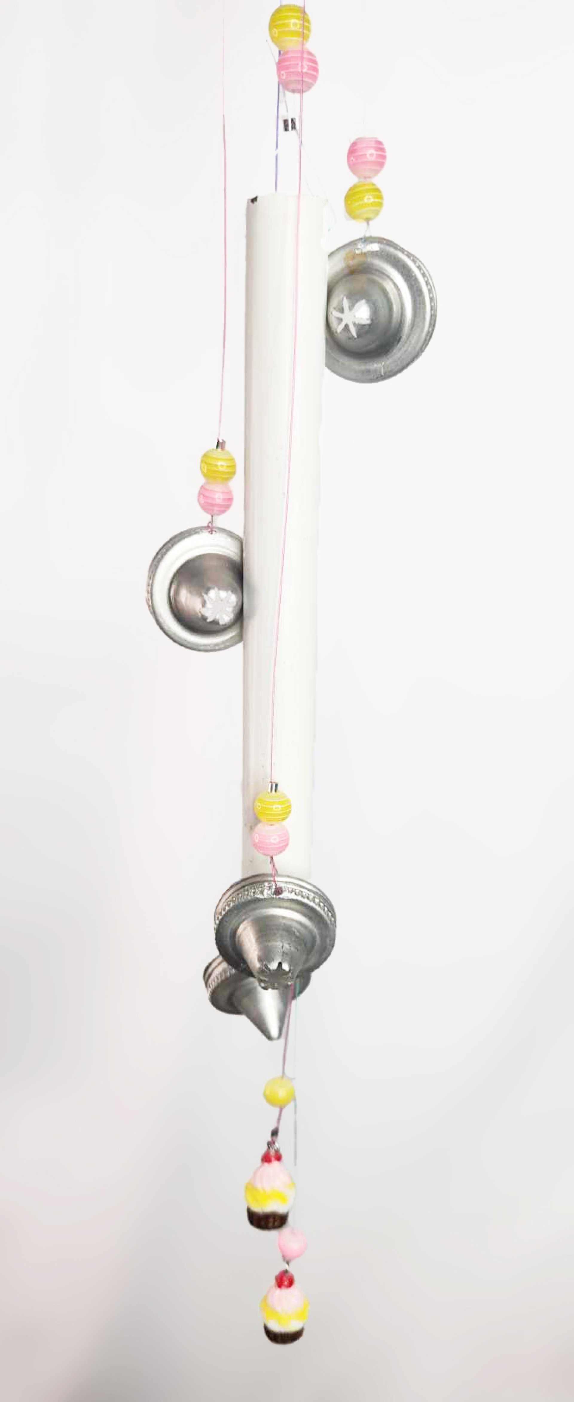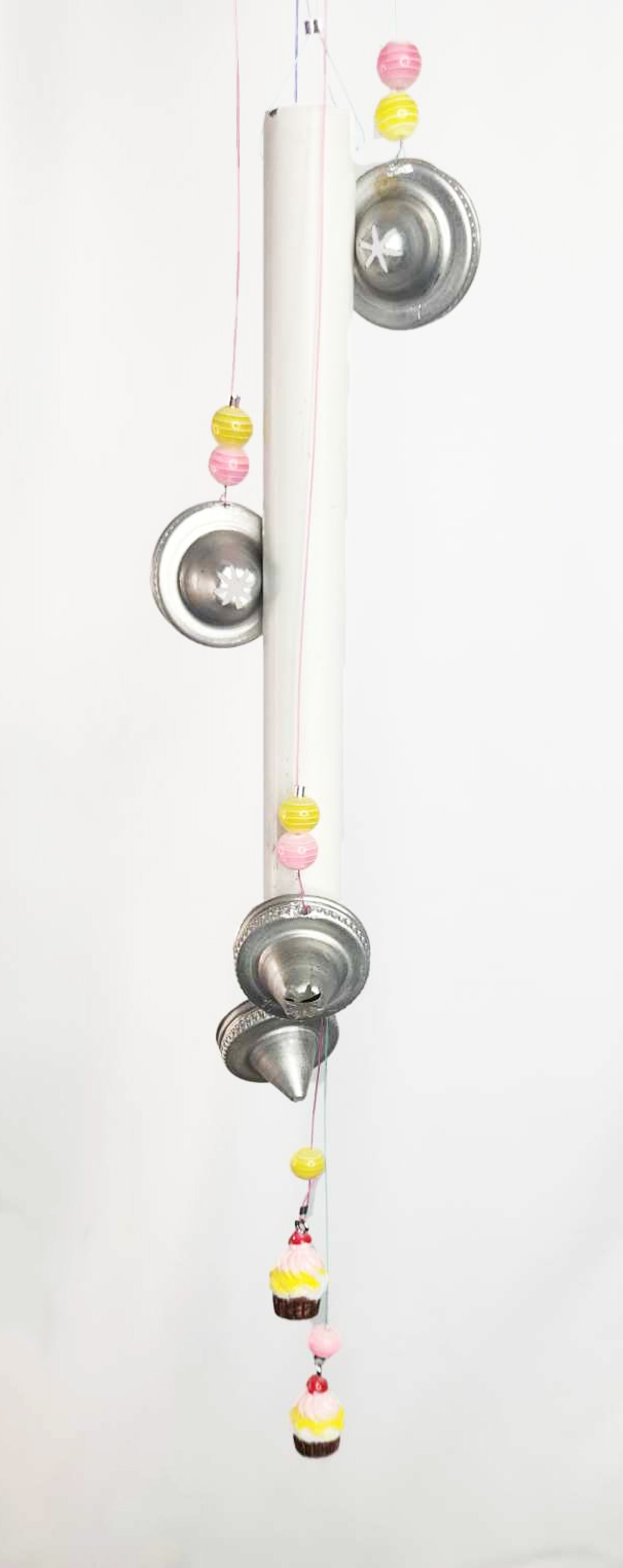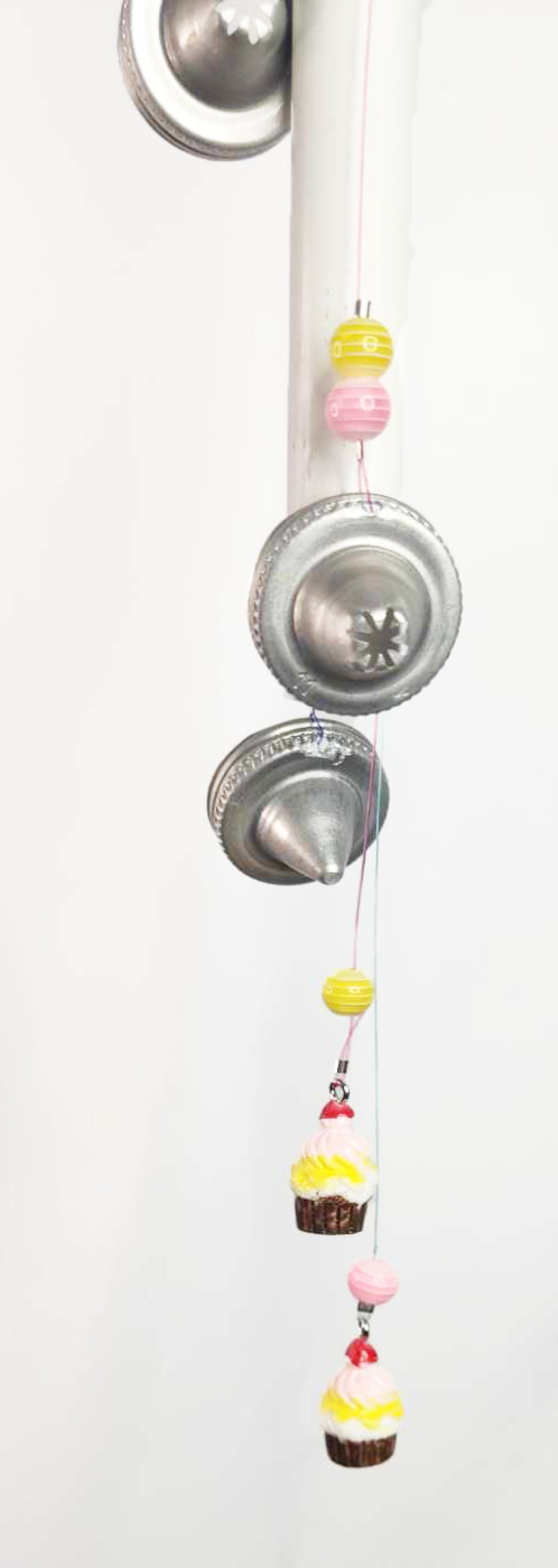 Are you absolutely obsessed with cupcakes? Well, buckle up because this wind chime was made for you! Combining the timeless elegance of vintage frosting decorator and decorating tips with delightful cupcake charms dangling next to a sturdy pole, this wind chime will fill your heart with pure joy and your ears with the sweetest symphony of melodies. It's not just a wind chime - it's a celebration of your love for cupcakes, transformed into a beautifully crafted work of art that will bring a touch of whimsy and delight to every momen't. Get ready to indulge in the enchanting sound of bliss with every gentle breeze that passes through.