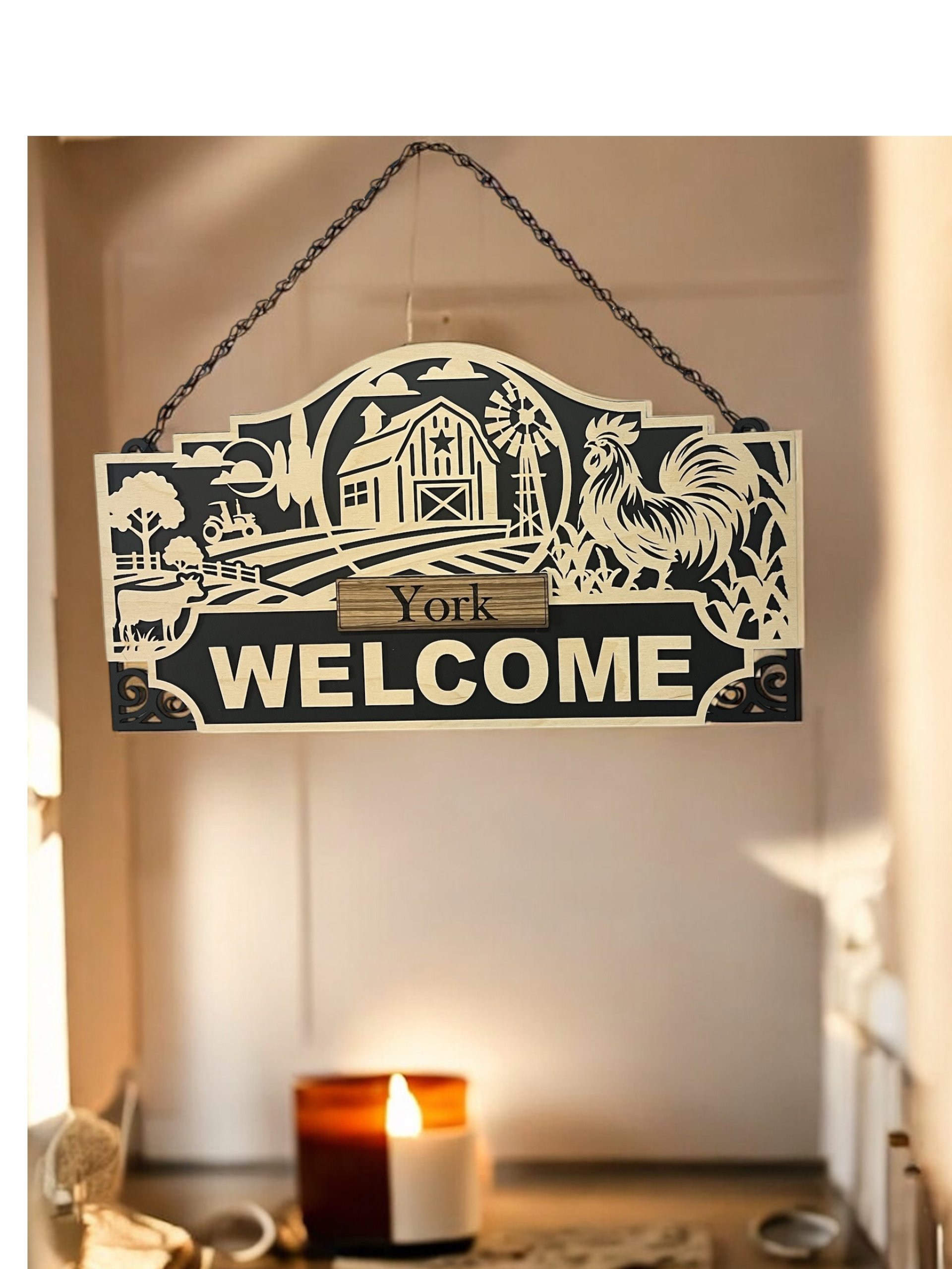 Welcome guests to your home with this beautifully detailed farmhouse-themed sign! Featuring a rustic barn, rooster, cow, tractor, windmill and more. This laser-cut masterpiece captures the charm of country life in layered wood tones. Personalize the sign with your family name or a custom word of your choice, showcased in a raised wood insert for added depth.