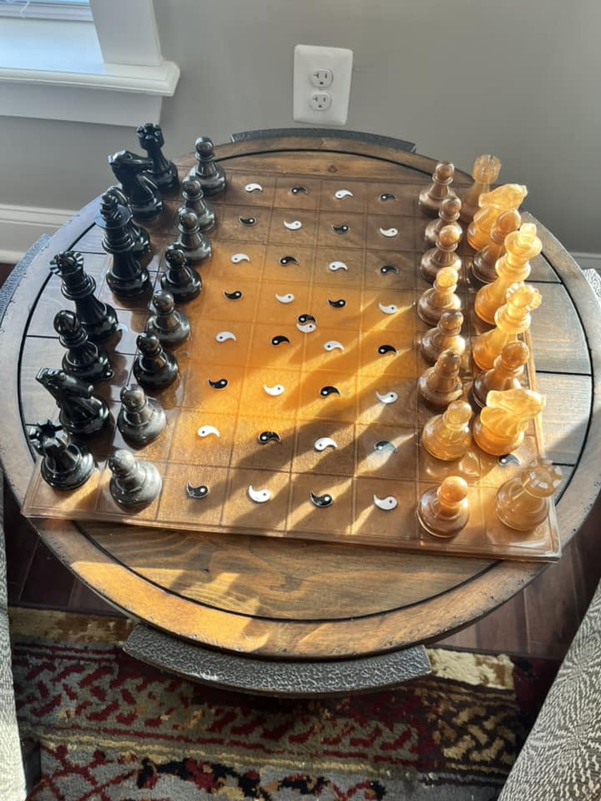 Custom made chess game. Can be made in your choice of color/design. No two games will look exactly the same.