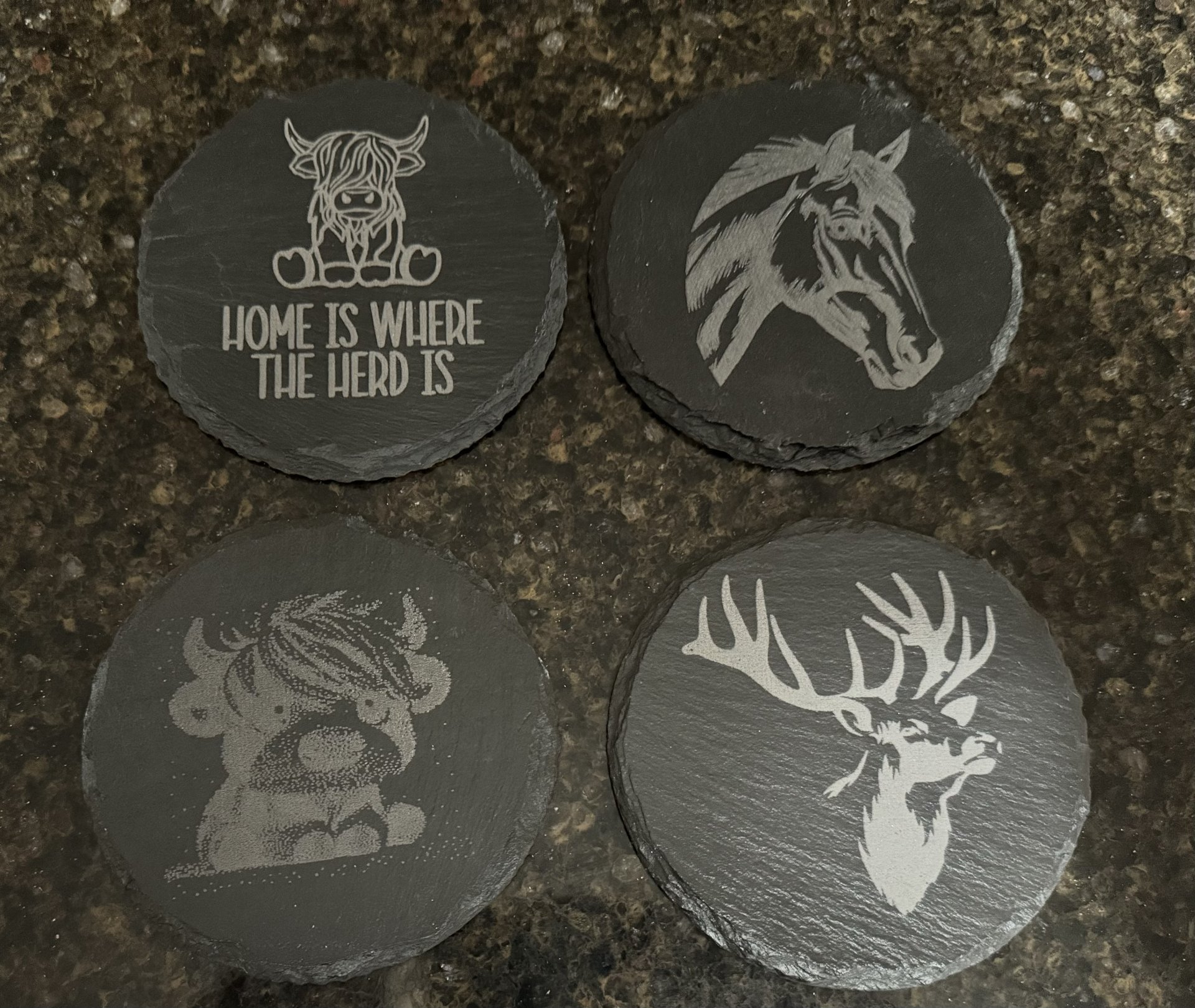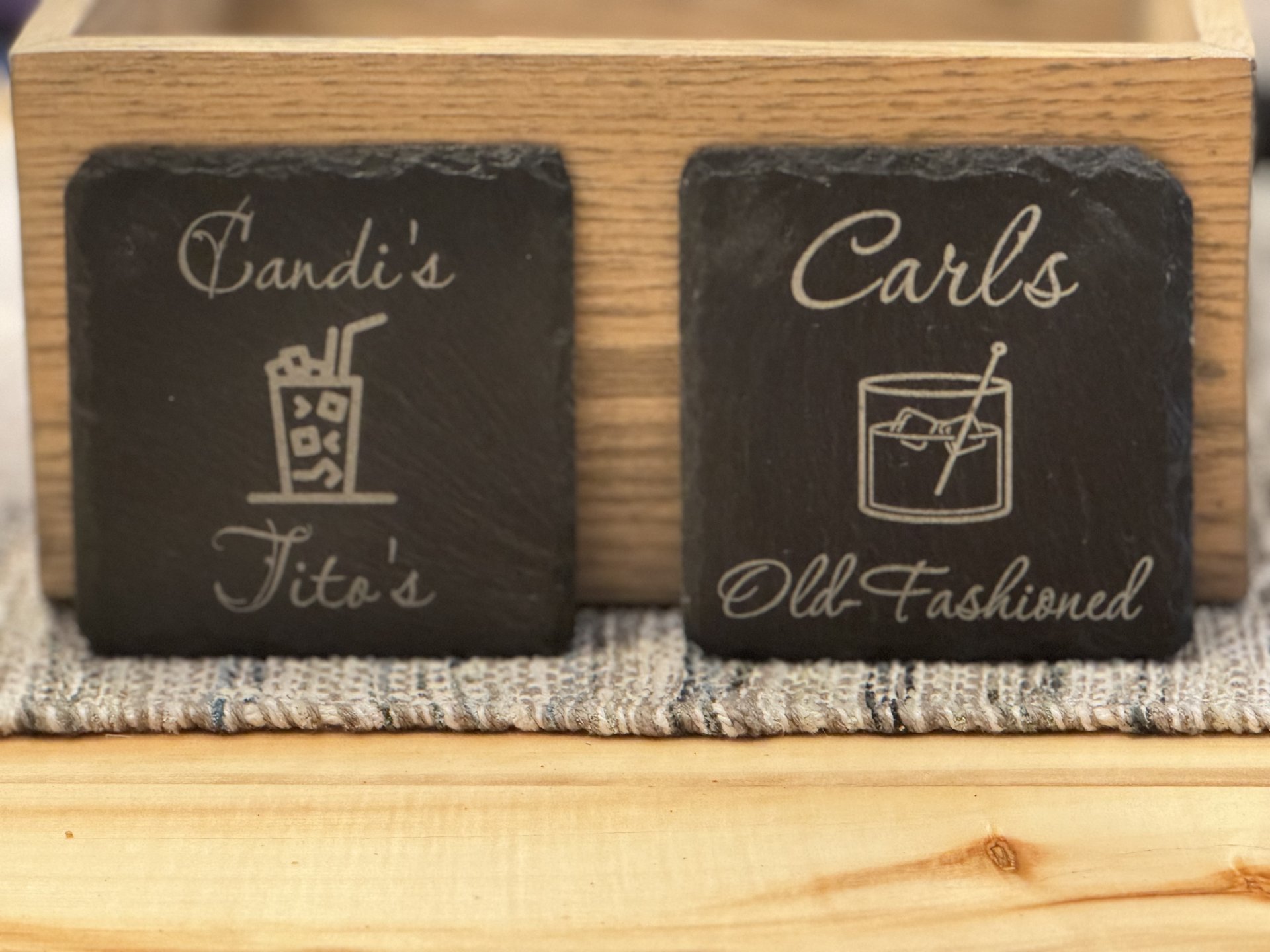 Create unique coasters for your bar, she shed or man cave with Custom Slate Coasters! Personalize your own set and impress your guests with style. Whether for yourself or as a gift, these coasters are the perfect addition to any home. Cheers to customization!"
