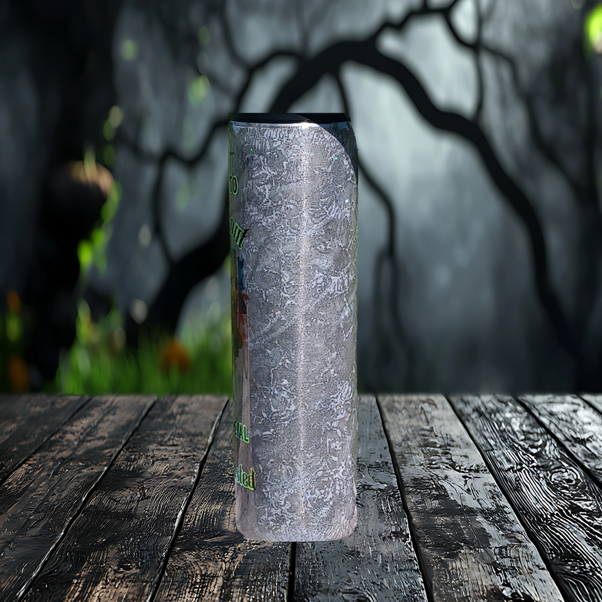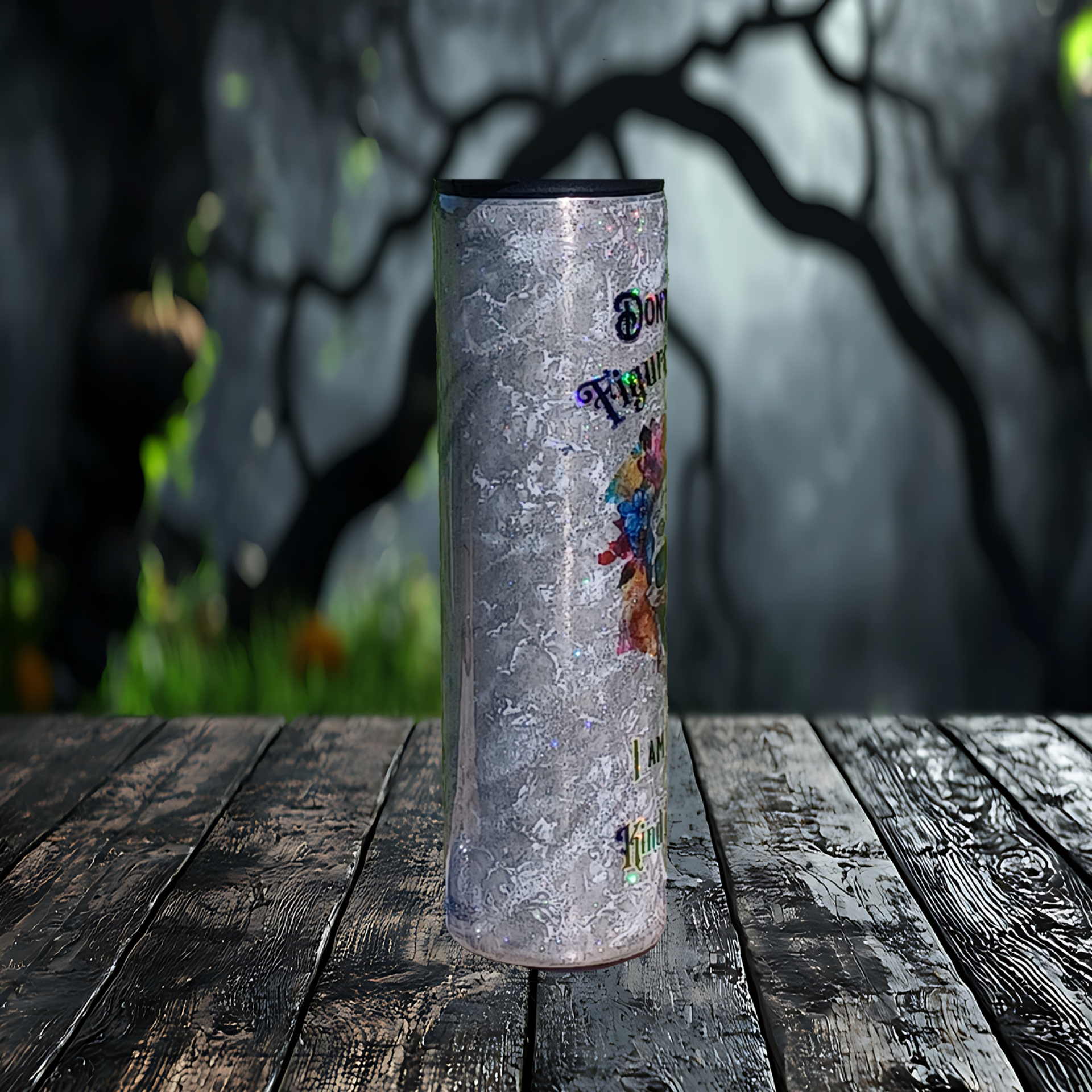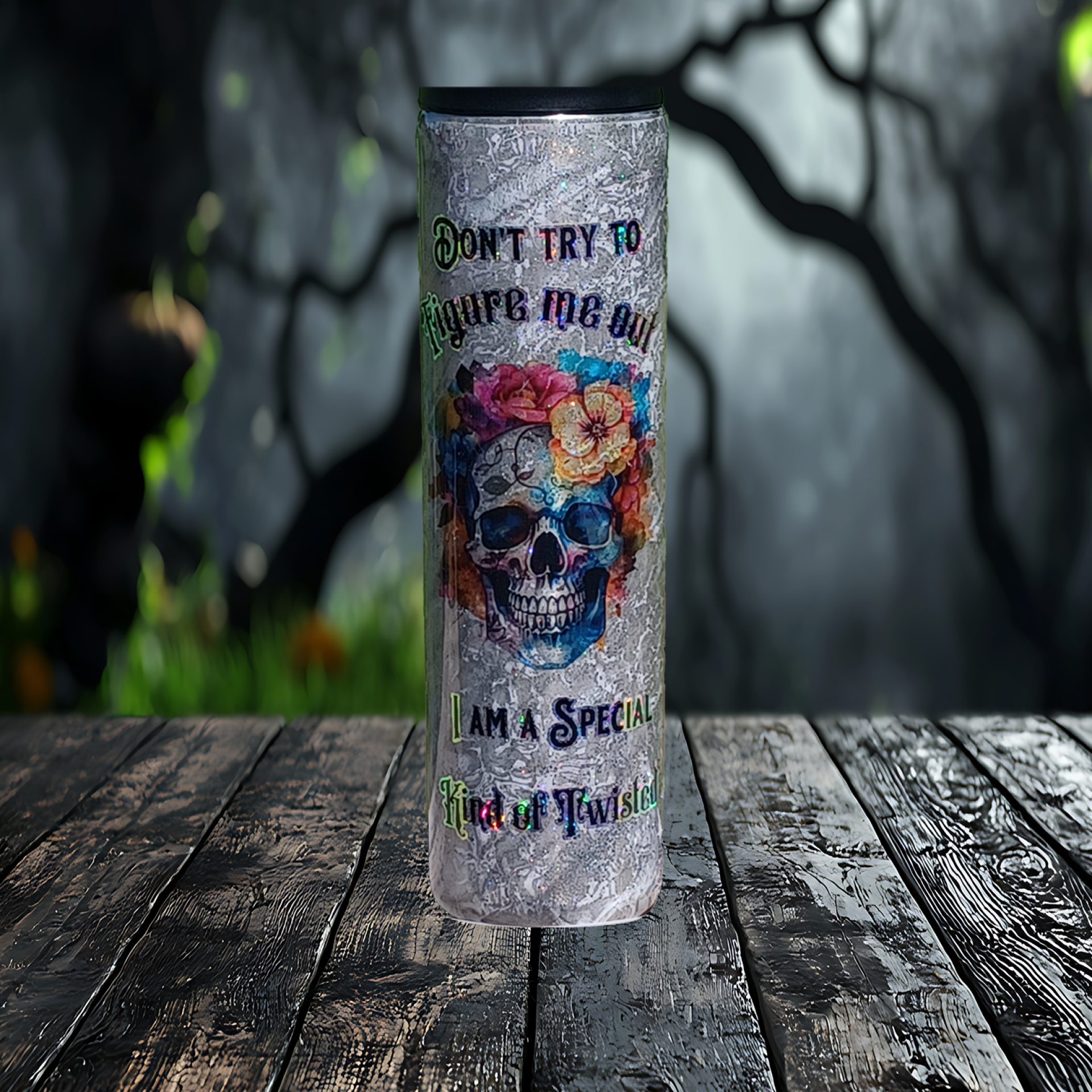 Step into the eerie glow of confidence and chaos with the Deadly Radiance tumbler—a fearless fusion of florals, skulls, and shimmer. Set against a crackle-silver background that reflects like shattered glass, this tumbler features a vivid skull adorned with colorful blooms and the boldly unapologetic phrase: "Don’t try to figure me out. I am a special kind of twisted."