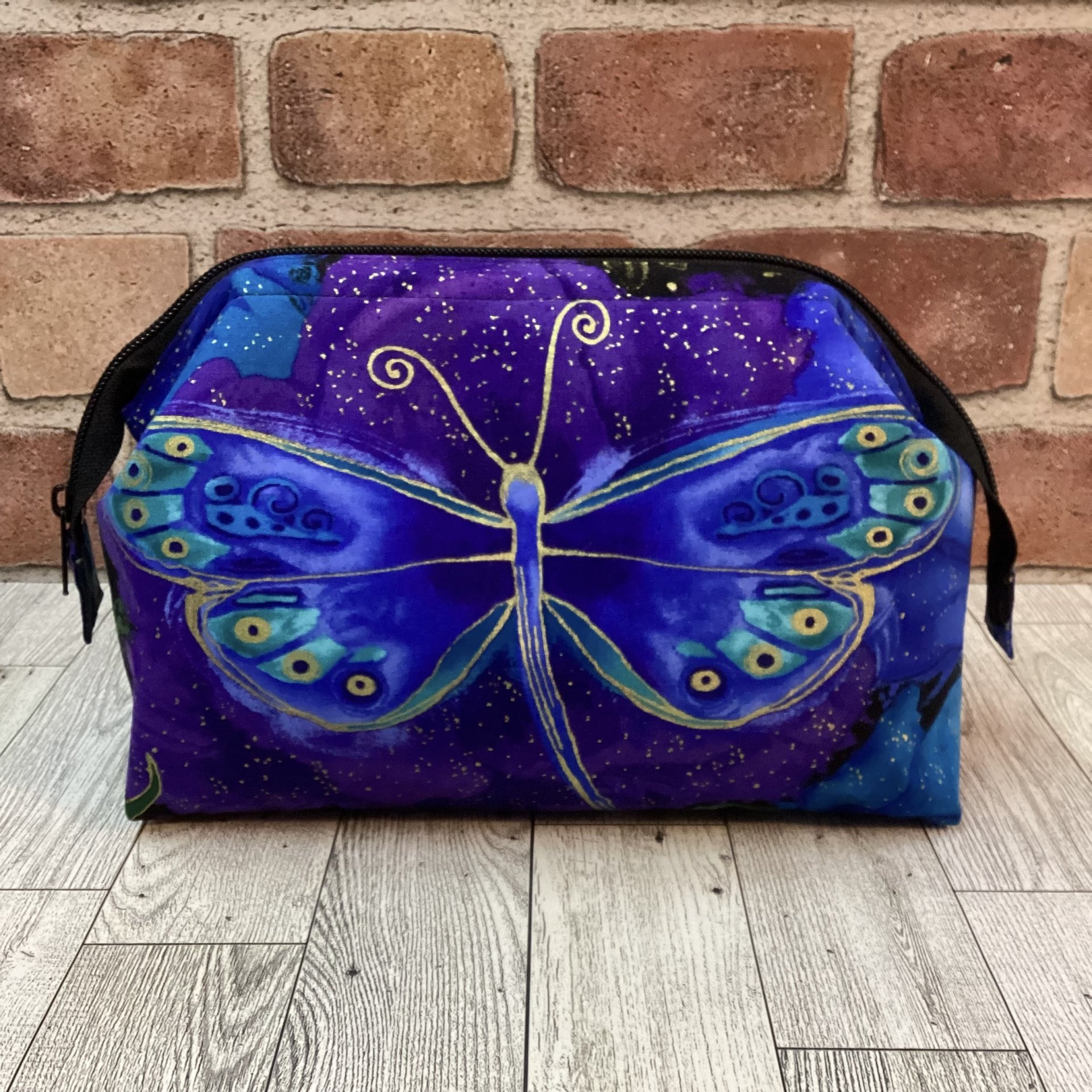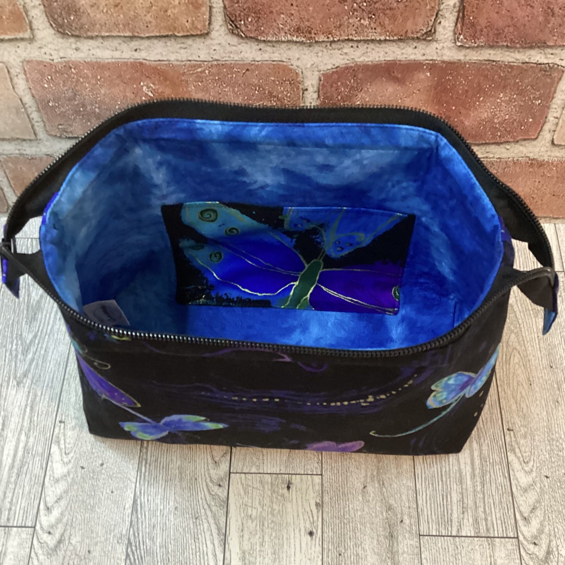 The deep blue fabric has dragonflies on both front and back. There are gold metallic accents and two pockets inside.