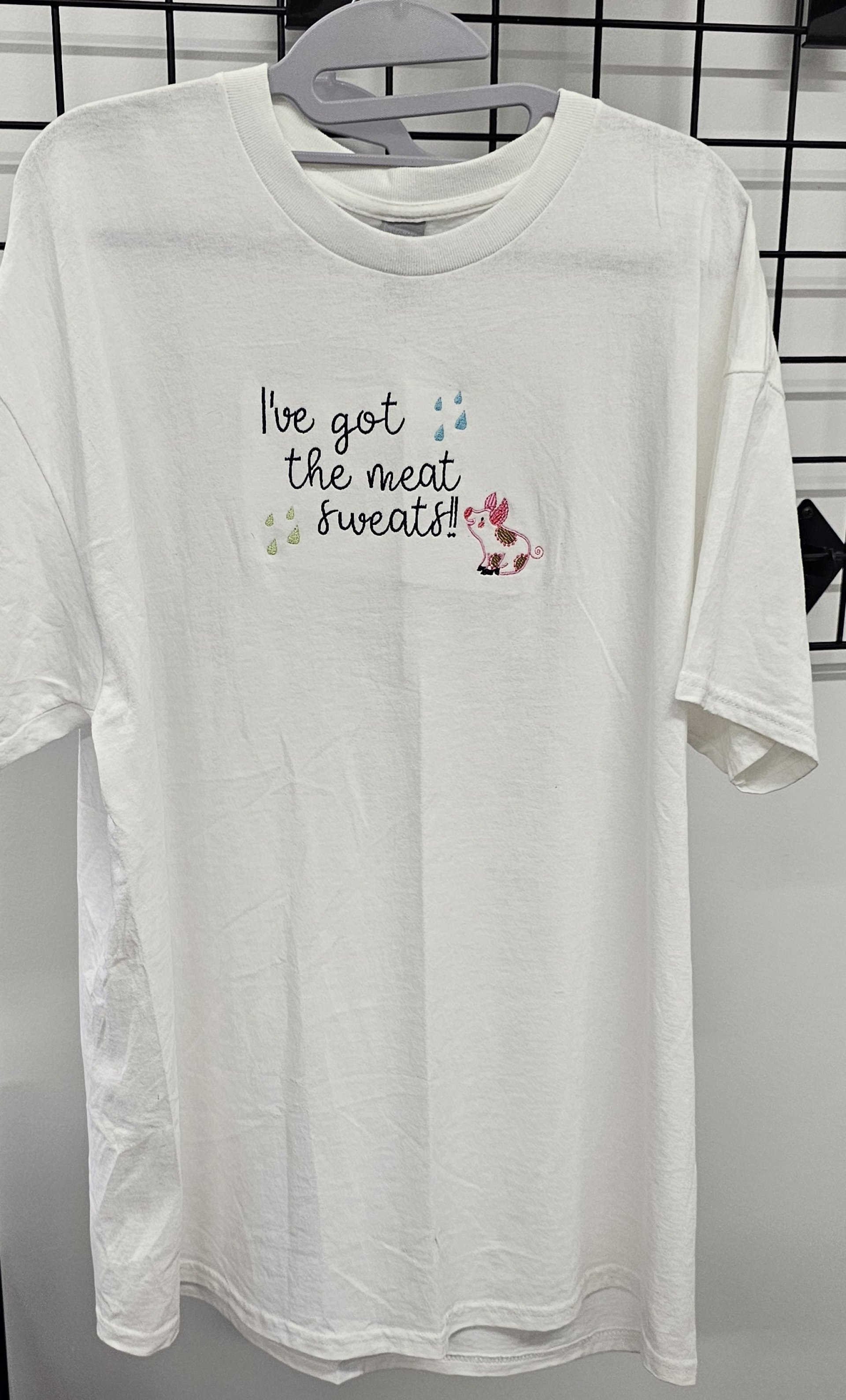 Turn heads and spark laughs with our 'I've Got the Meat Sweats' embroidered T-shirt!