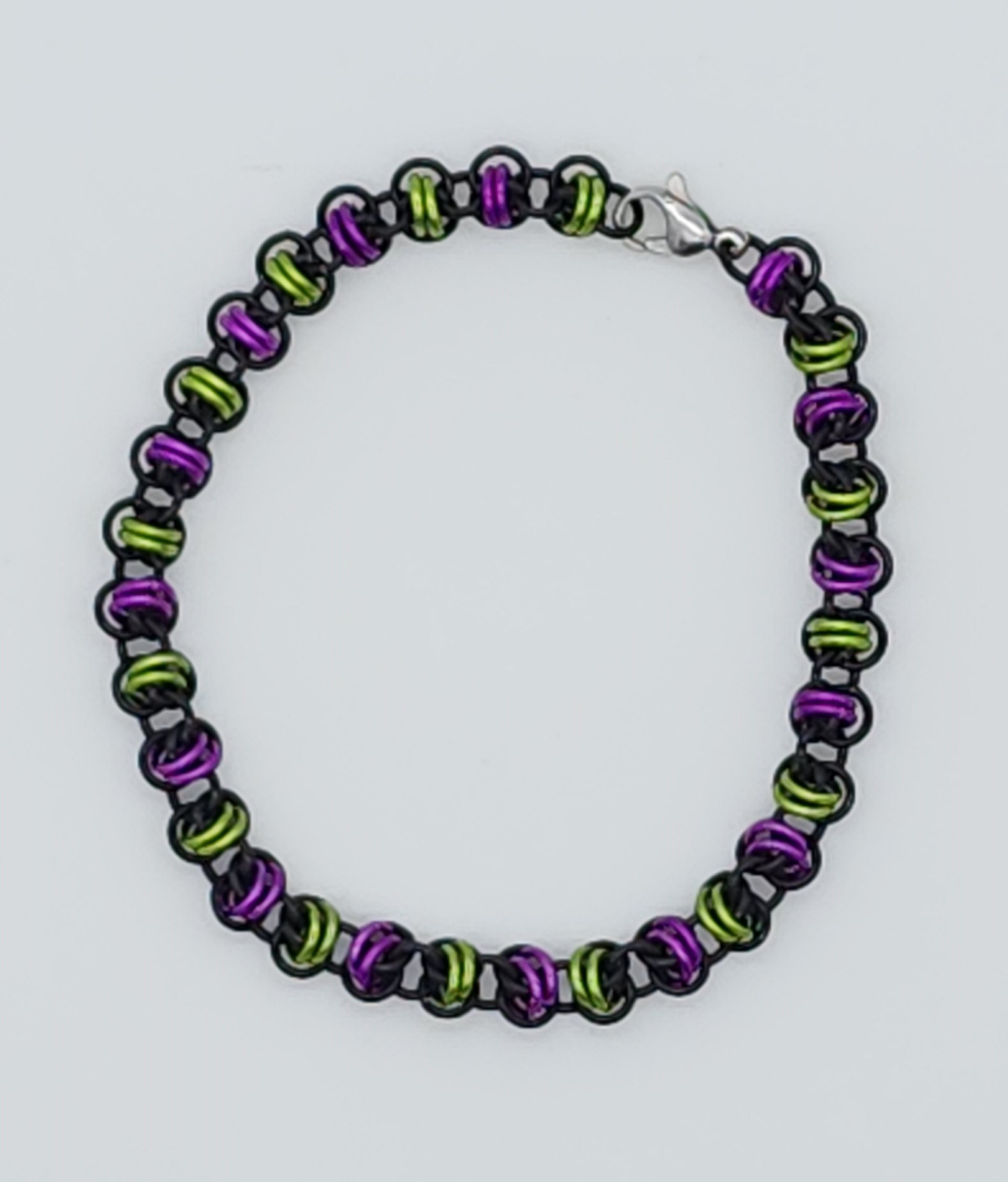 Experience the charm of the Enchanted Meadow Barrel Bracelet, where sophistication meets durability. Crafted with anodized aluminum rings in shades of violet, lime green, and black. Ideal for those who appreciate timeless elegance and vibrant colors, our jewelry offers daily comfort and style. Brighten your look or add magic to any occasion with this unique bracelet.