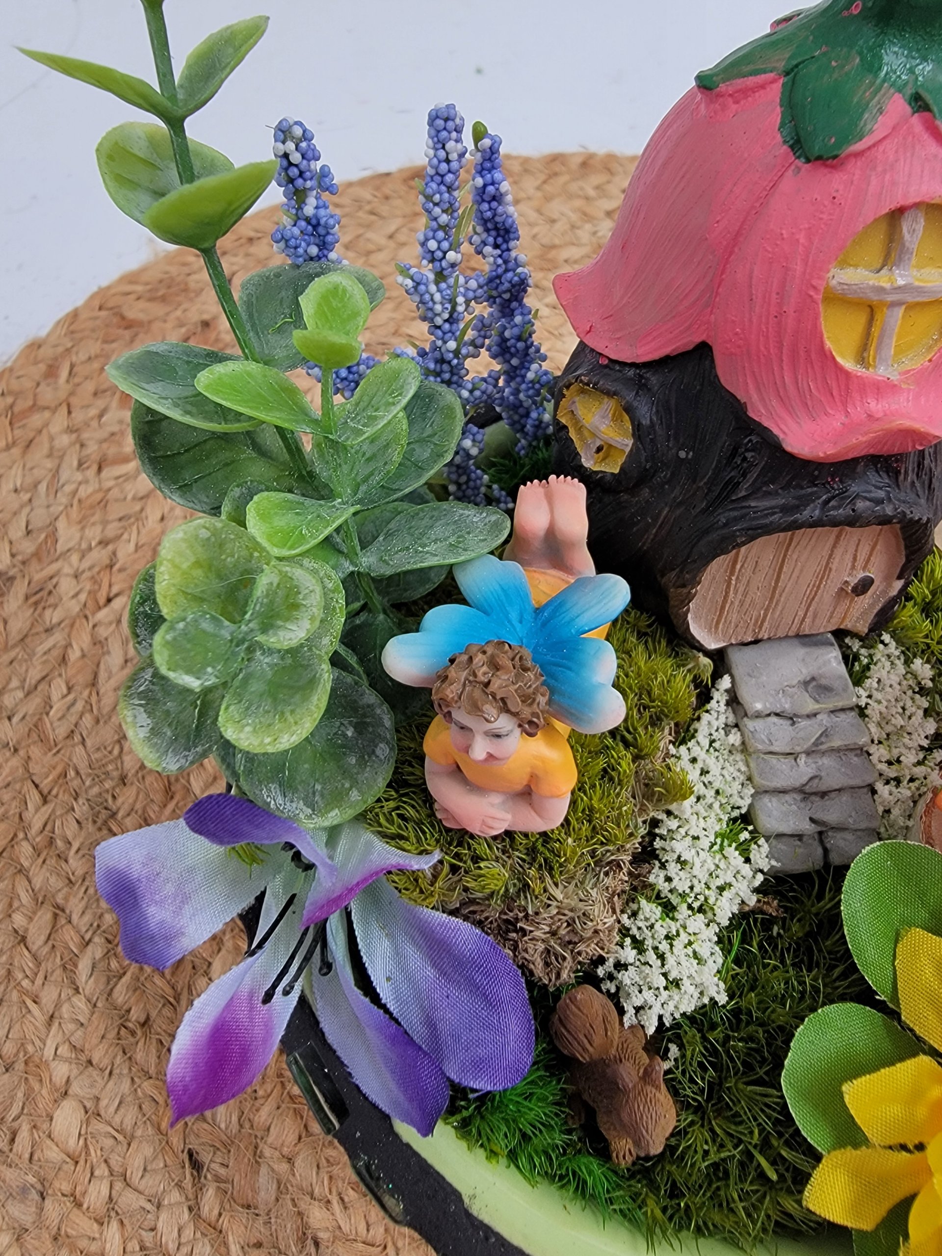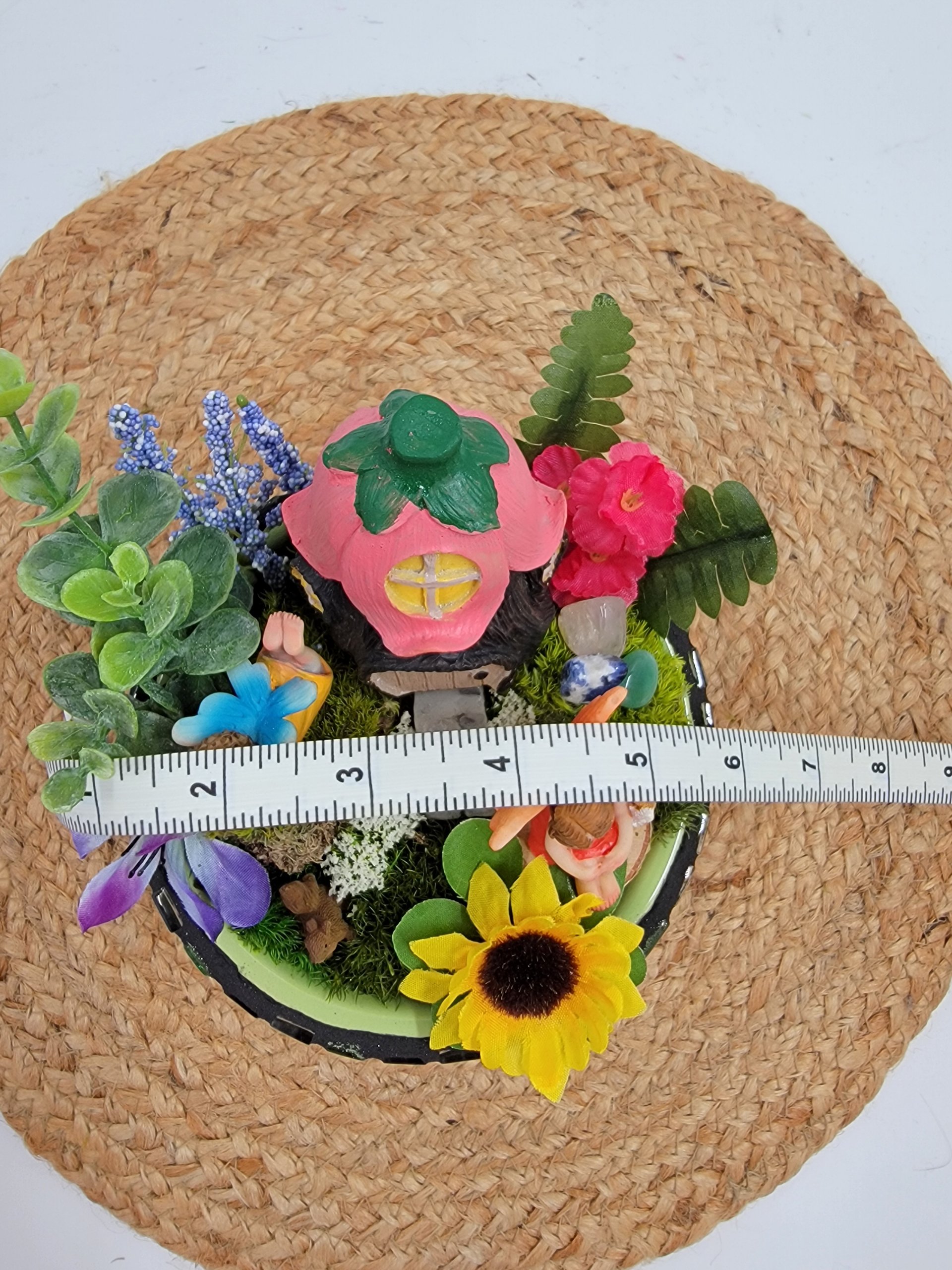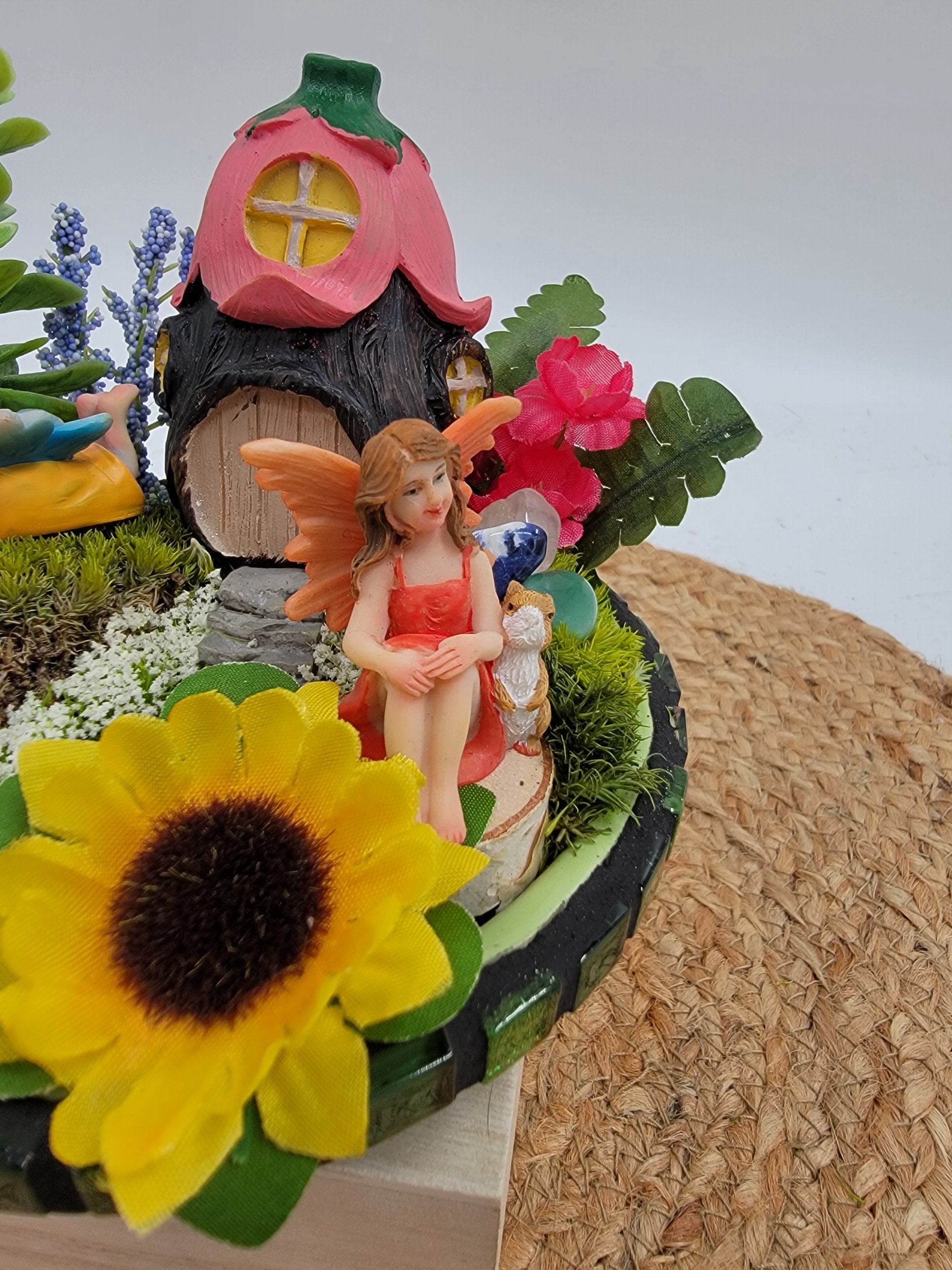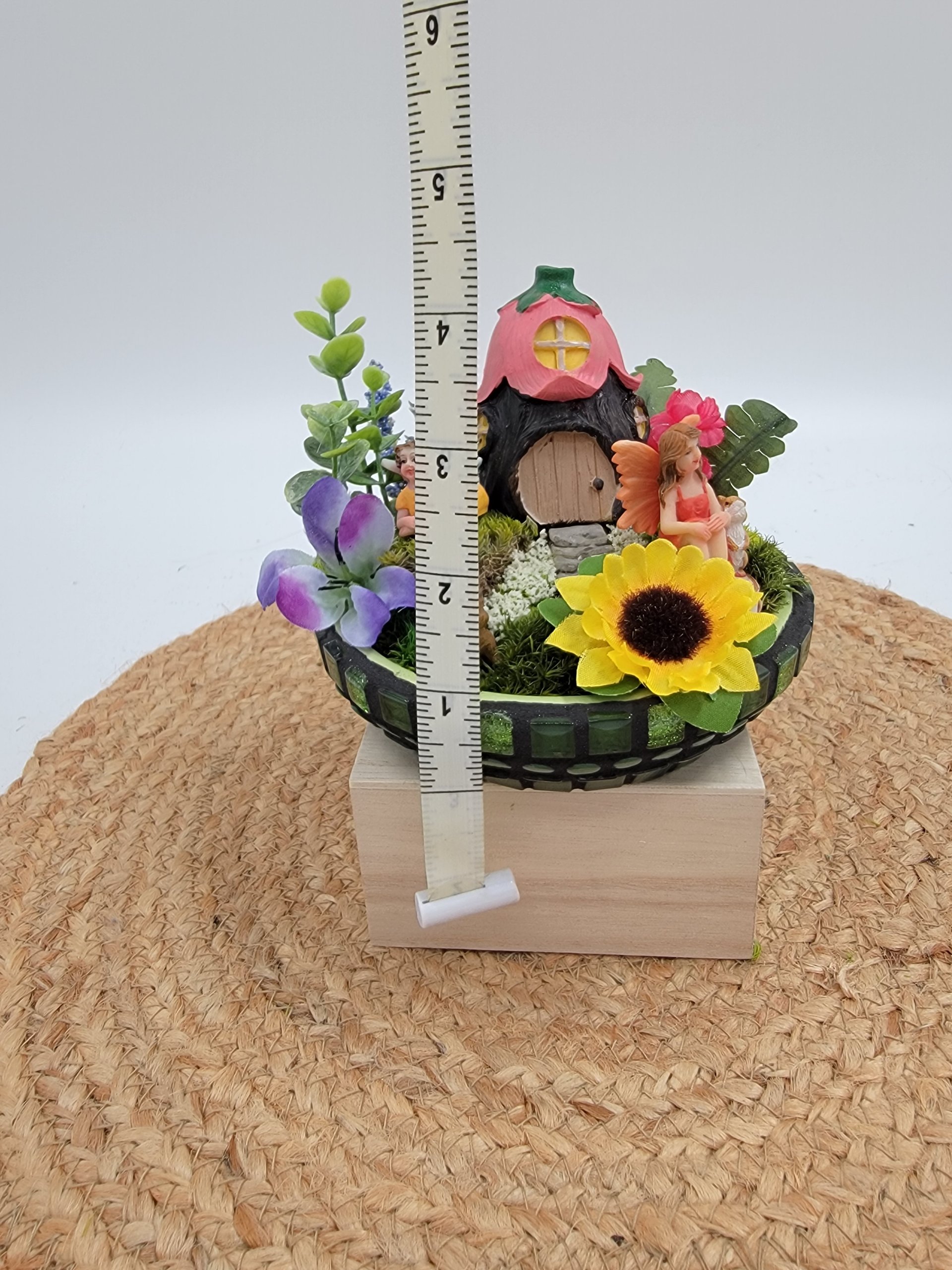 Inside, this fairy garden is filled with preserved moss, faux plants, and delicate fairy figurines, creating an enchanted woodland setting. A charming fairy house, designed like a tiny cottage with a floral rooftop, serves as the centerpiece, while vibrant artificial flowers, including a sunflower and purple blossoms, add pops of color. Small decorative elements like a tiny rabbit and stone pathway complete the scene, enhancing its storybook appeal.