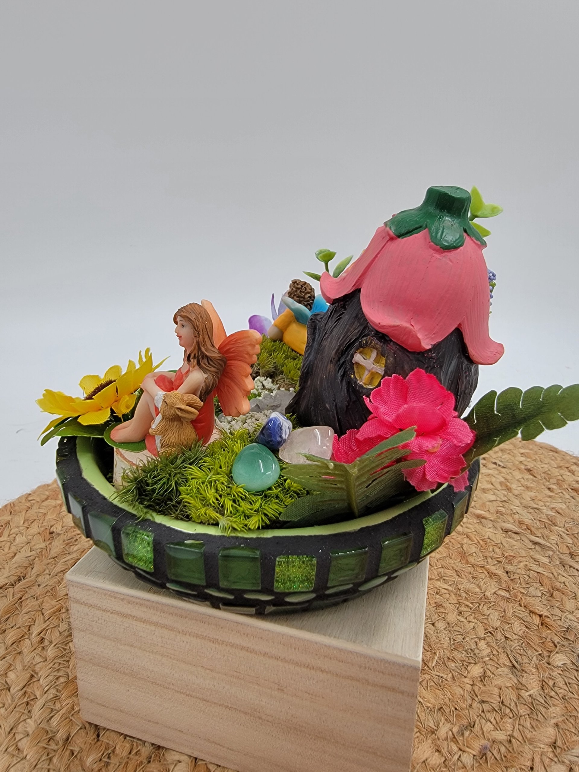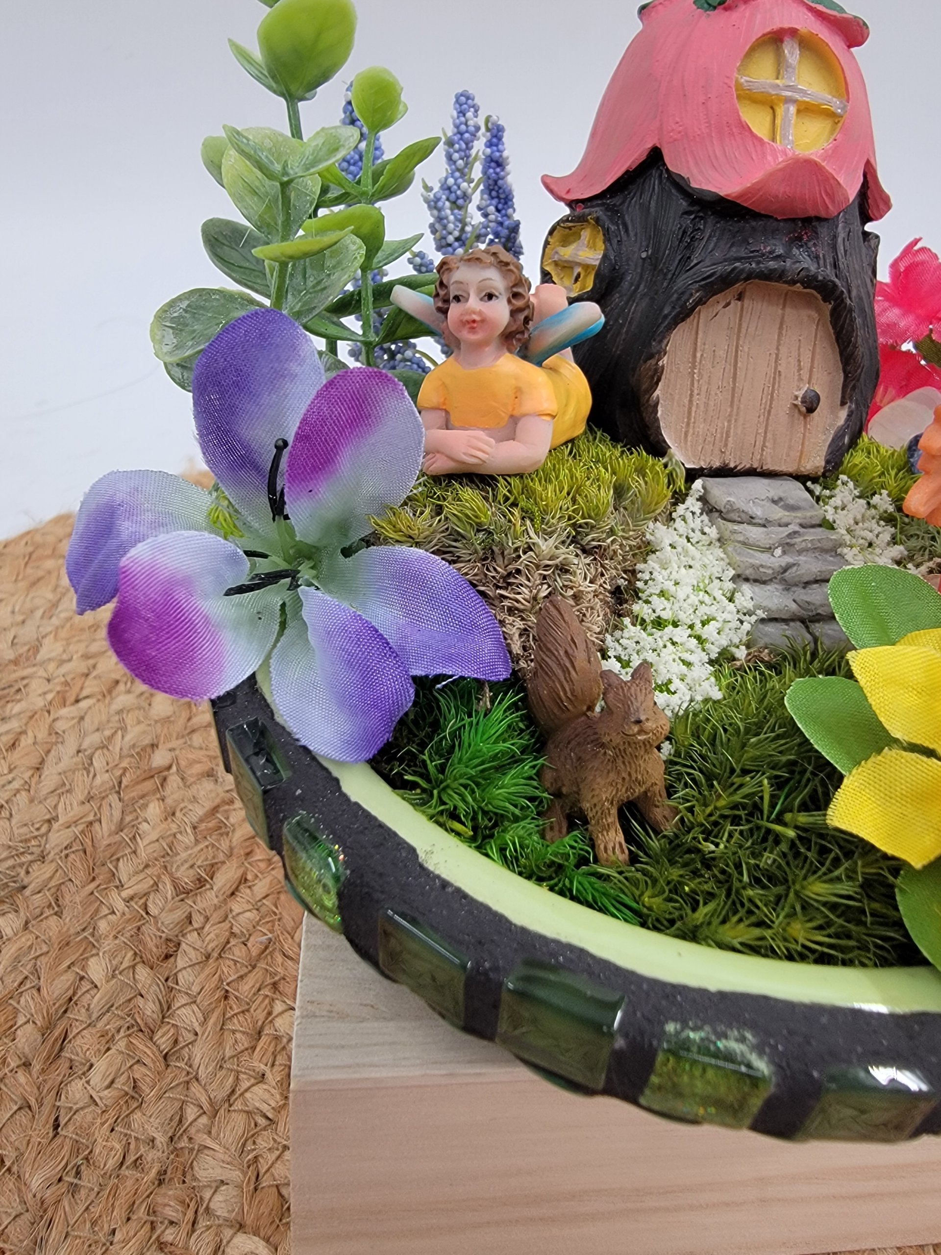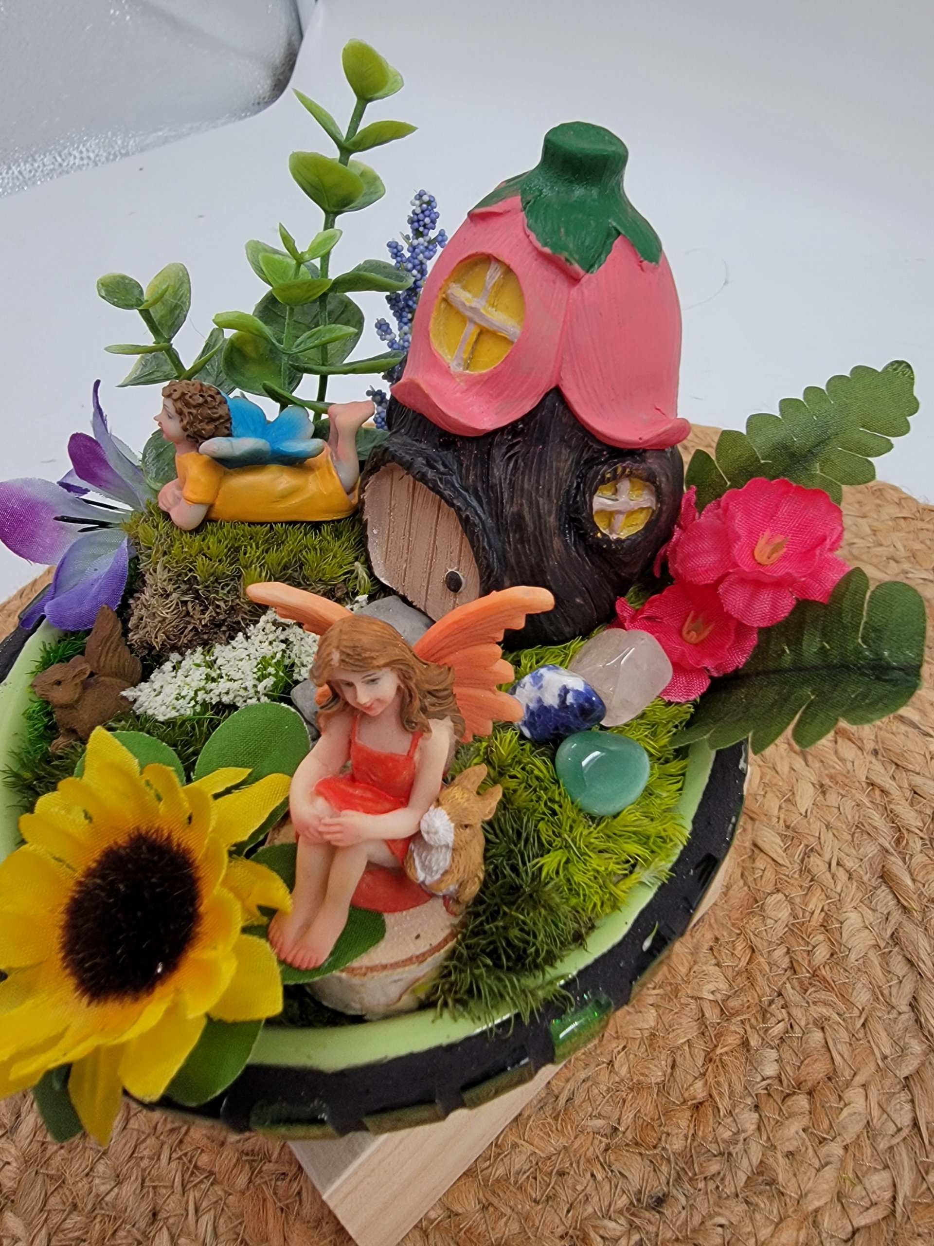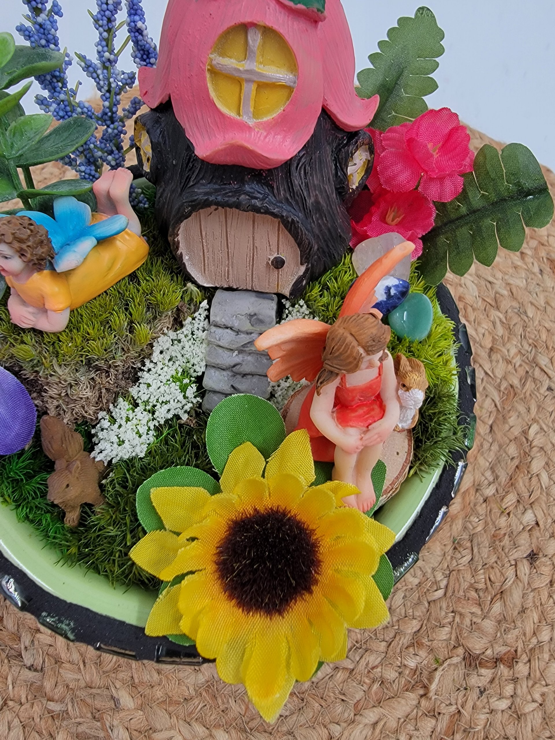 Inside, this fairy garden is filled with preserved moss, faux plants, and delicate fairy figurines, creating an enchanted woodland setting. A charming fairy house, designed like a tiny cottage with a floral rooftop, serves as the centerpiece, while vibrant artificial flowers, including a sunflower and purple blossoms, add pops of color. Small decorative elements like a tiny rabbit and stone pathway complete the scene, enhancing its storybook appeal.