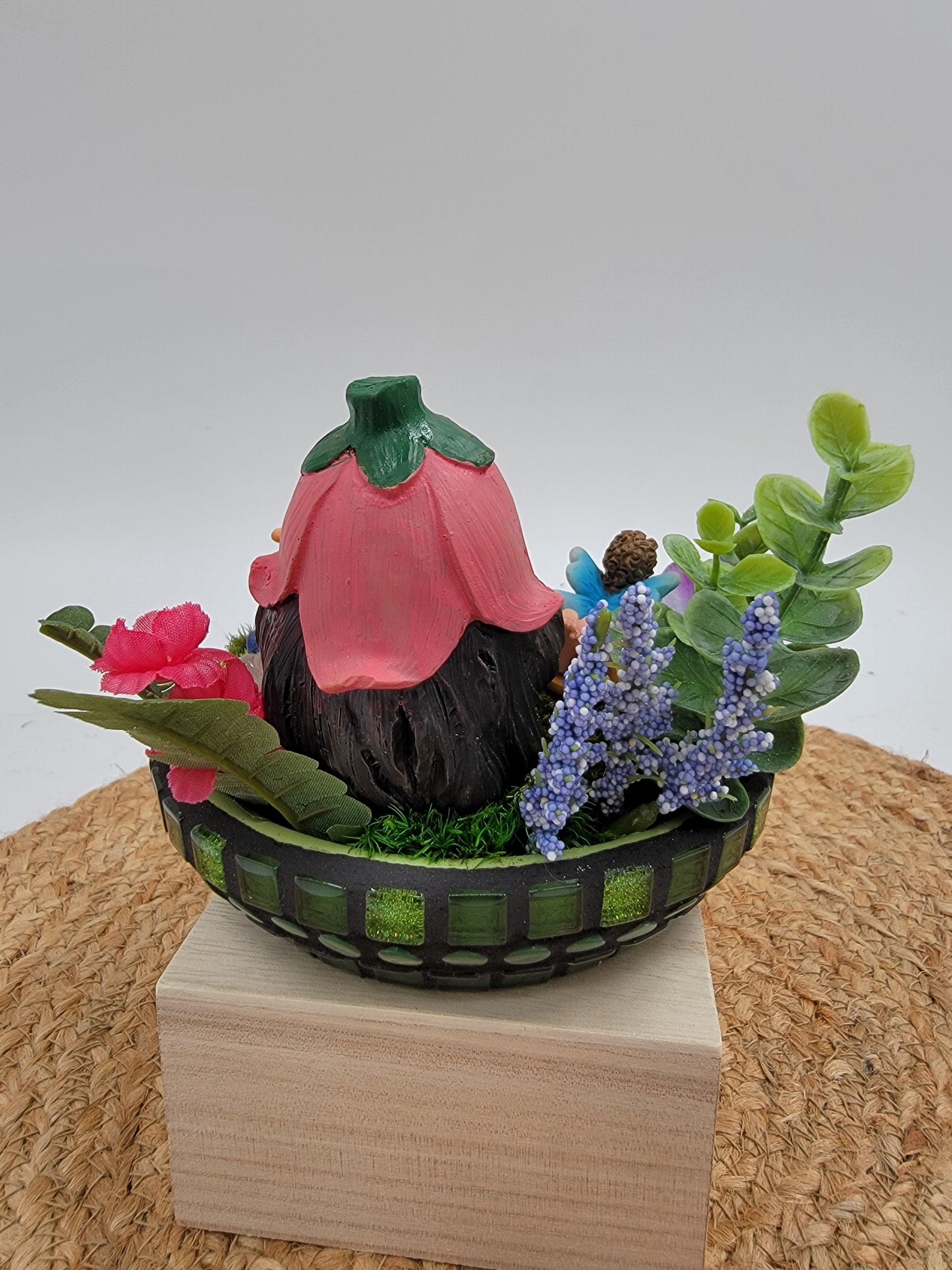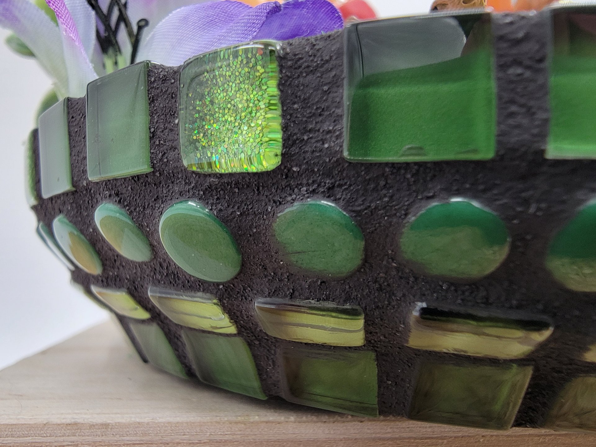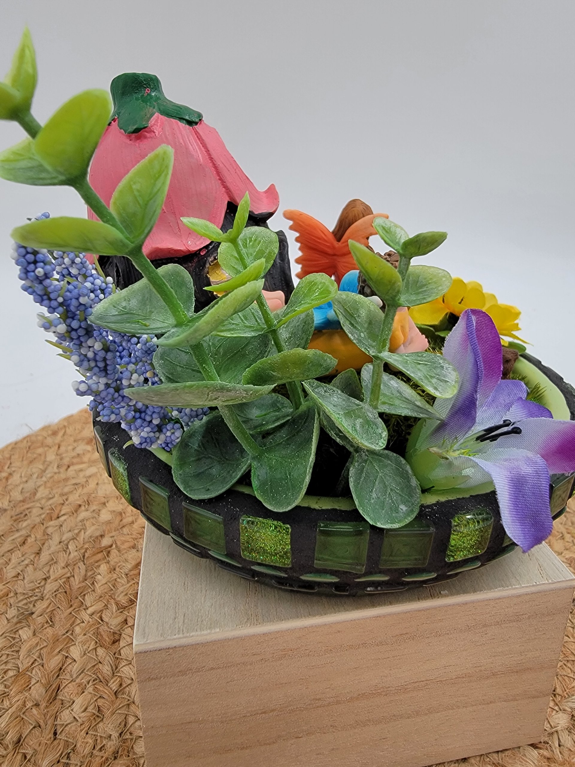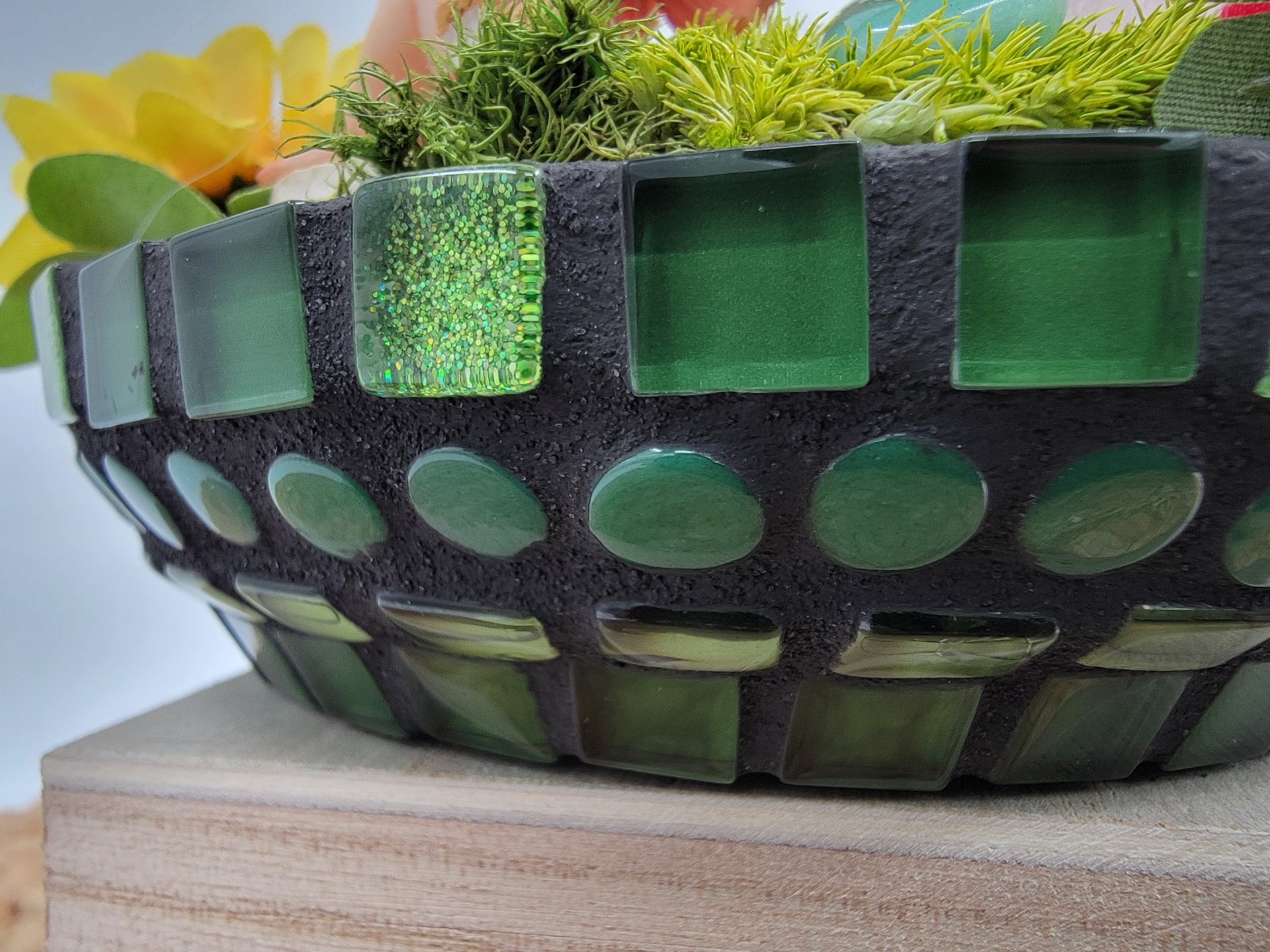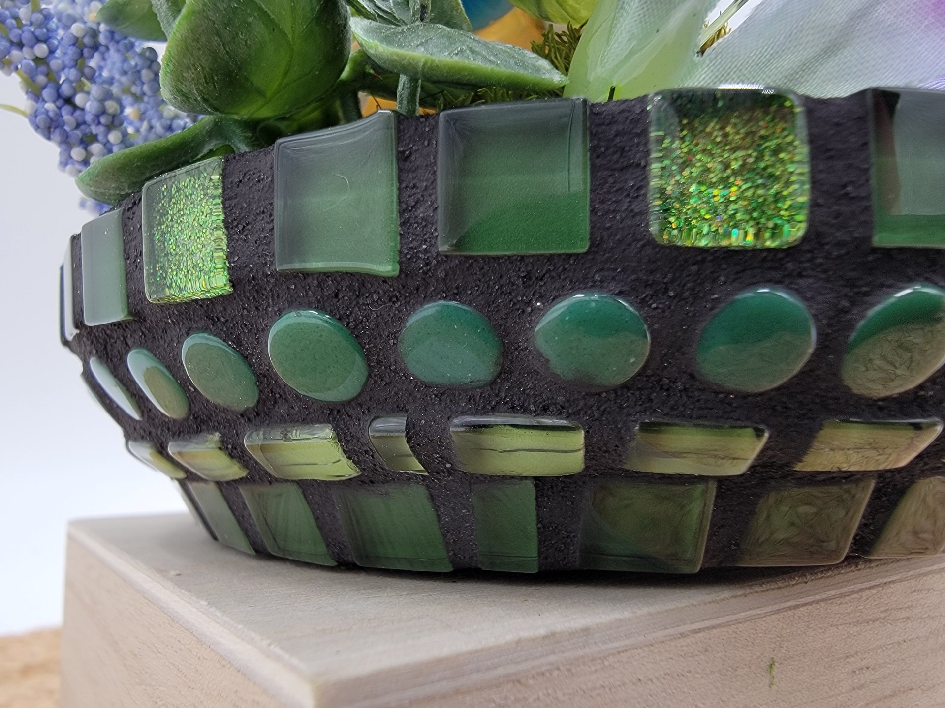 Bring a touch of whimsy to your space with this handcrafted fairy garden, featuring a ceramic base adorned with a green mosaic design. The bowl is decorated with a mix of glossy and glitter glass tiles, creating a magical and elegant foundation for this miniature world.