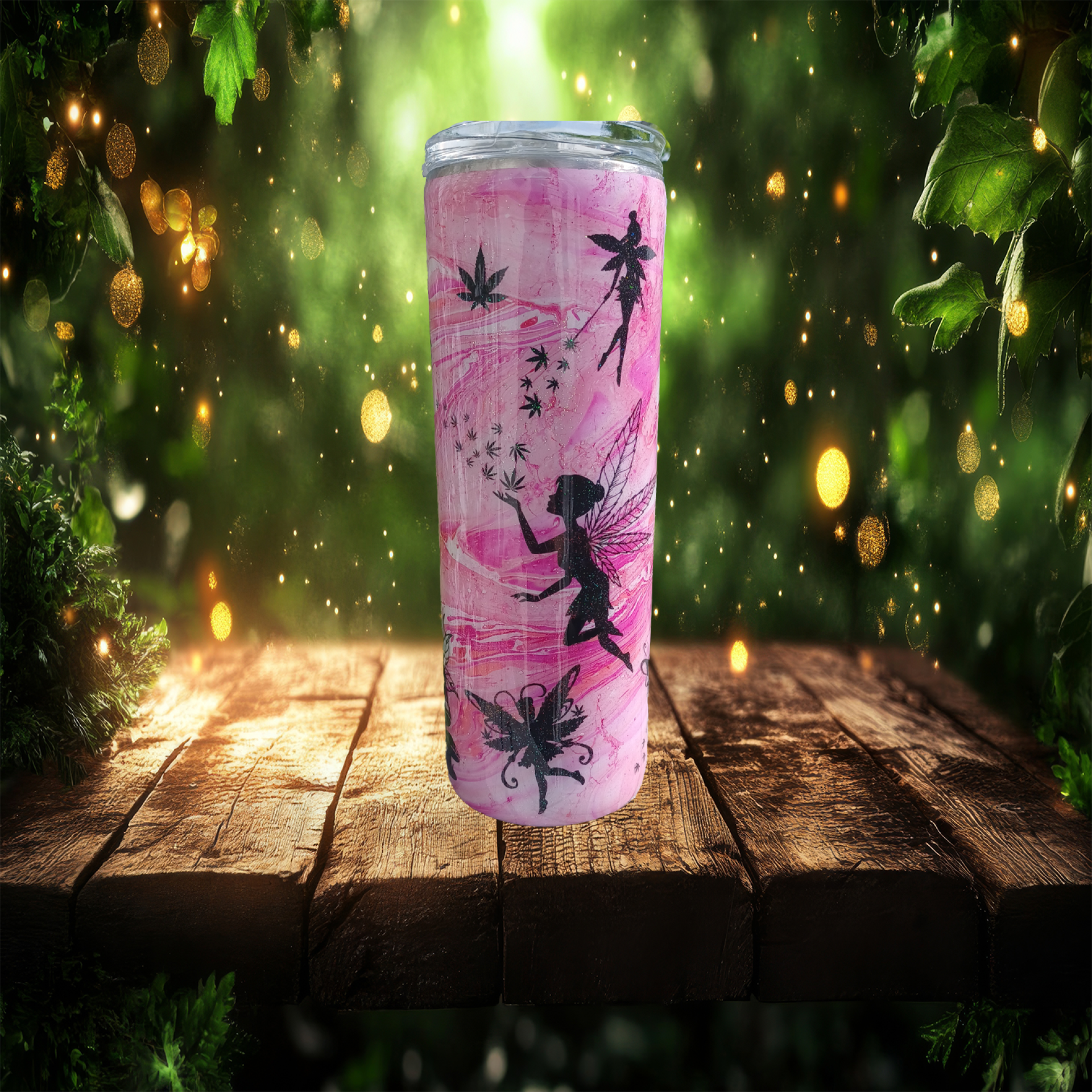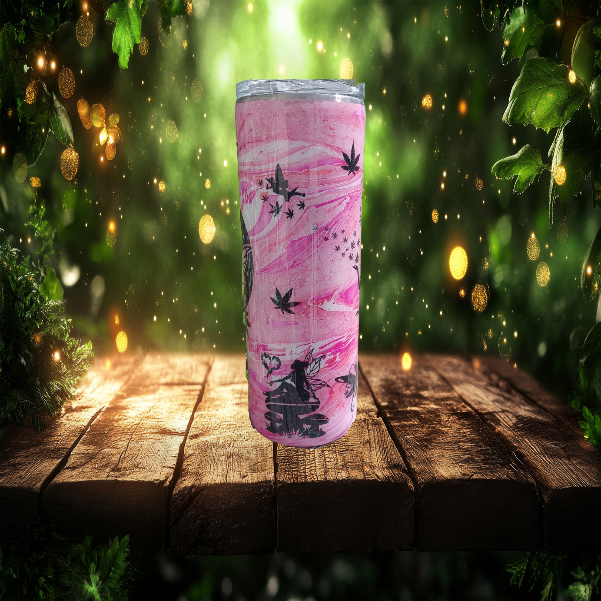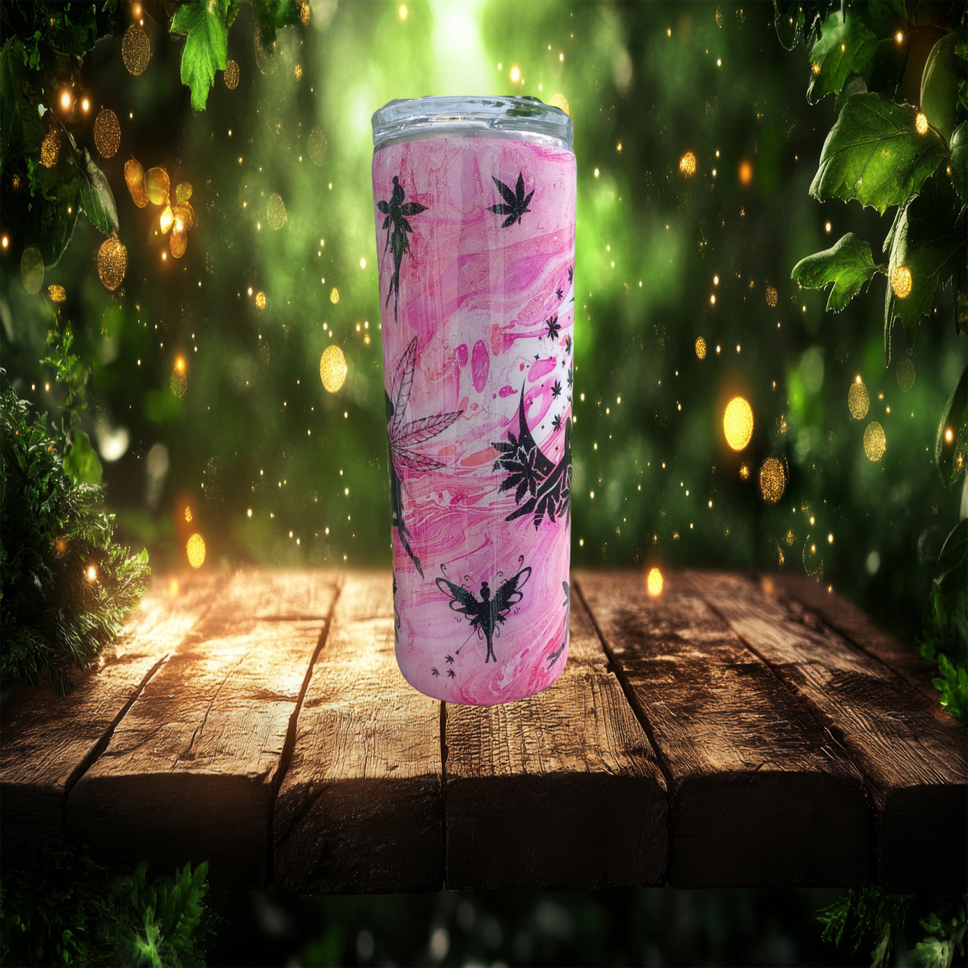 Step into a sparkling dreamscape with Fairy Lit — a whimsical, one-of-a-kind tumbler that blends ethereal fairy vibes with a cheeky herbal twist. Featuring a dreamy pink marbled background and bold black silhouettes of winged fairies floating among glittering leaves, this cup is a playful rebellion wrapped in sparkle. Whether you're chasing good vibes or just embracing your magical mischief, this cup is ready to follow you into any enchanted garden — or smoke session.