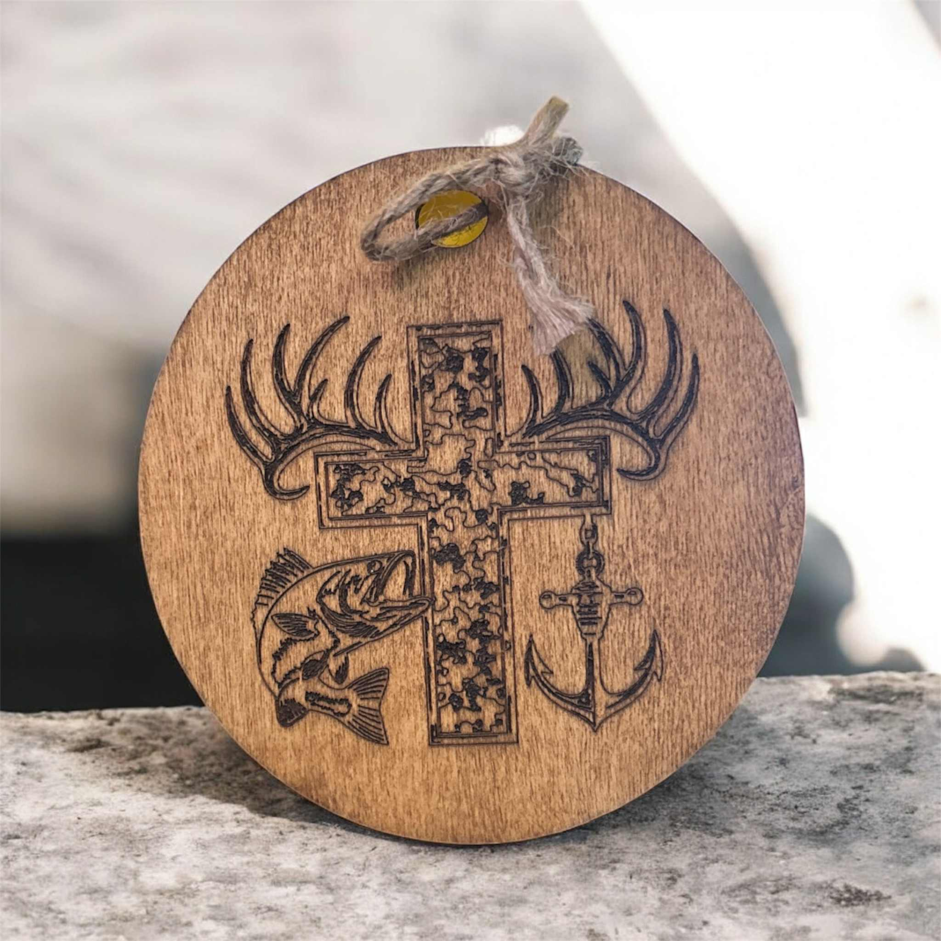 Engraved camo cross at the heart of the design Deer antlers, bass fish, and anchor details