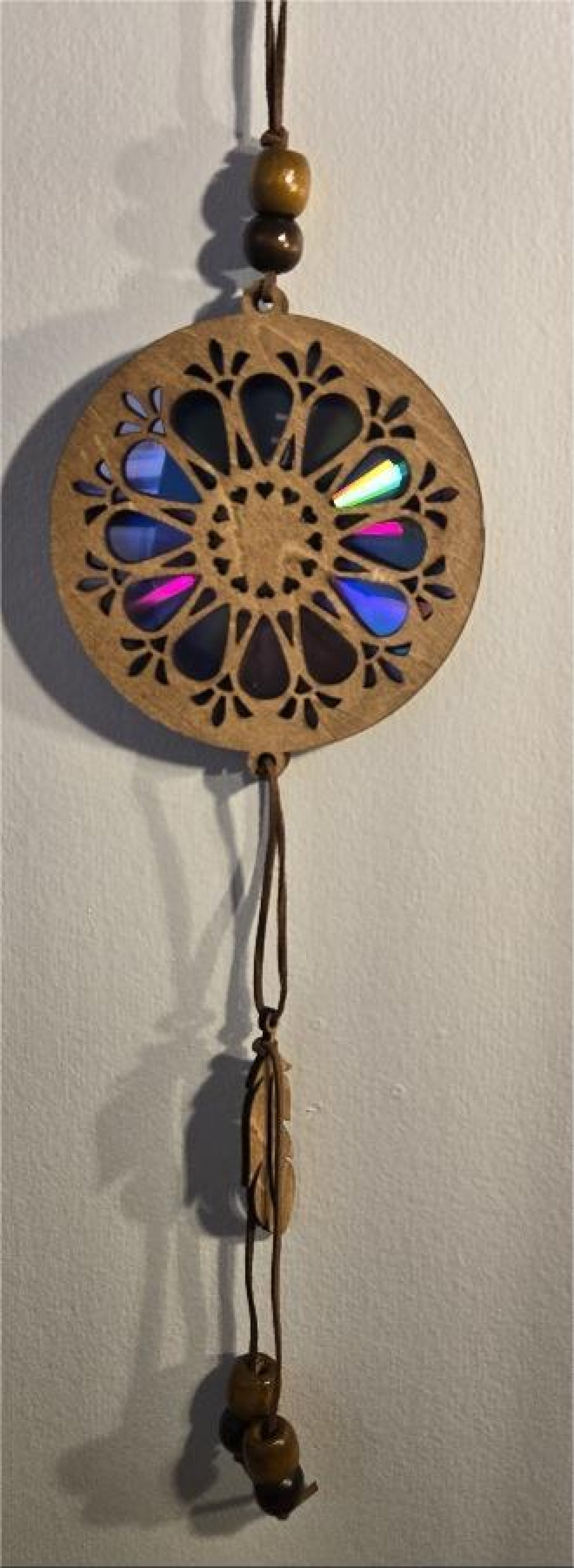 Bring a kaleidoscope of color into your home with this beautiful, handmade flower sun catcher! Lovingly crafted from wood and recycled materials, this unique piece captures the sunlight and transforms it into a dazzling display of light.