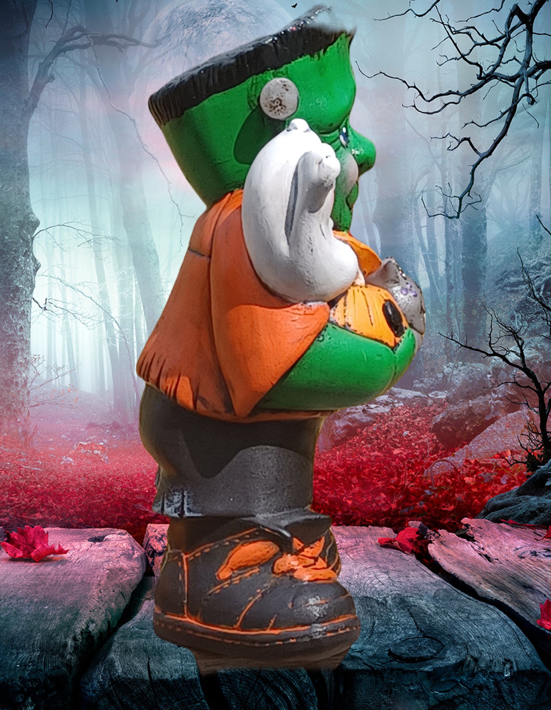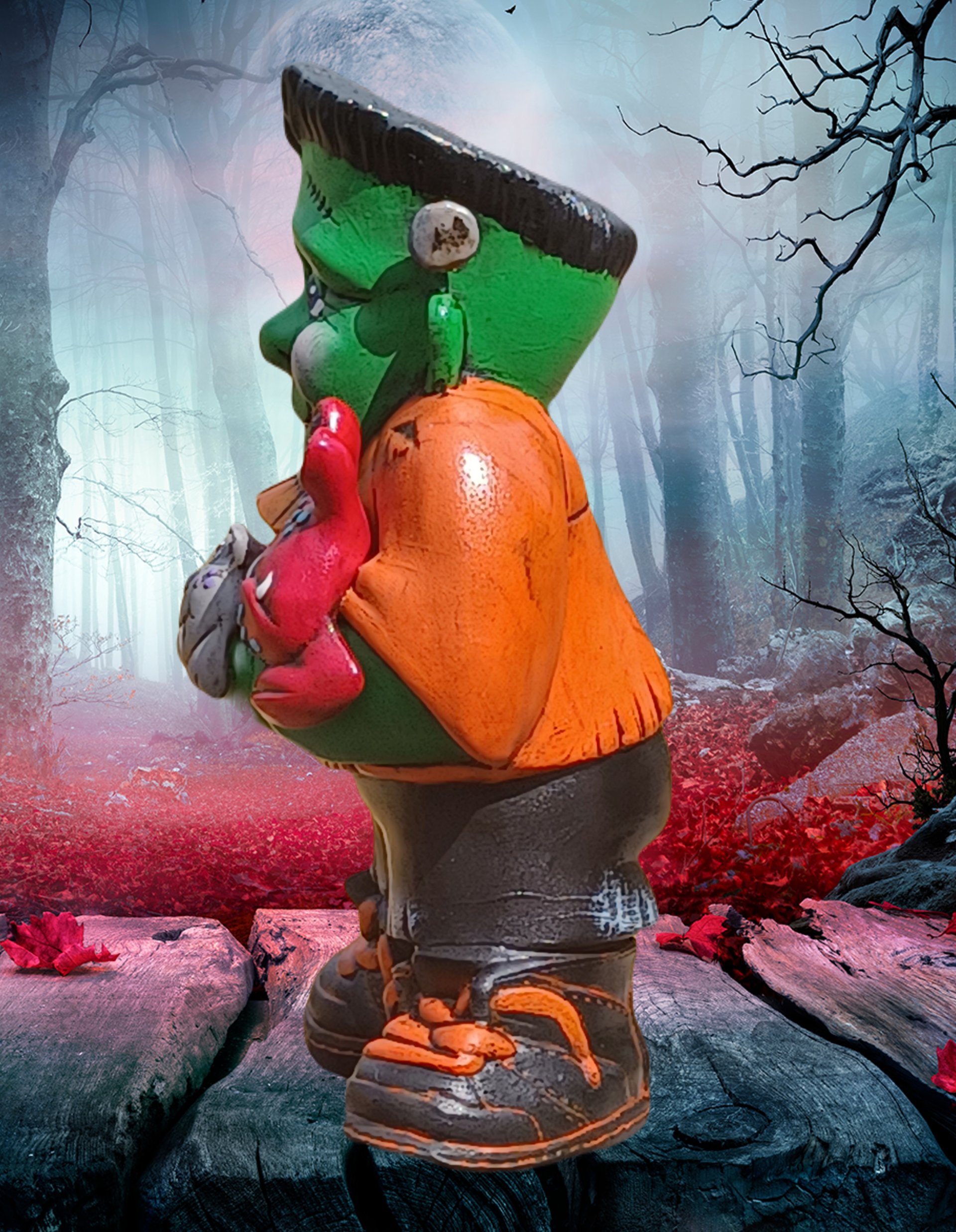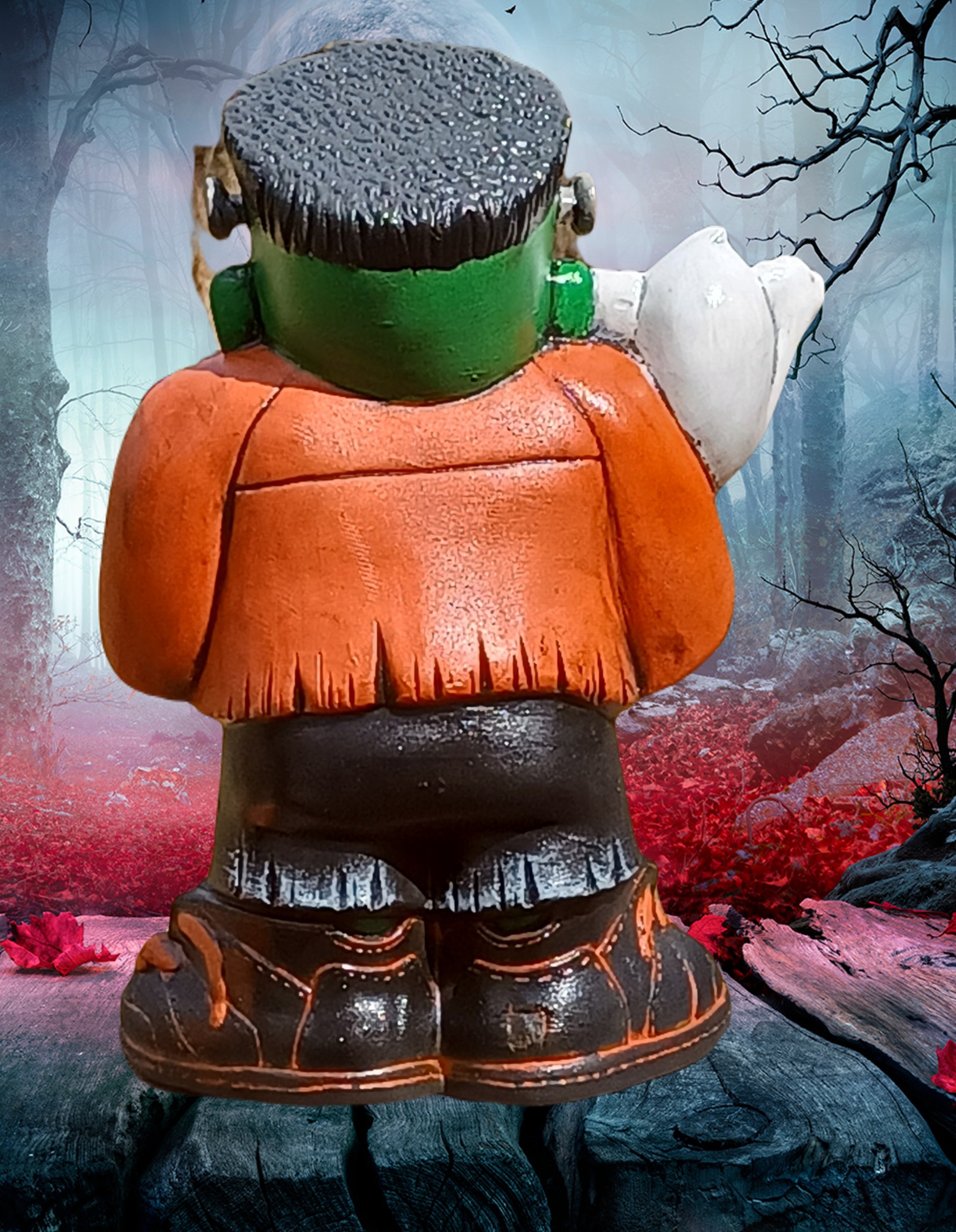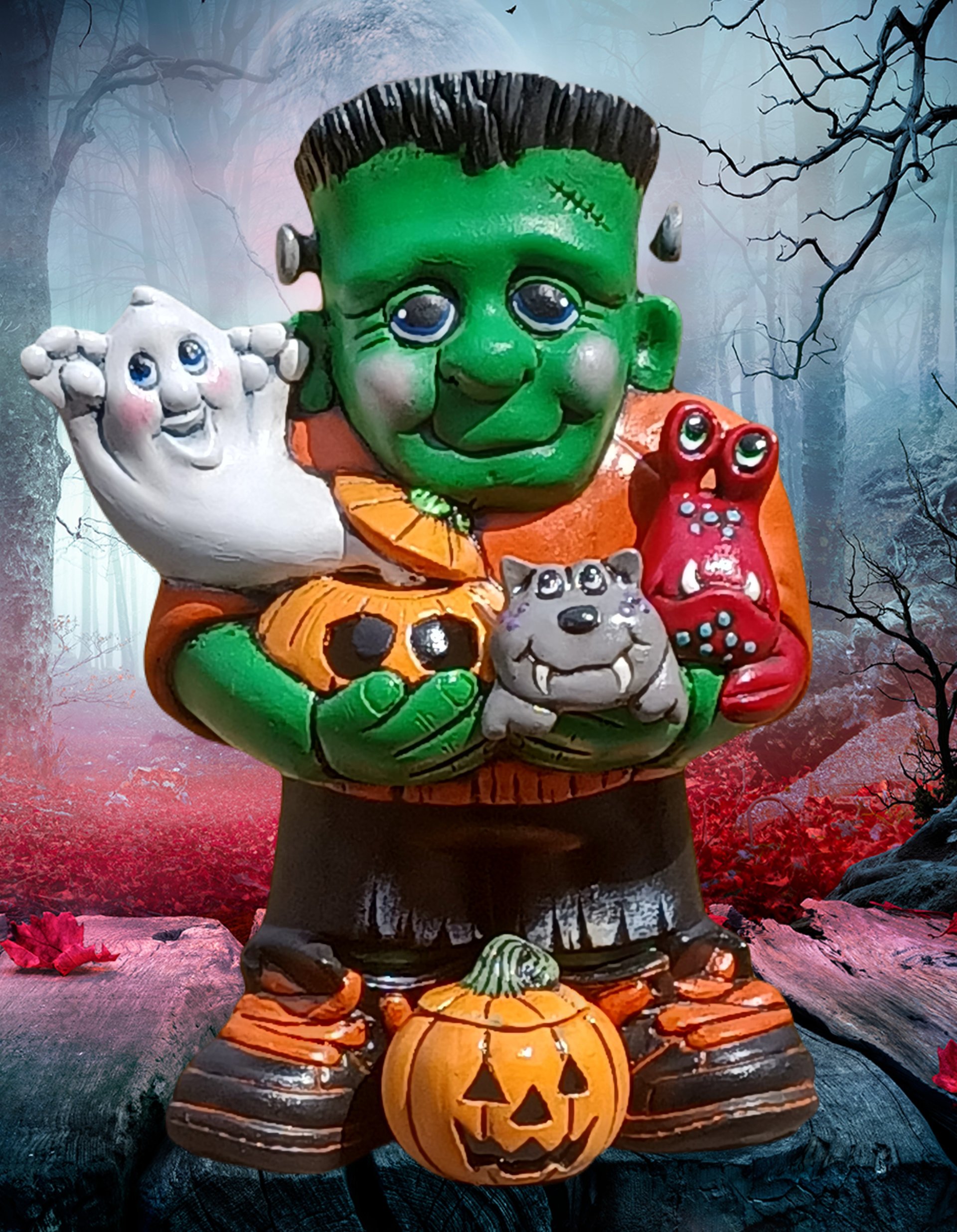 a delightful ceramic piece featuring an adorable Frankenstein Jr. holding four of his little monster buddies. With charming details and a playful design, this piece adds a cute and whimsical touch to your Halloween décor, perfect for those who love a fun spin on classic monsters!