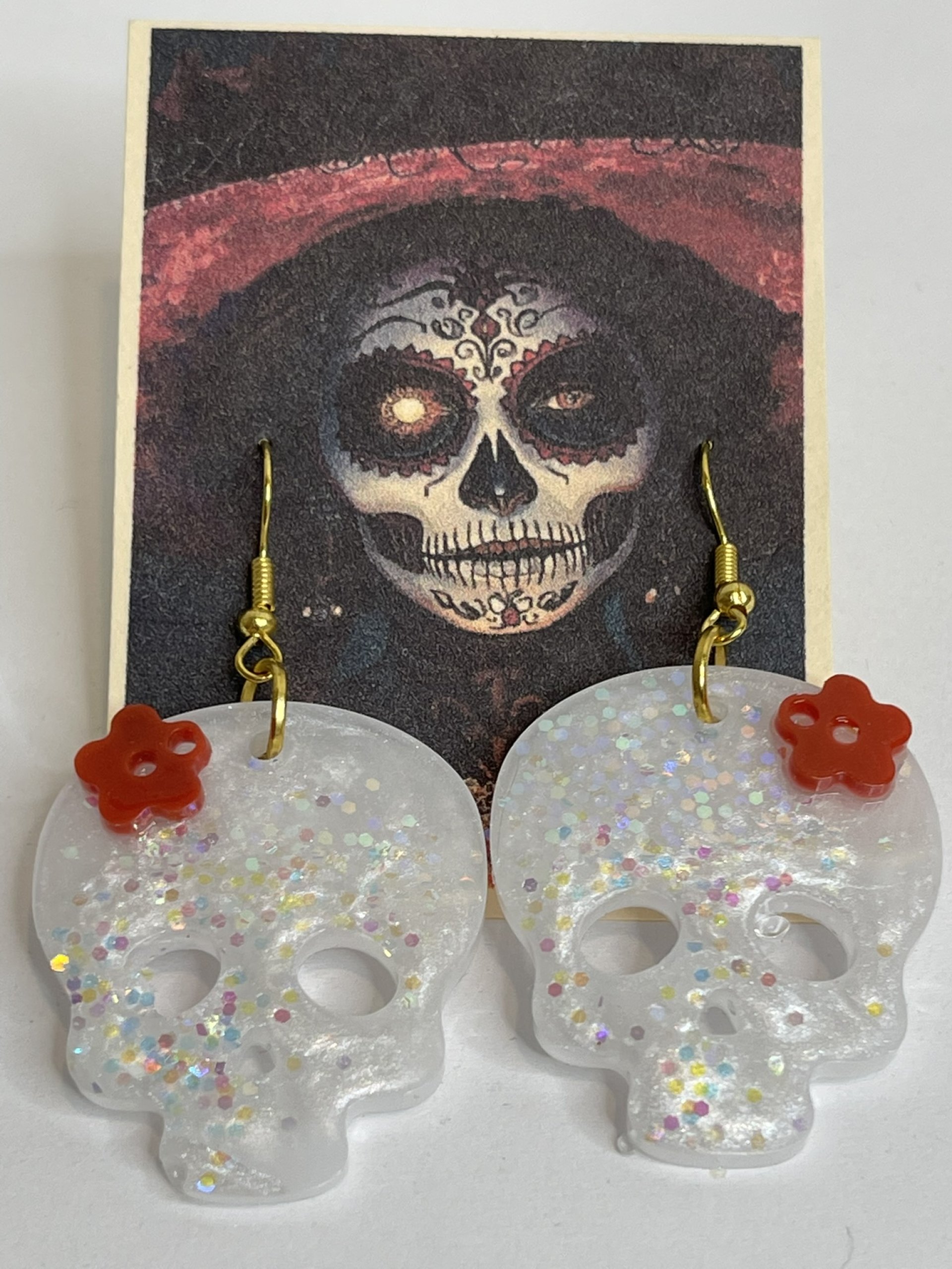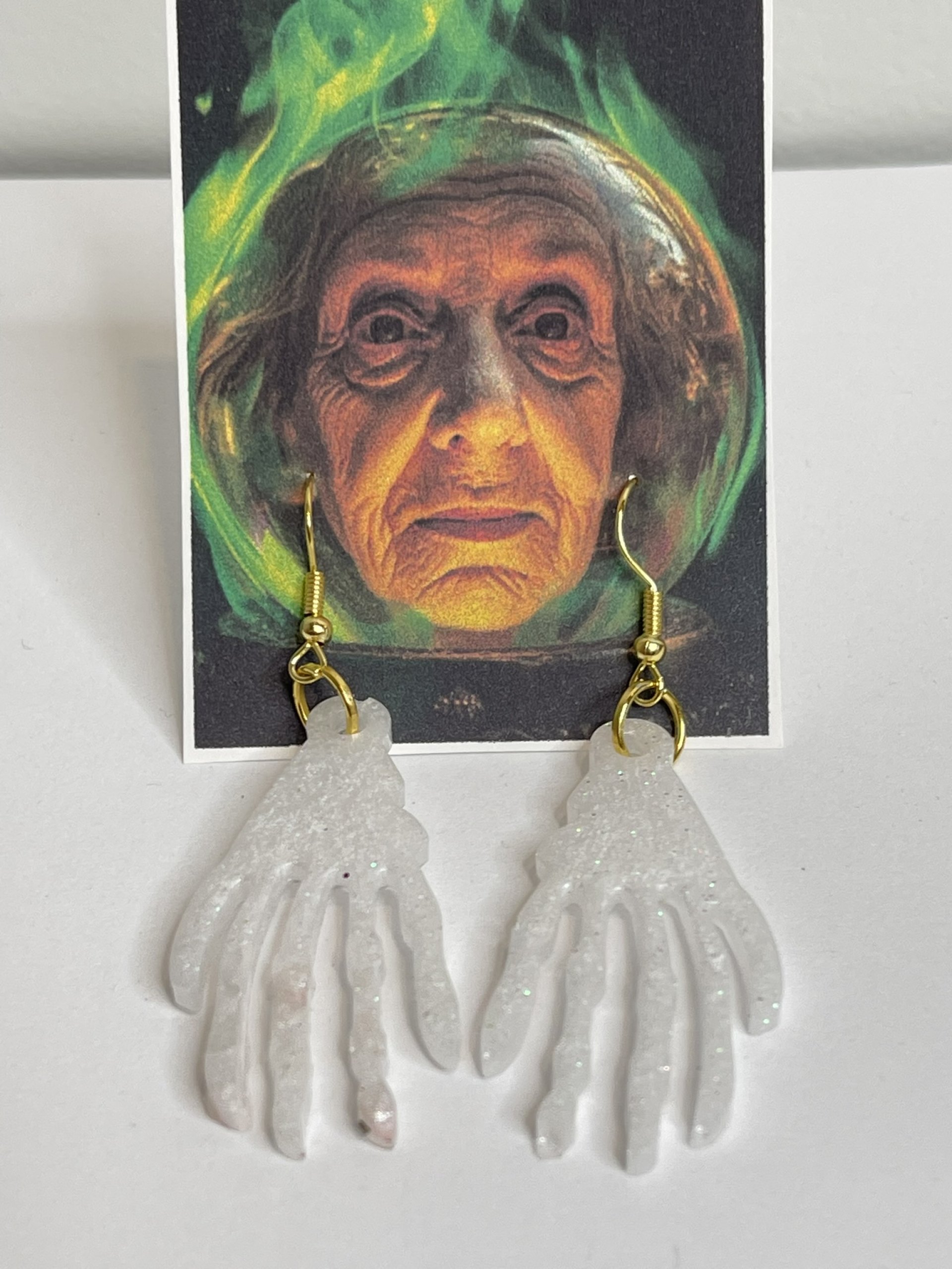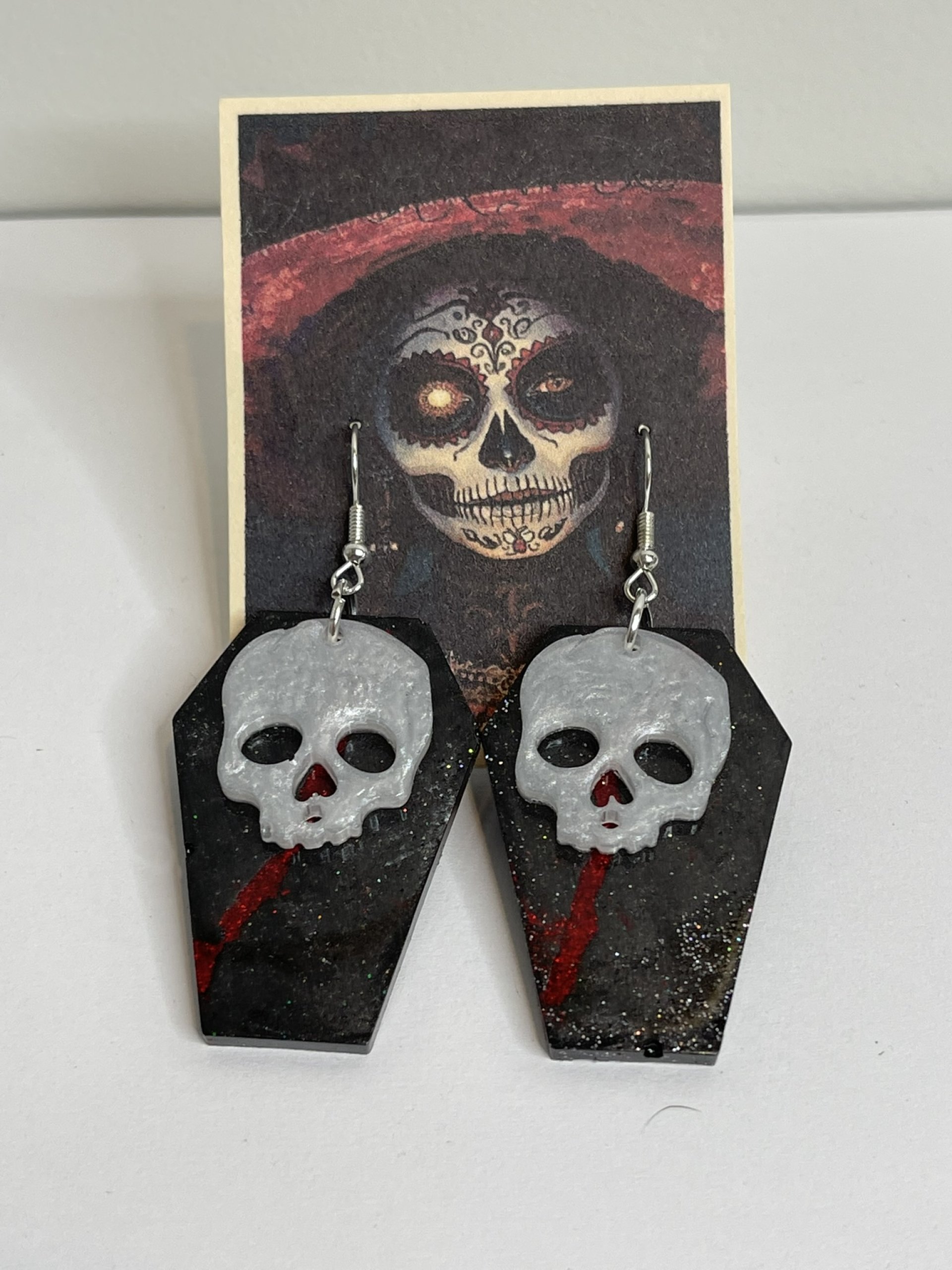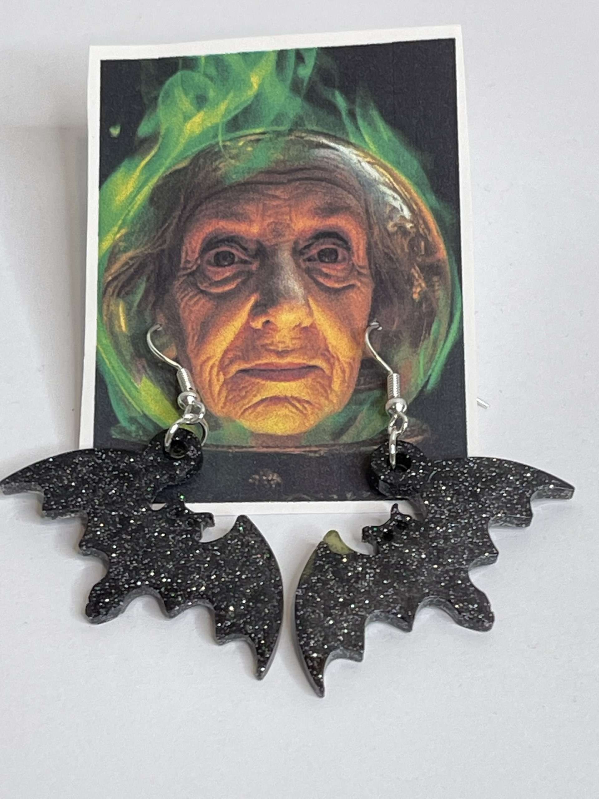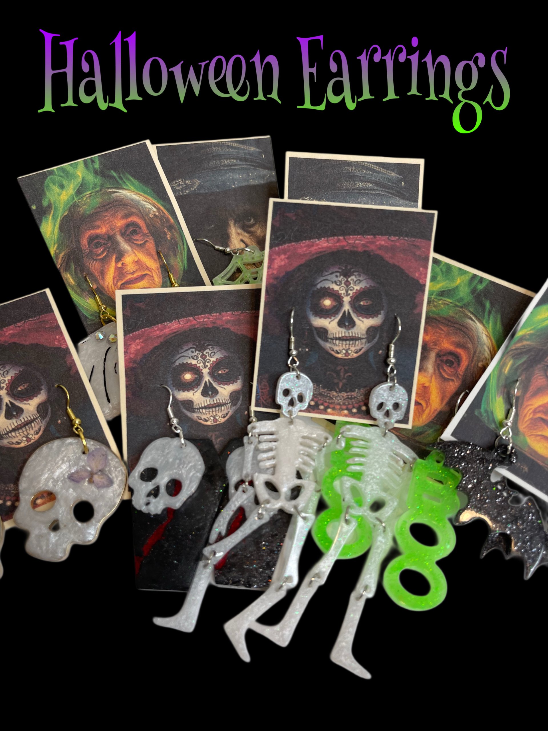 Hand poured array of Halloween-themed earrings. Made with high quality resin, pigments, mica powders, glitters... Each are unique. Findings are made with base metals.