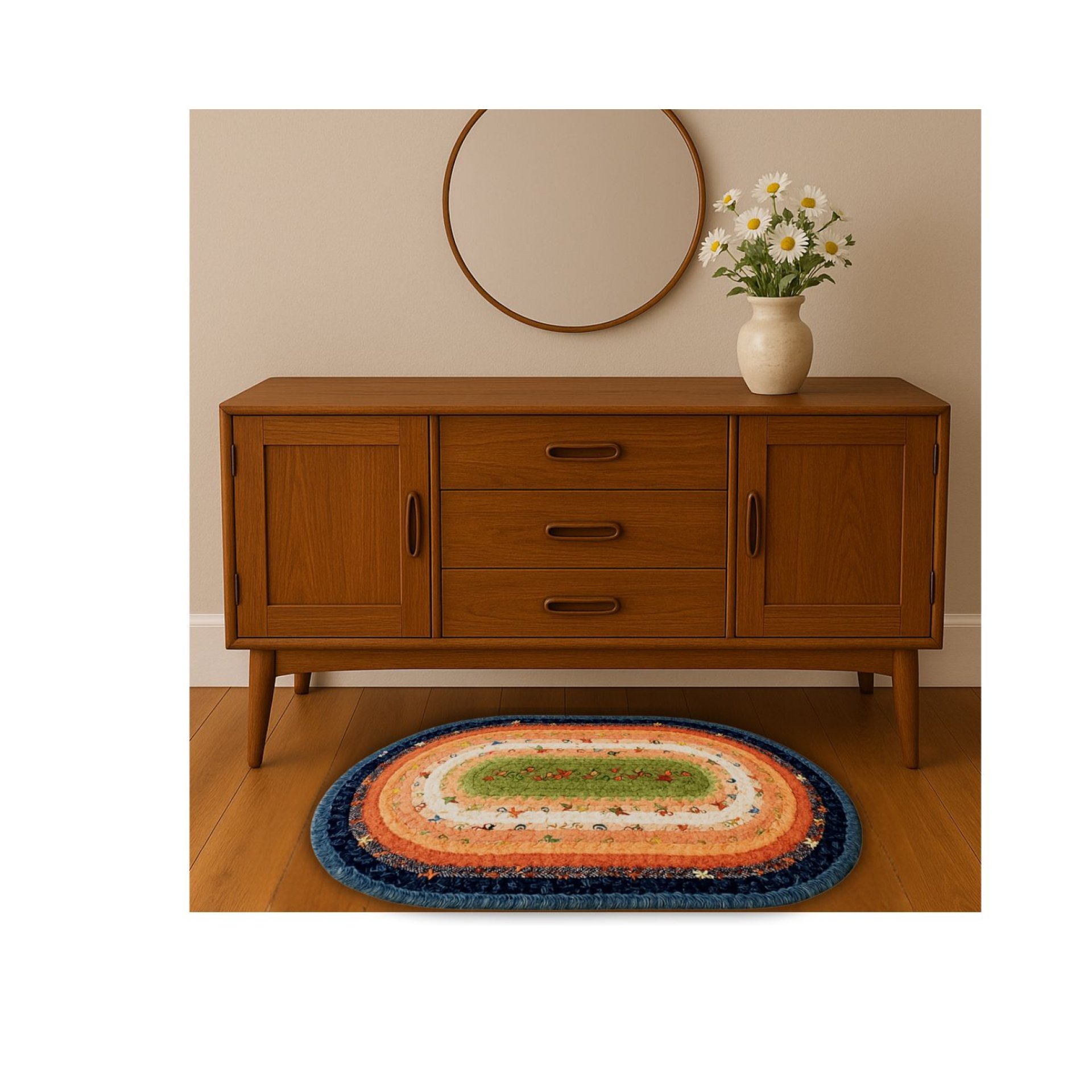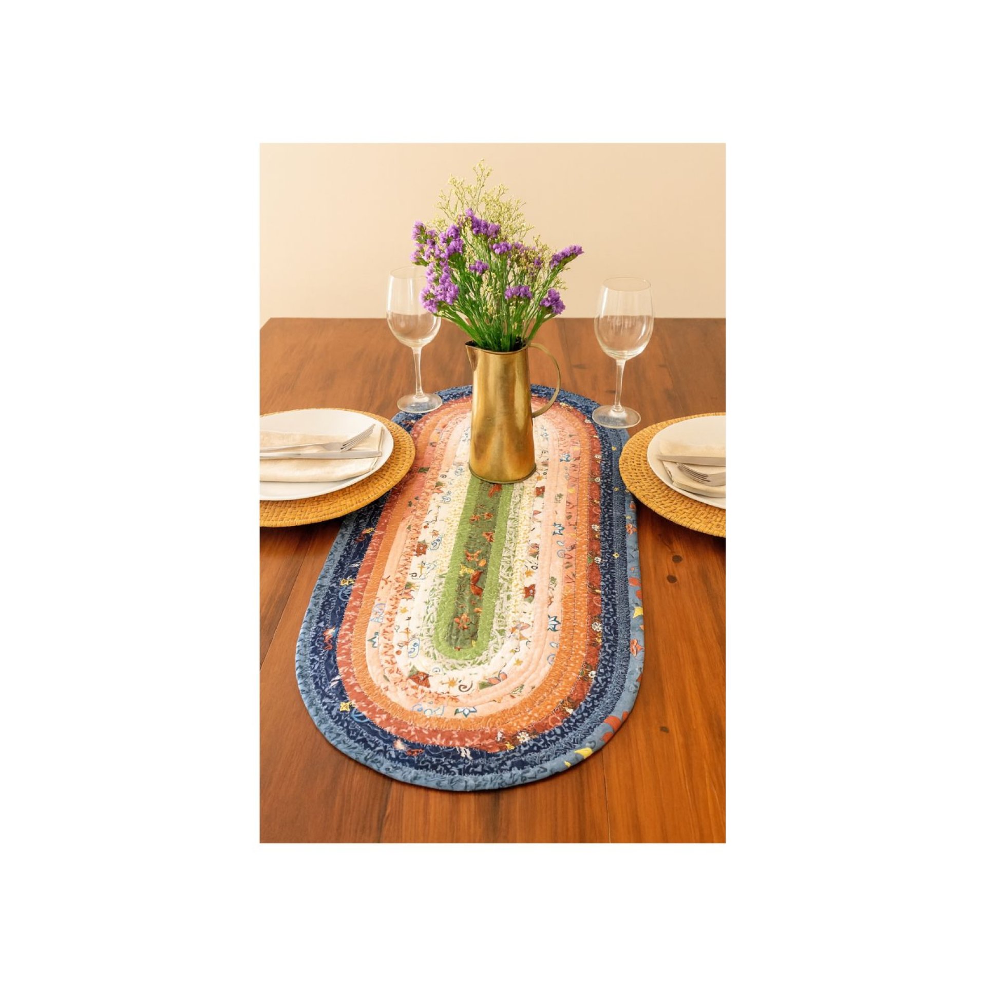 Measuring 35" x 16" with a charming oval shape, Garden Stroll is a handmade cotton quilt-like rug that captures the essence of a peaceful walk through blooming greenery. Its soft layers of green, peach, coral, ivory, and deep blue are patterned with whimsical florals and butterflies, creating a warm, inviting accent for any home. Versatile in use, this piece can serve beautifully as a table runner, adding color and texture to your dining or buffet table, or as a small accent rug in an entryway, reading nook, or bedroom. The cottage-core design brings both comfort and nostalgia—reminiscent of timeless handcrafted textiles that brighten a room with character and charm.