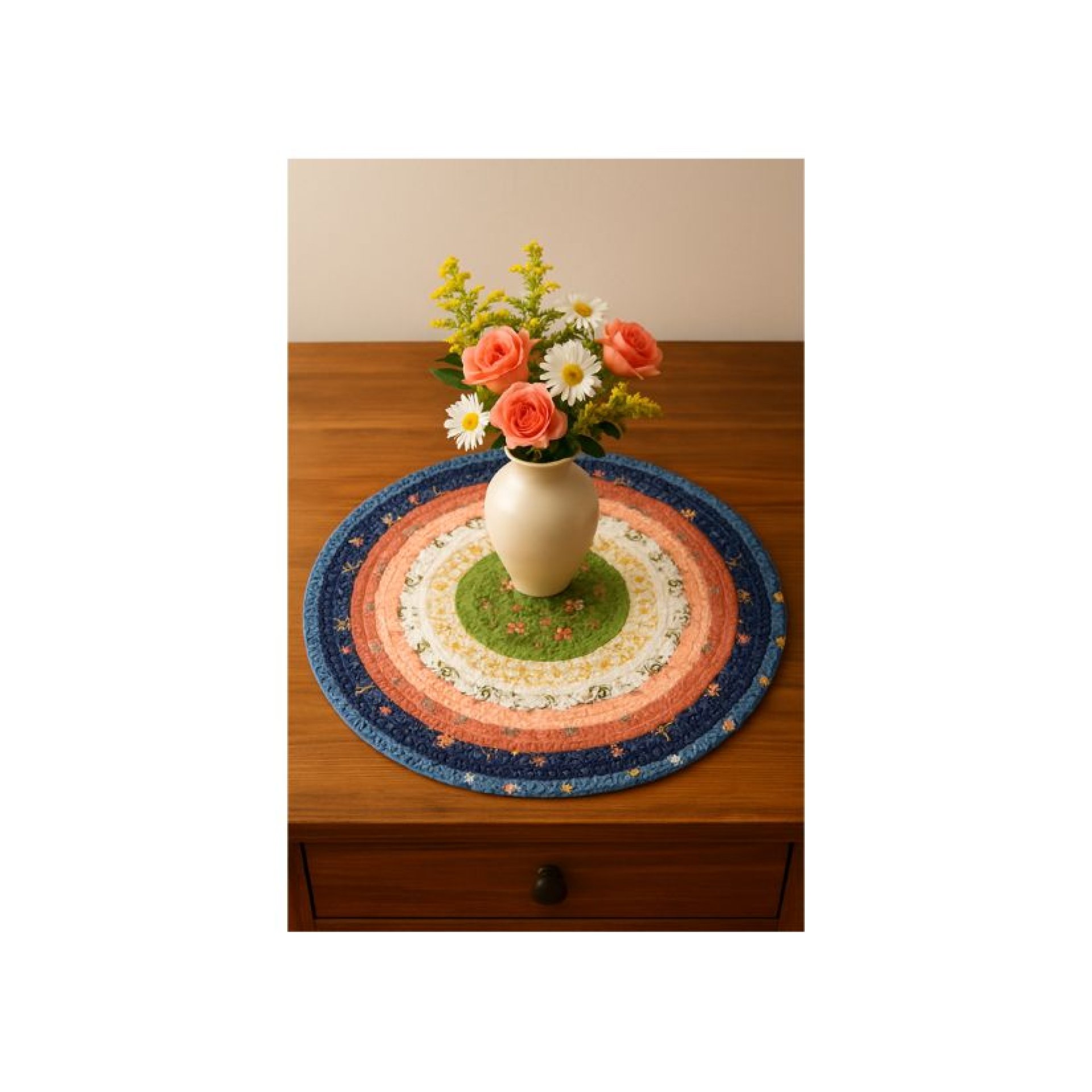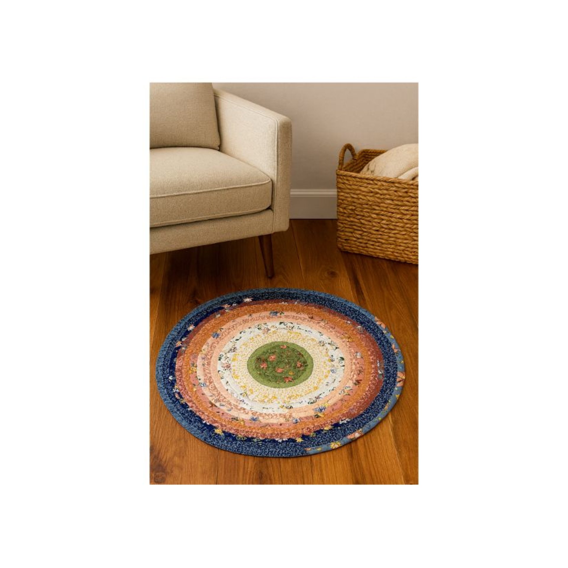 Garden Stroll measures 25" in diameter and is a handmade round cotton rug that captures the charm of a quiet walk through blooming gardens. Its concentric bands of soft greens, warm corals, ivory, gold, and deep blues are accented with floral and butterfly patterns, creating a cheerful yet timeless cottage-core design. This versatile piece adds warmth and personality wherever it’s placed—perfect as a small accent rug in an entryway, bedroom, or reading nook, or even as a table topper for showcasing seasonal décor. With its vibrant colors and handcrafted detail, Garden Stroll brings both comfort and artistry into your home, inviting the feeling of strolling through a sunlit garden path.