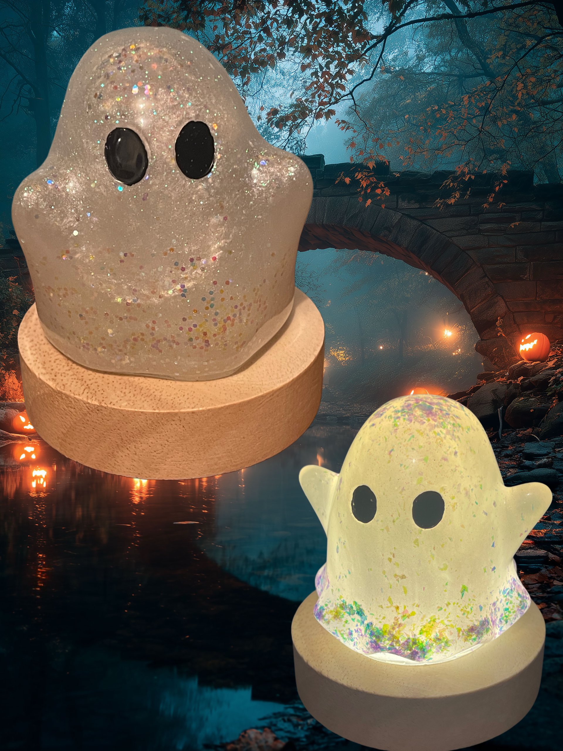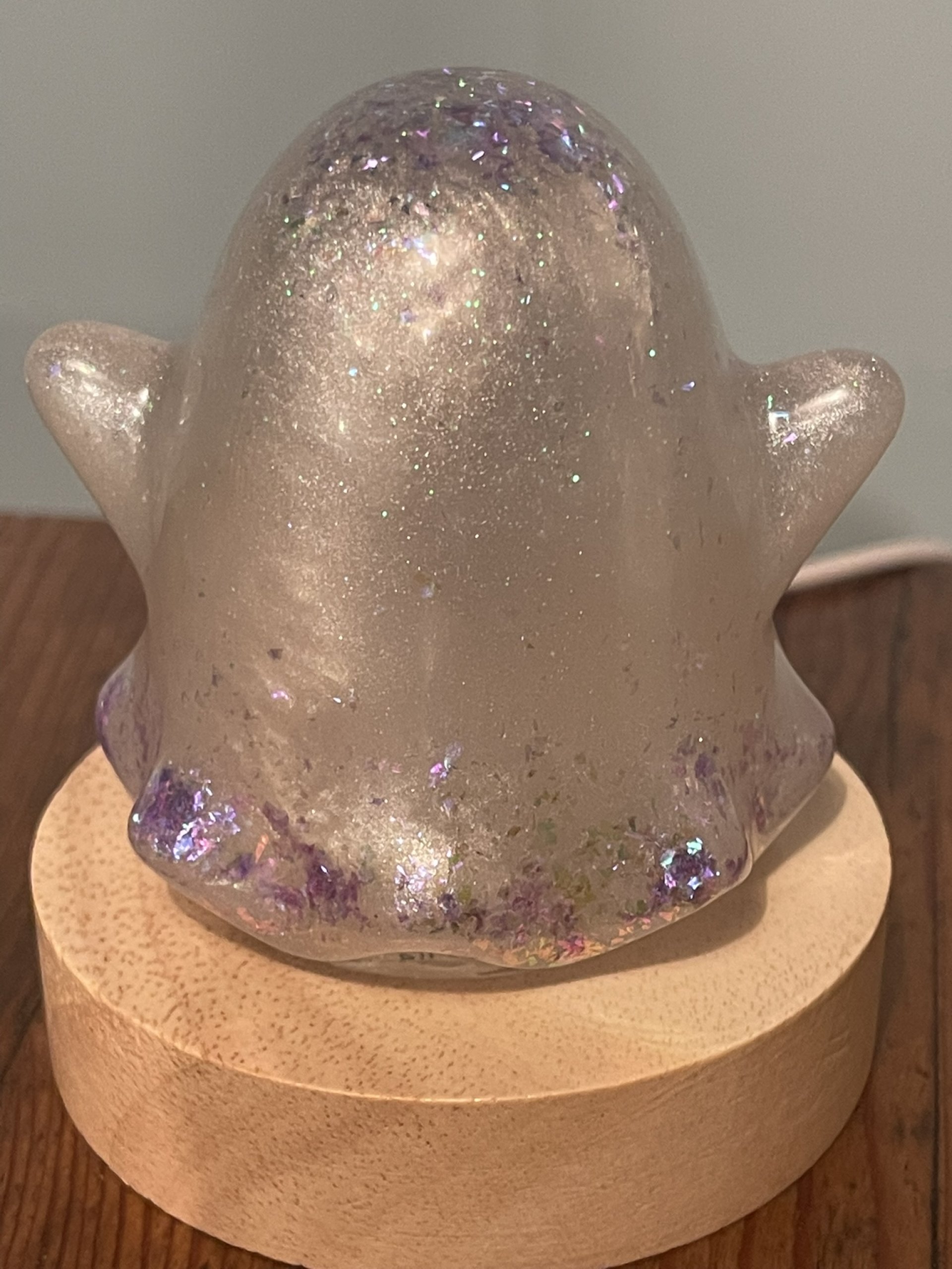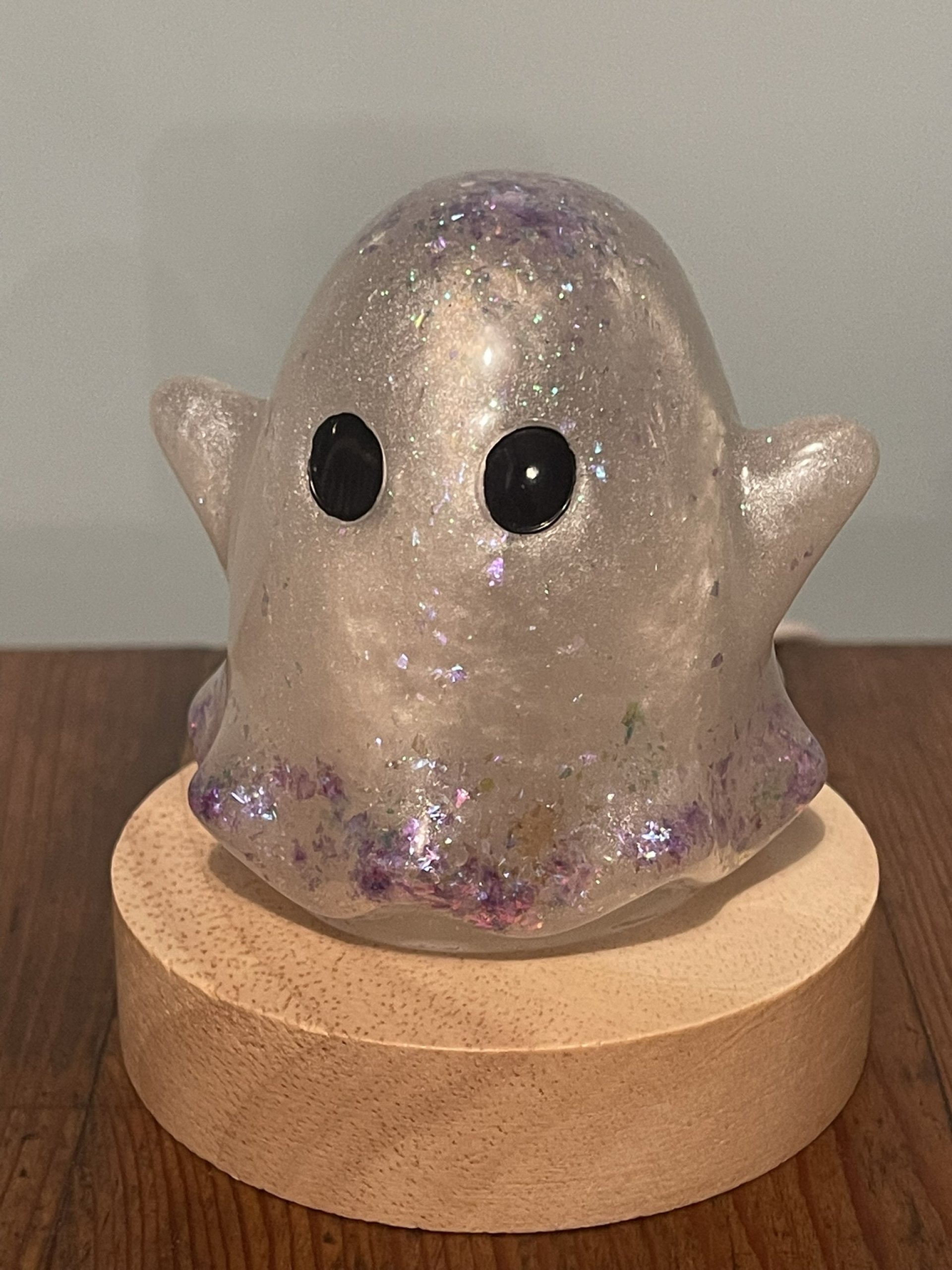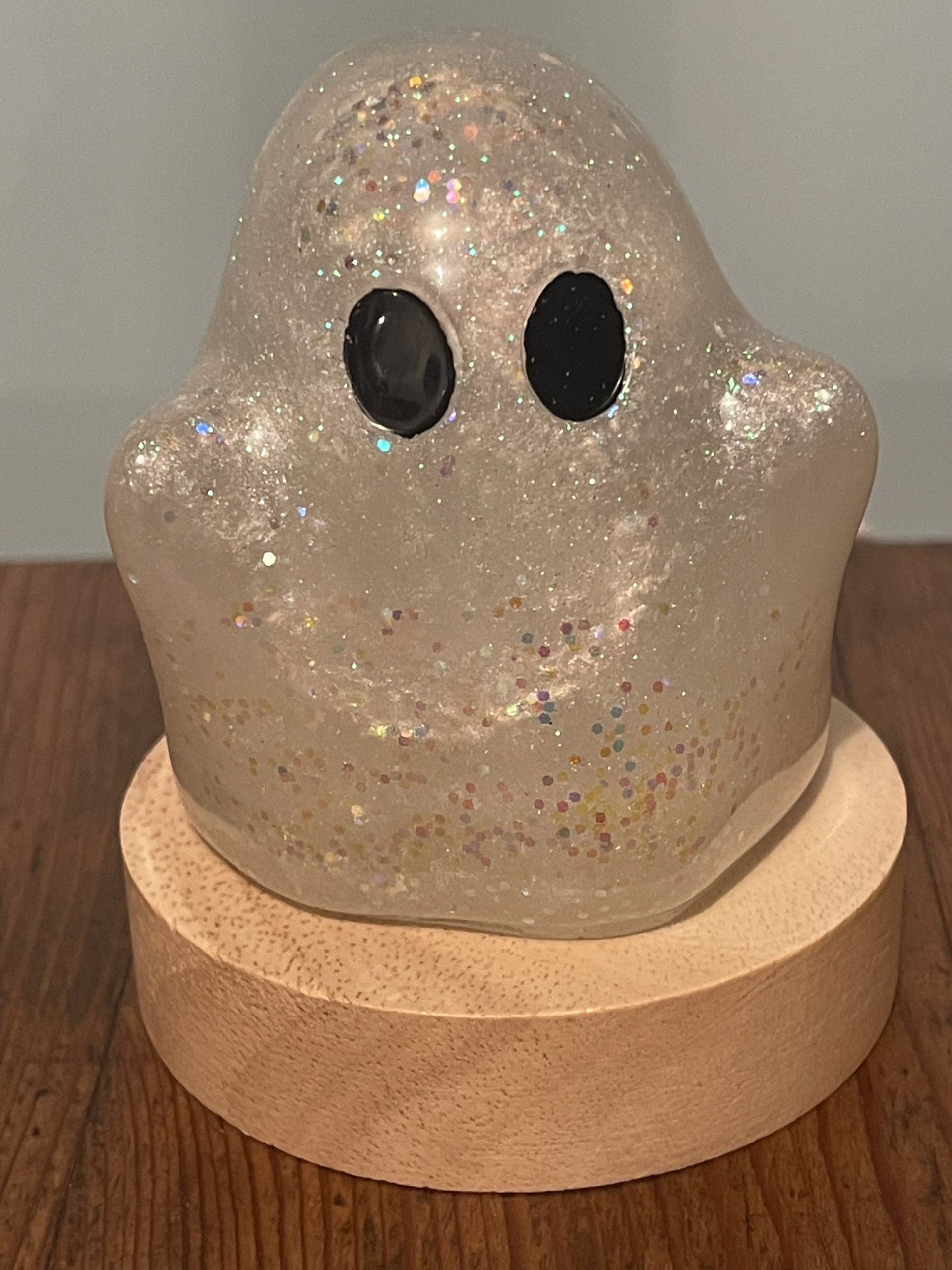 These adorable ghosts are handmade. There are two styles to choose from. Be sure to note the differences. They also have various coloring or glitters added. So choose wisely! If I run out, I can make more and can make to your specification and can personalize. (Custom pieces may require additional charge).