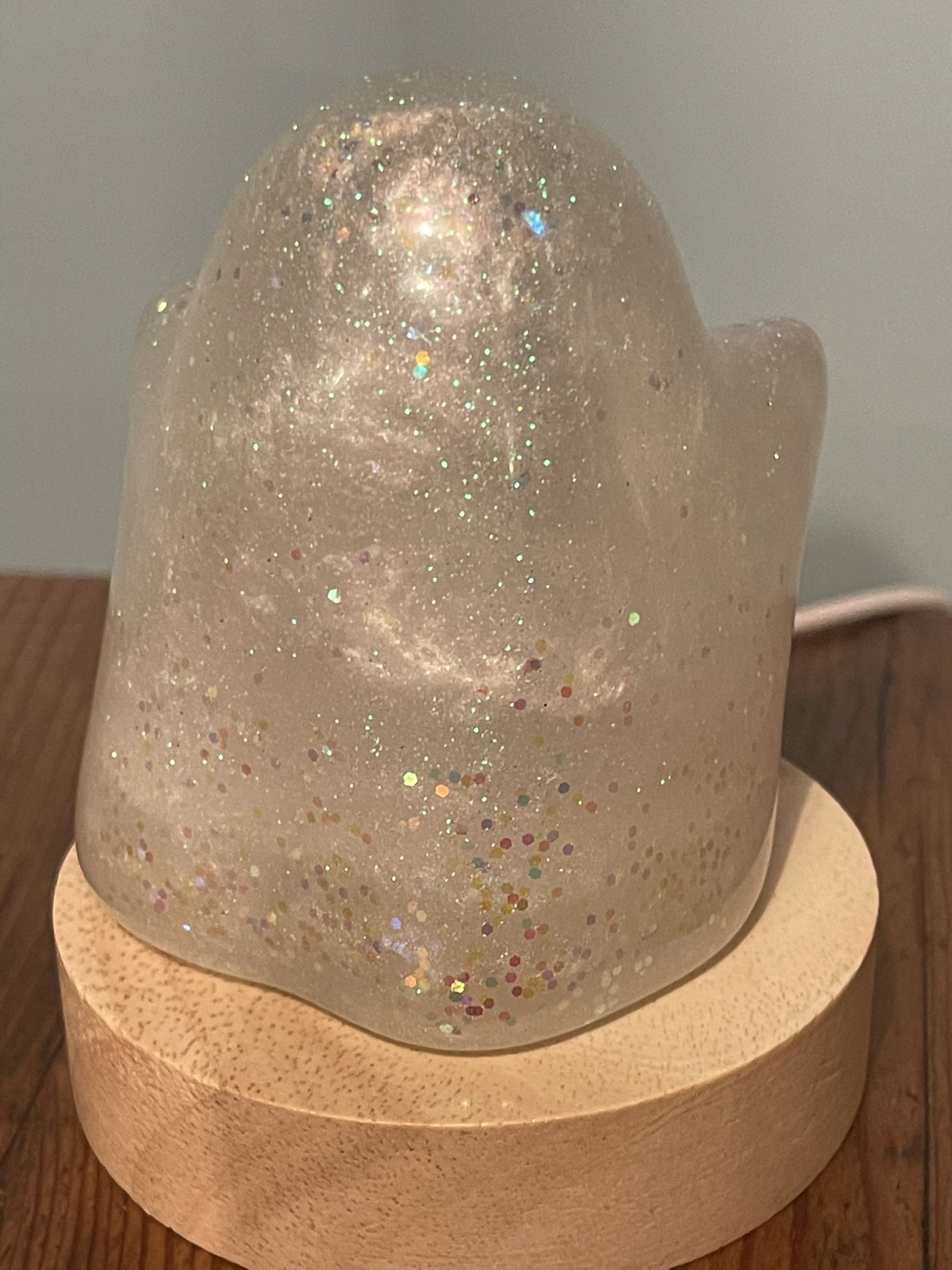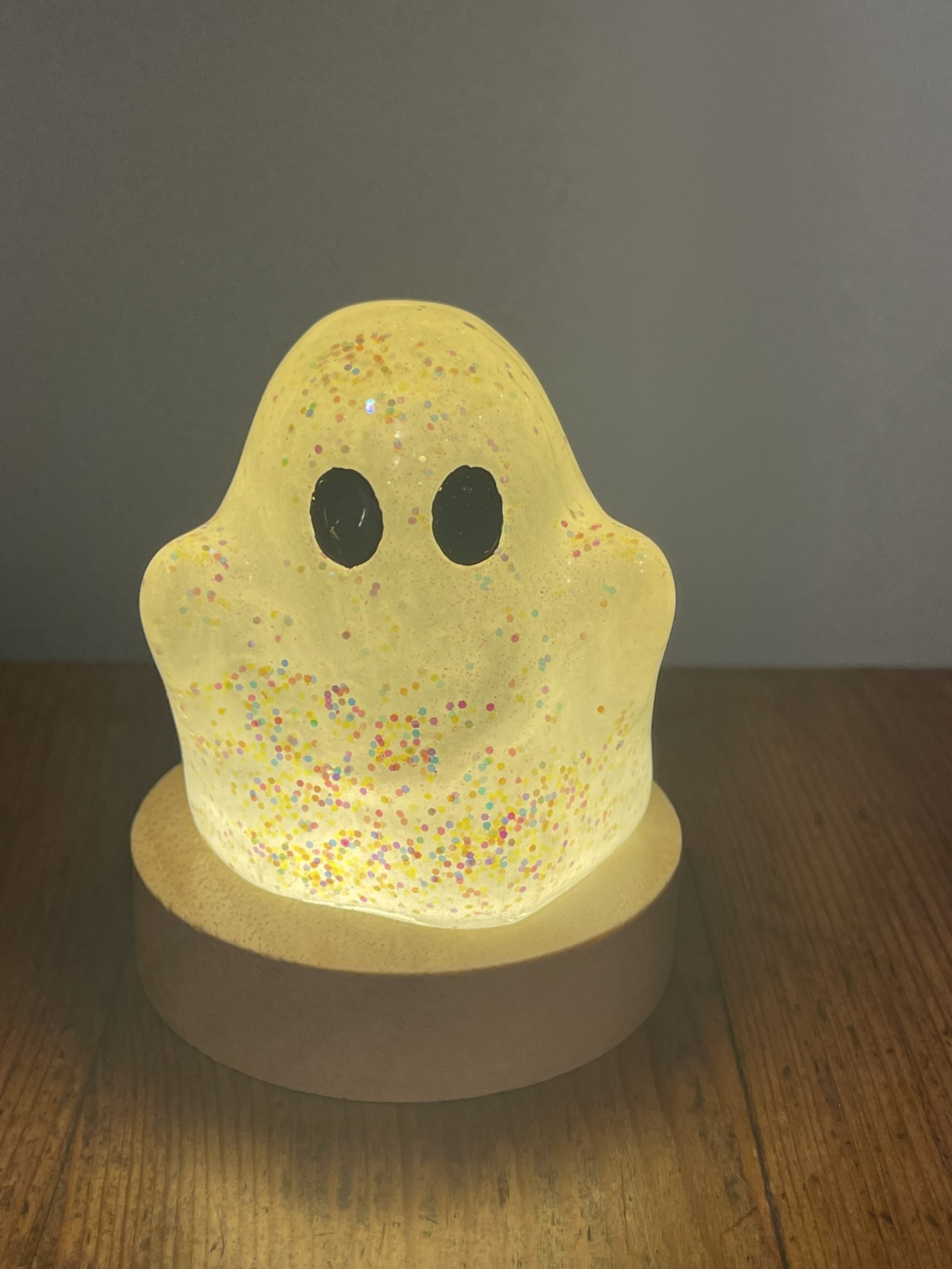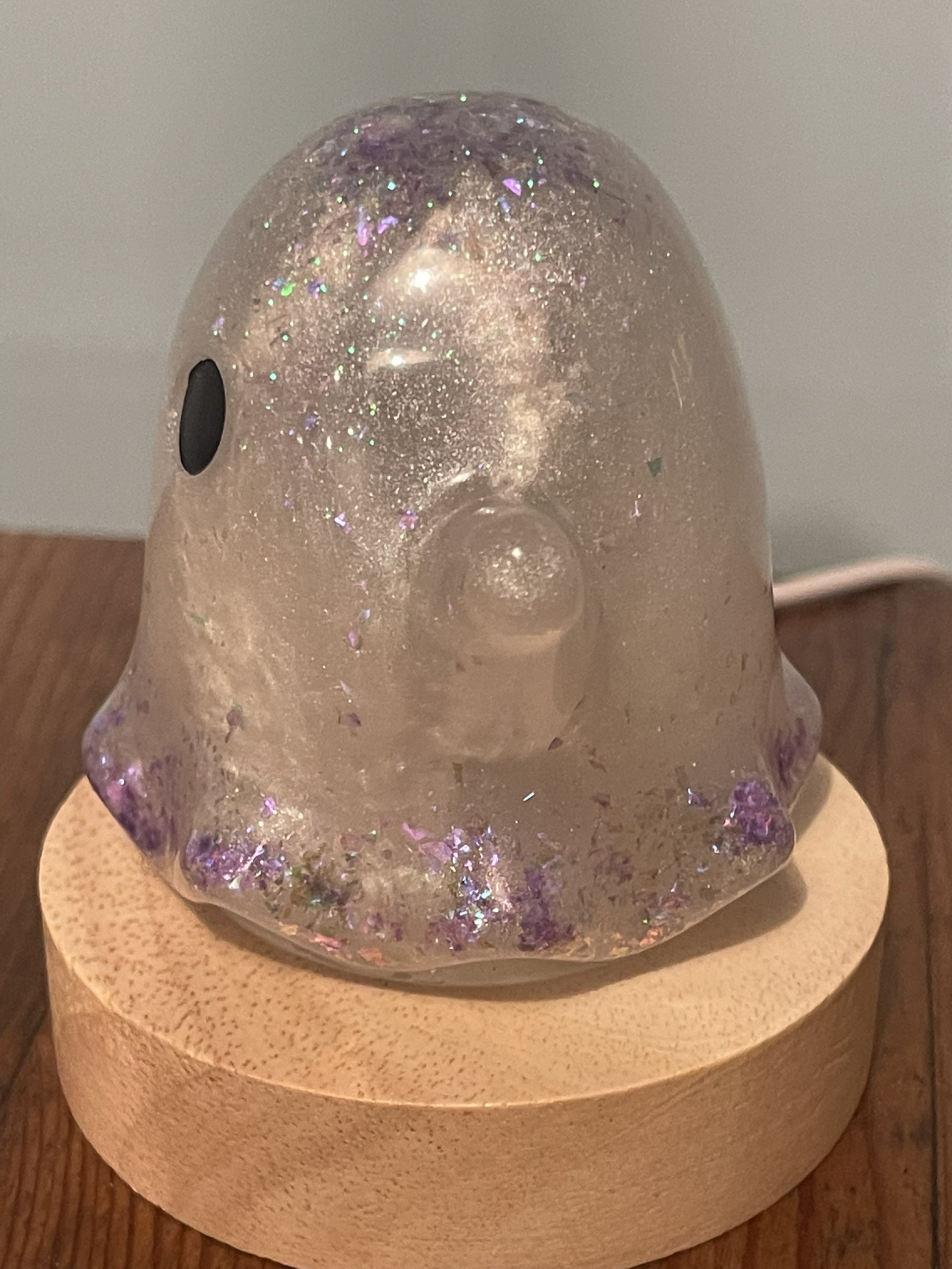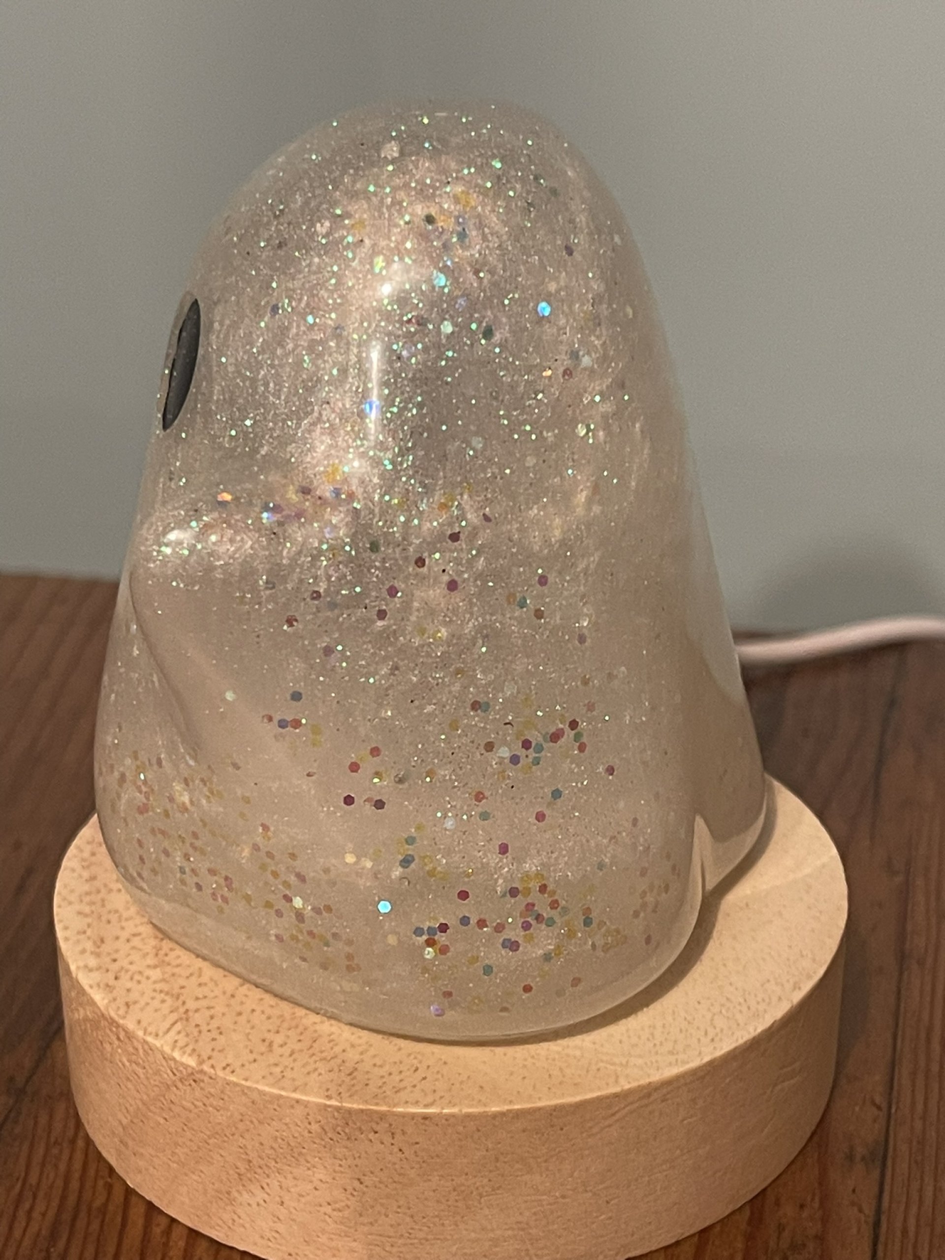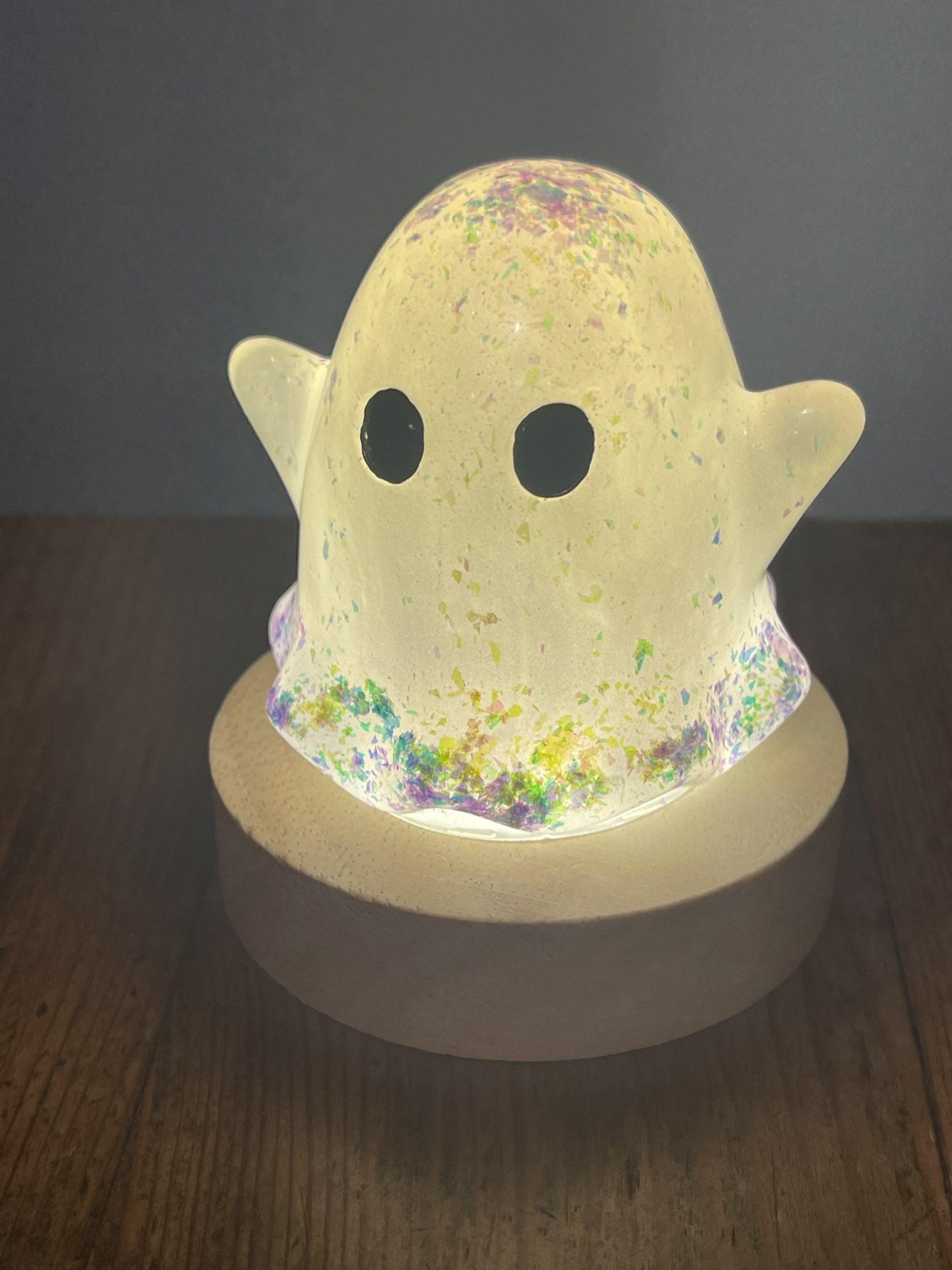 These adorable ghosts are handmade. There are two styles to choose from. Be sure to note the differences. They also have various coloring or glitters added. So choose wisely! If I run out, I can make more and can make to your specification and can personalize. (Custom pieces may require additional charge).