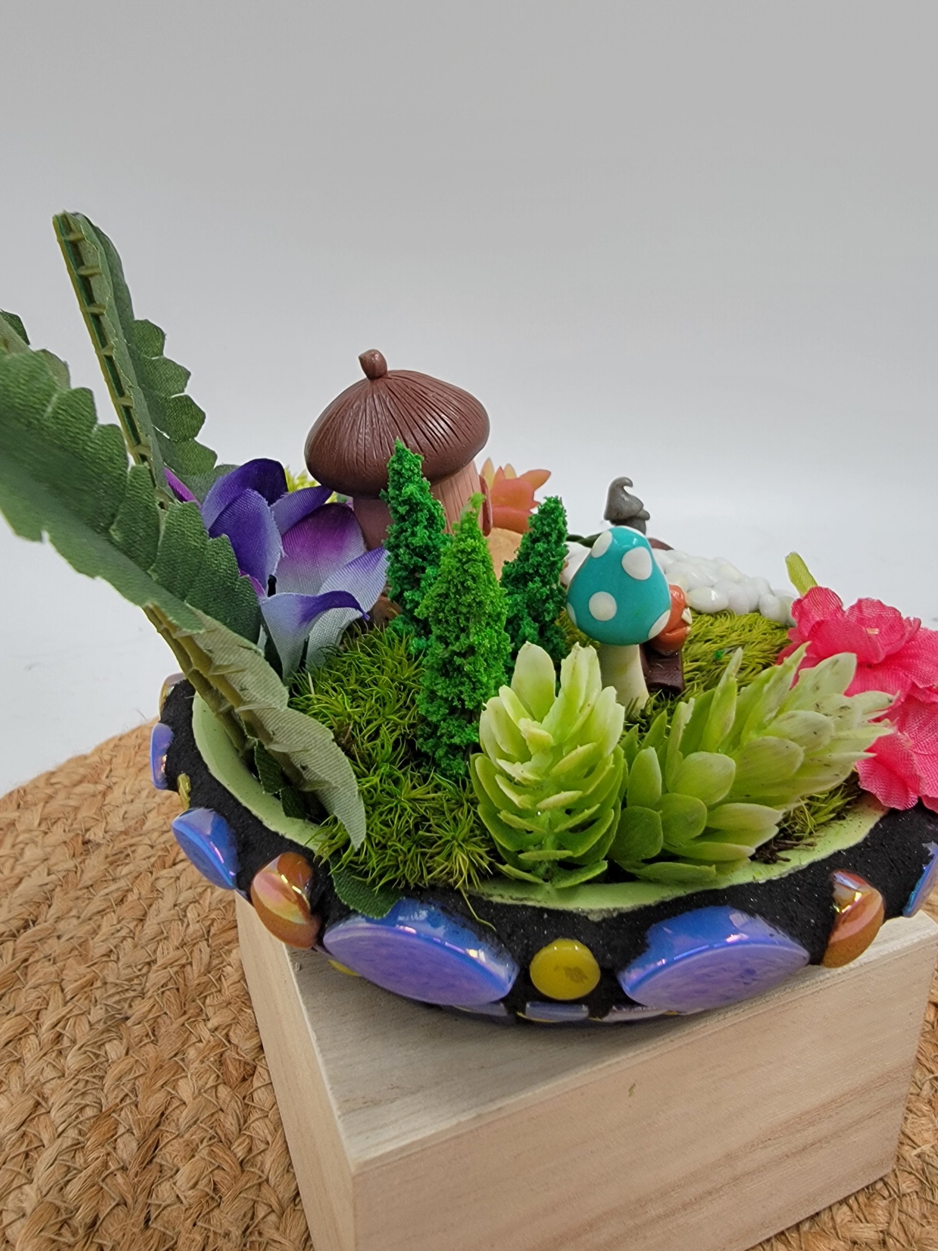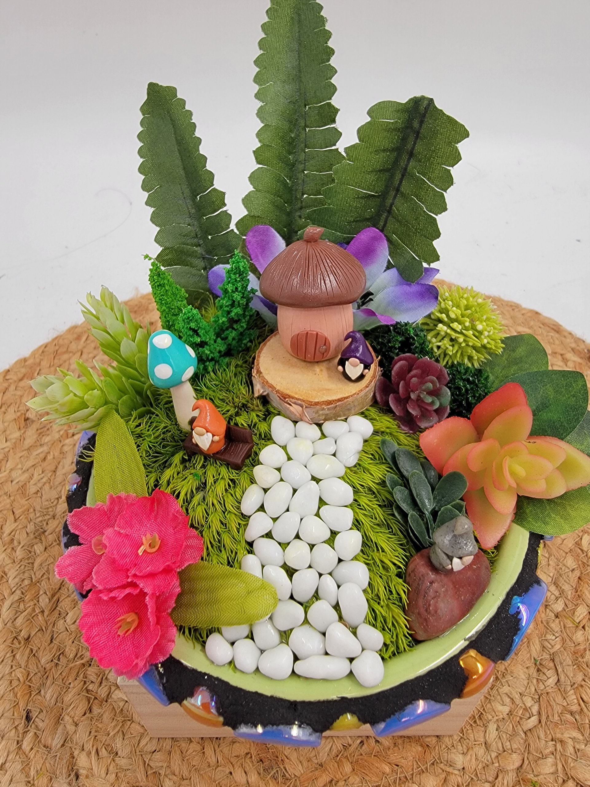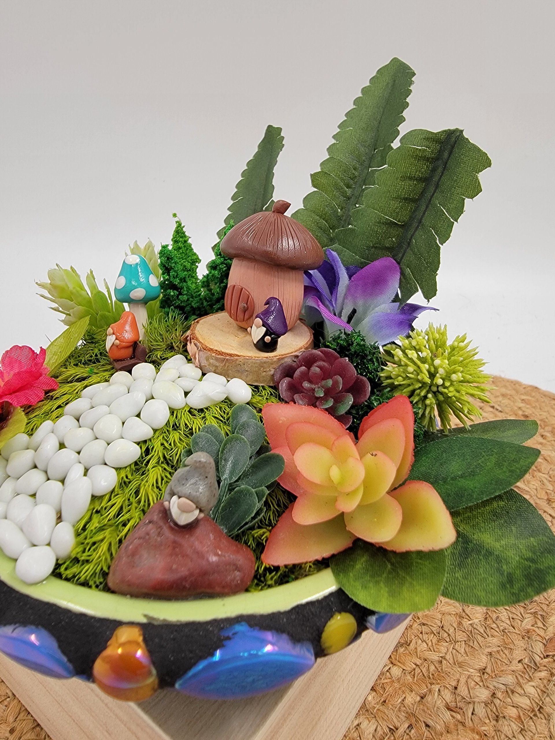 Bring a touch of whimsy to your space with this handcrafted gnome garden diorama. This miniature scene features tiny, hand-sculpted clay gnomes and an adorable acorn-shaped gnome house, set amidst lush preserved moss, silk flowers, and faux plants.