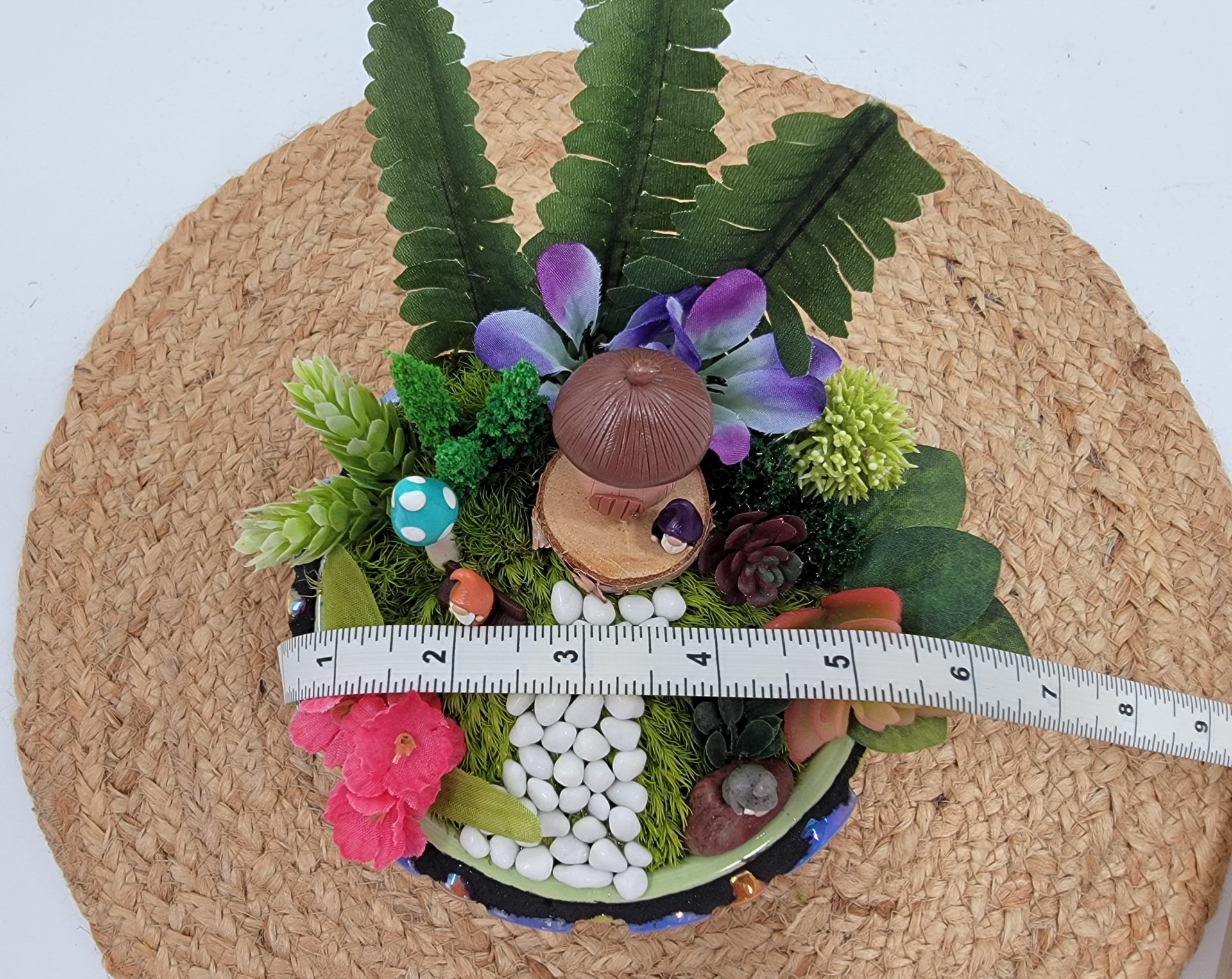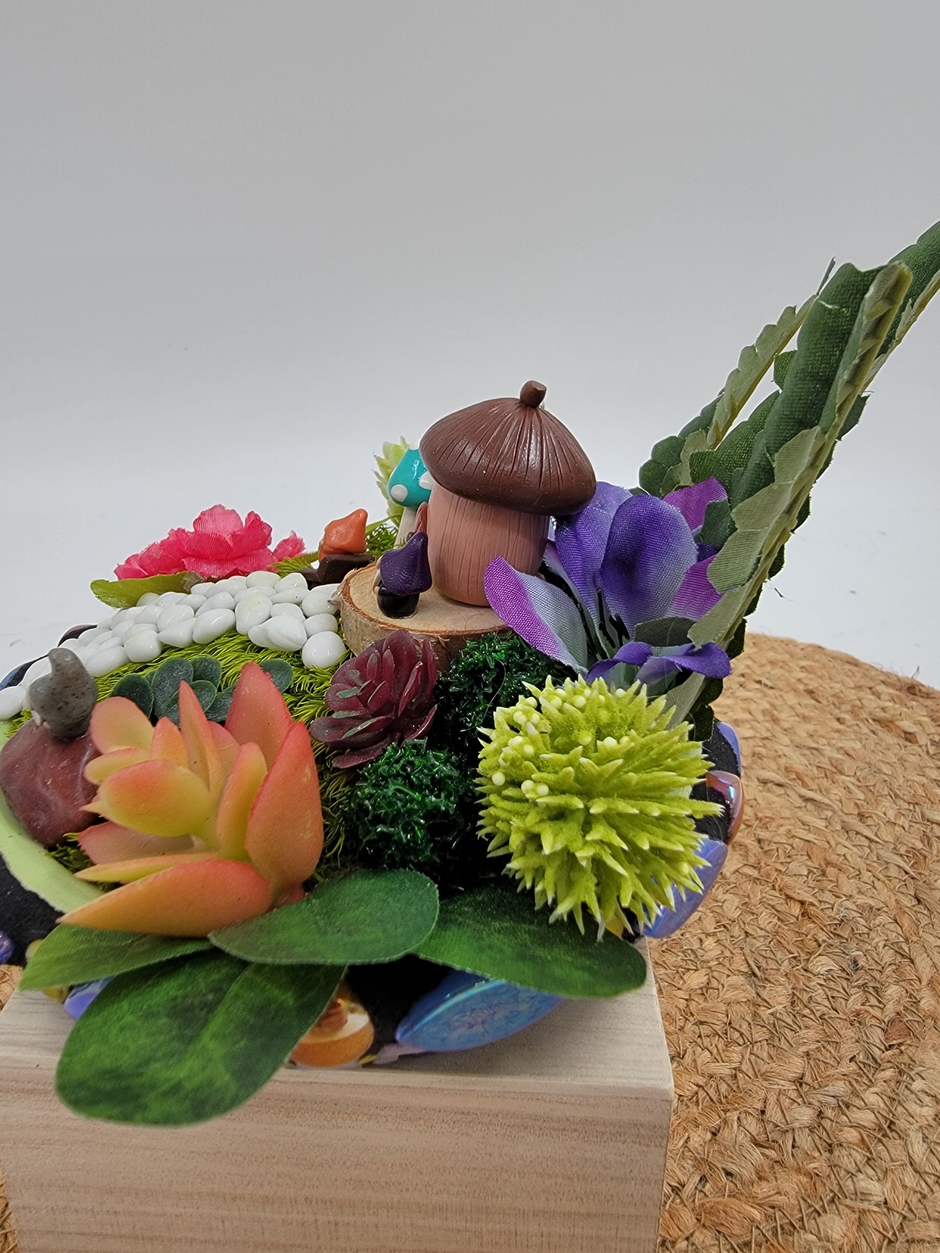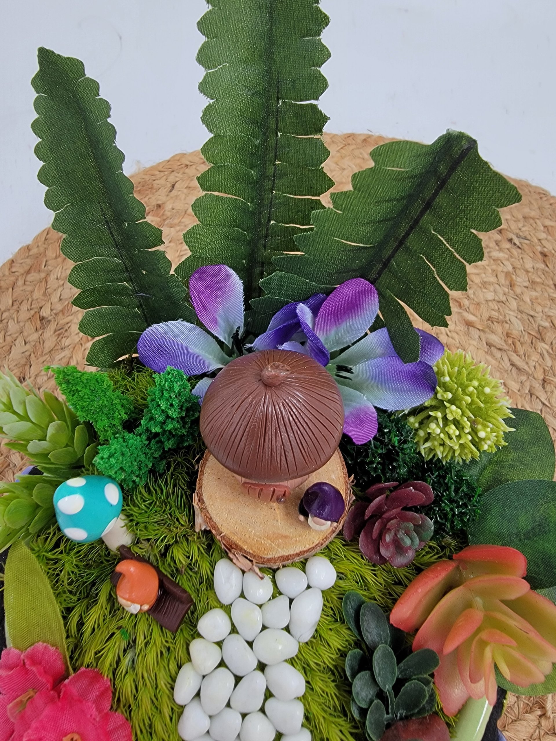 Bring a touch of whimsy to your space with this handcrafted gnome garden diorama. This miniature scene features tiny, hand-sculpted clay gnomes and an adorable acorn-shaped gnome house, set amidst lush preserved moss, silk flowers, and faux plants.
