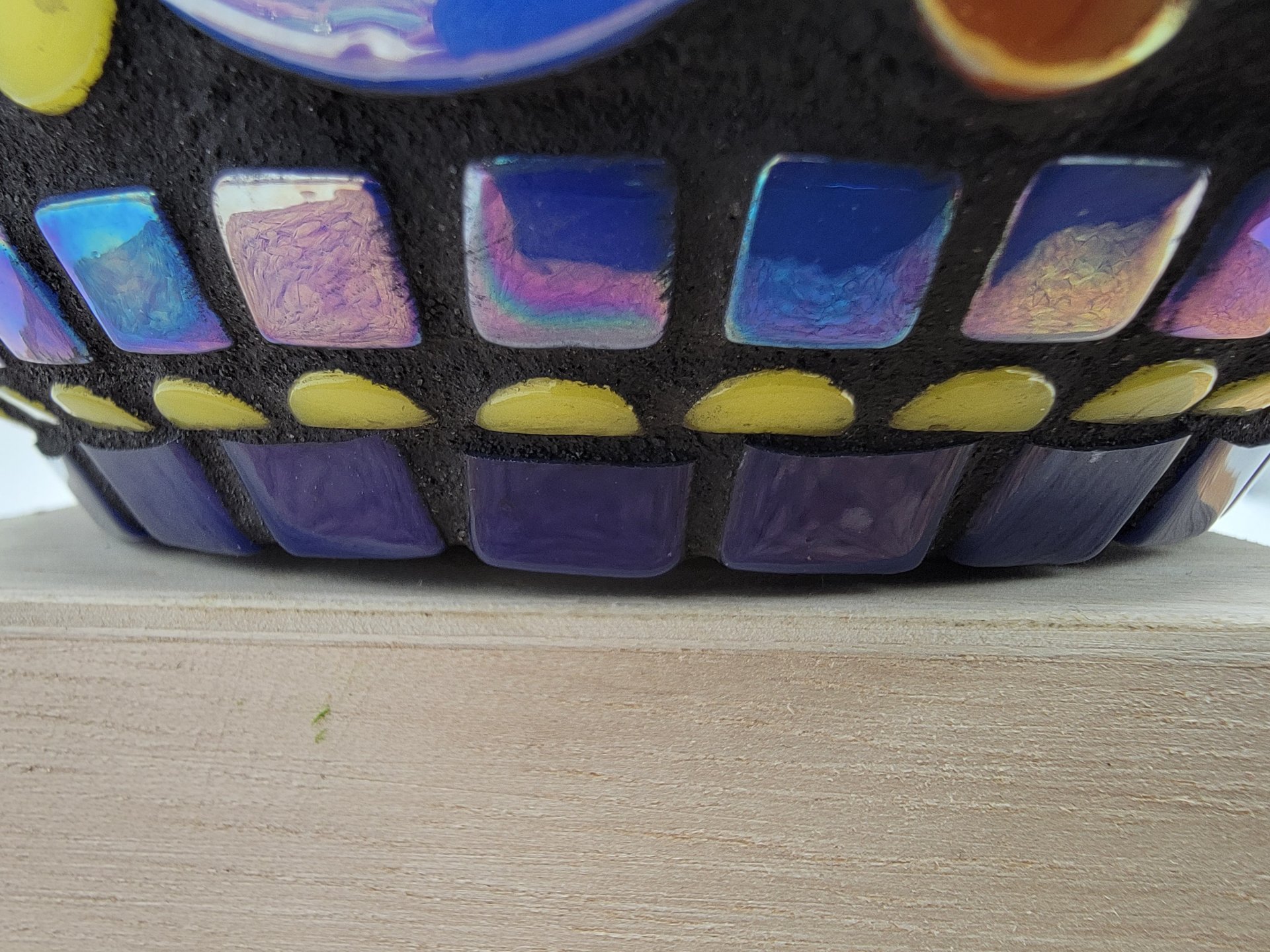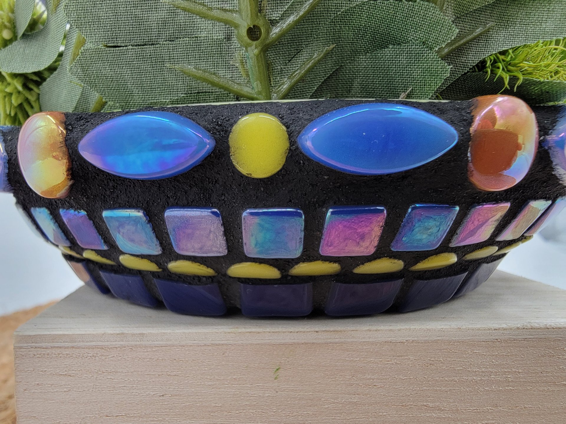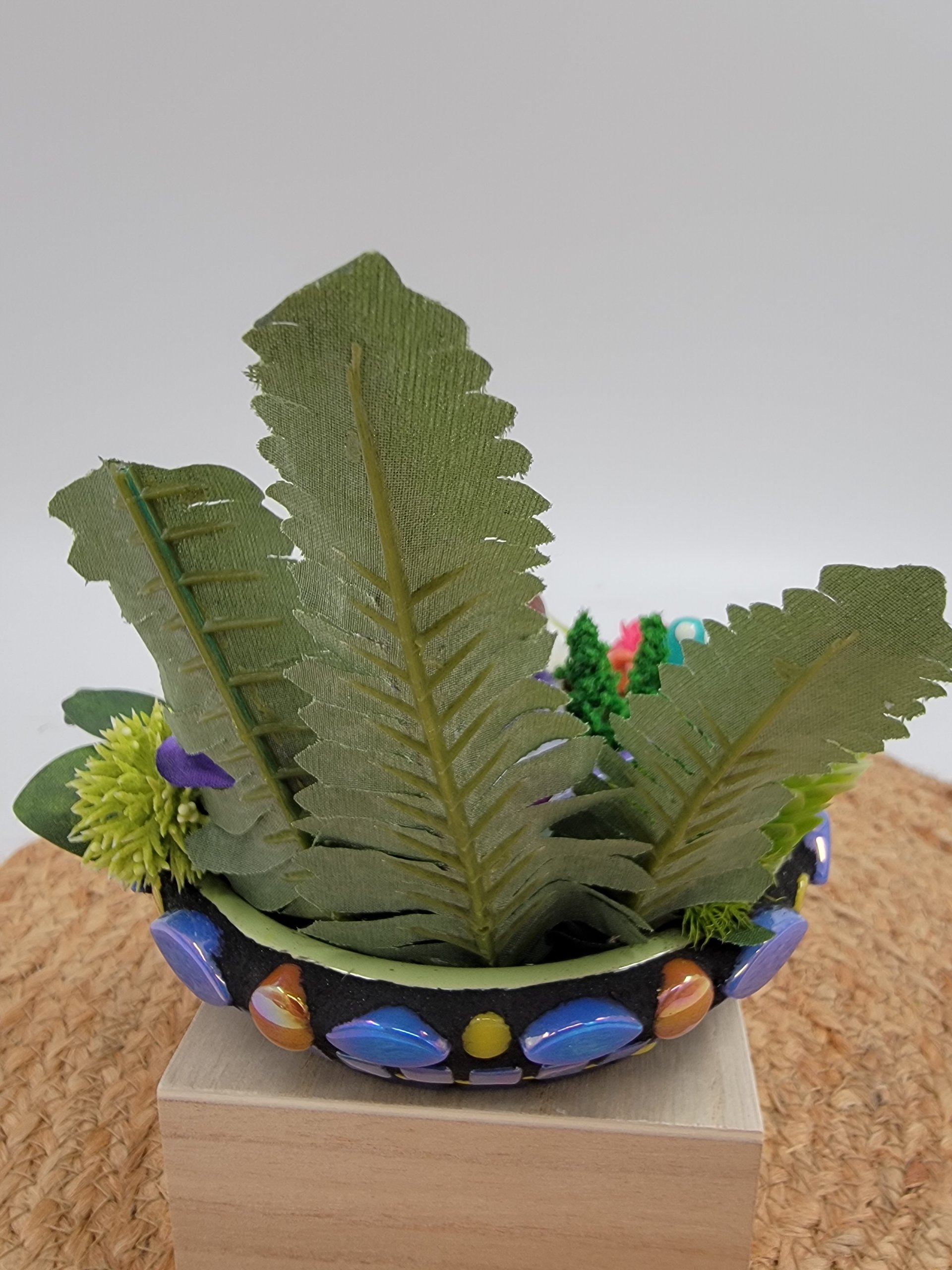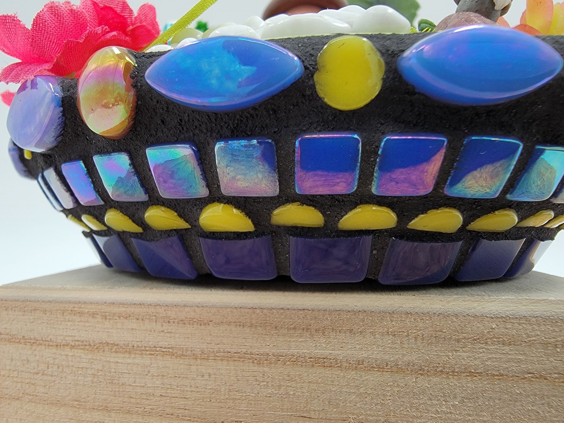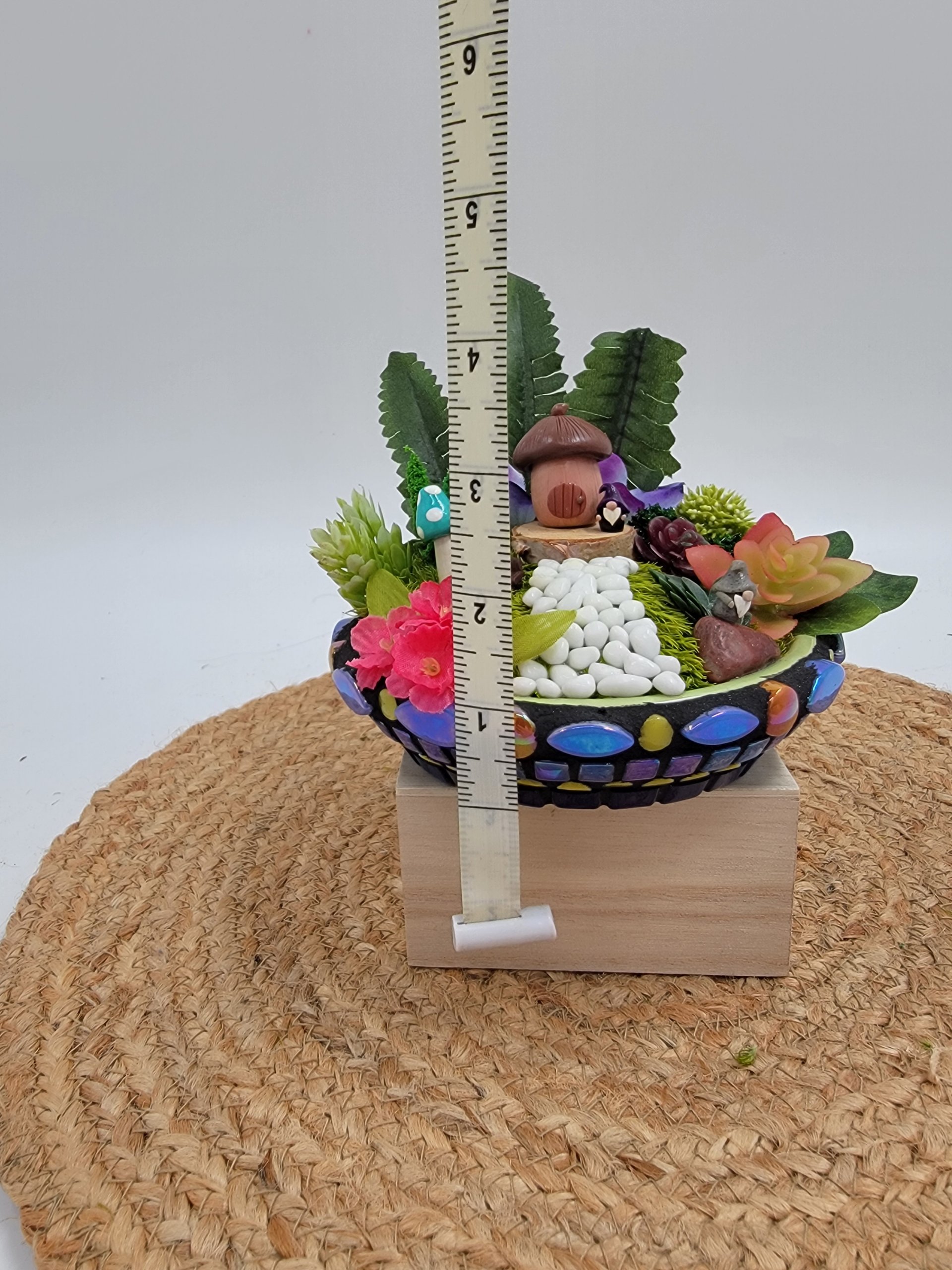 The carefully designed landscape includes a winding white pebble pathway leading up to the gnome’s doorstep, surrounded by vibrant succulents, mushrooms, and charming woodland details. The entire arrangement is securely set in a sturdy ceramic bowl adorned with a dazzling mosaic of shiny glass pieces, giving it a magical glow.