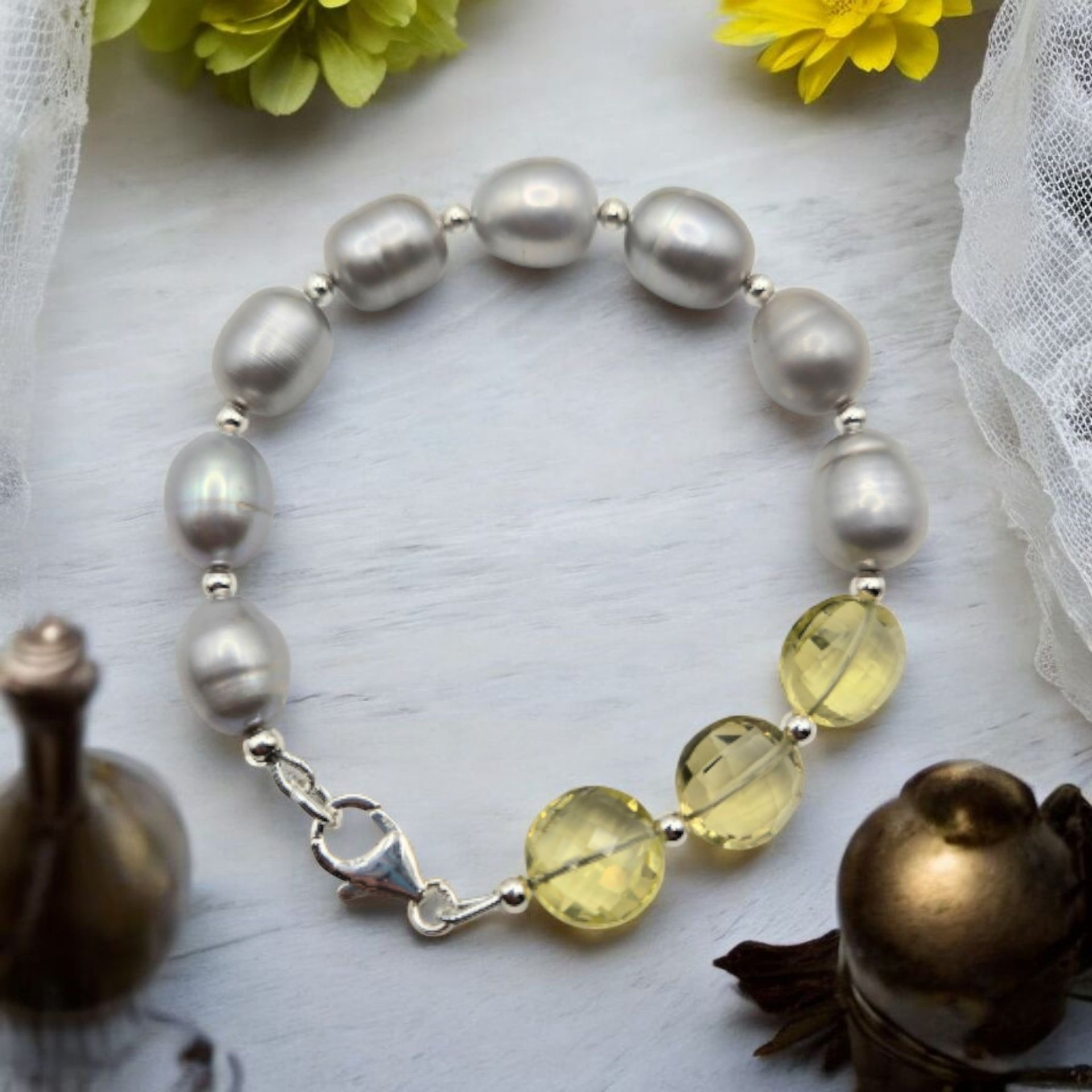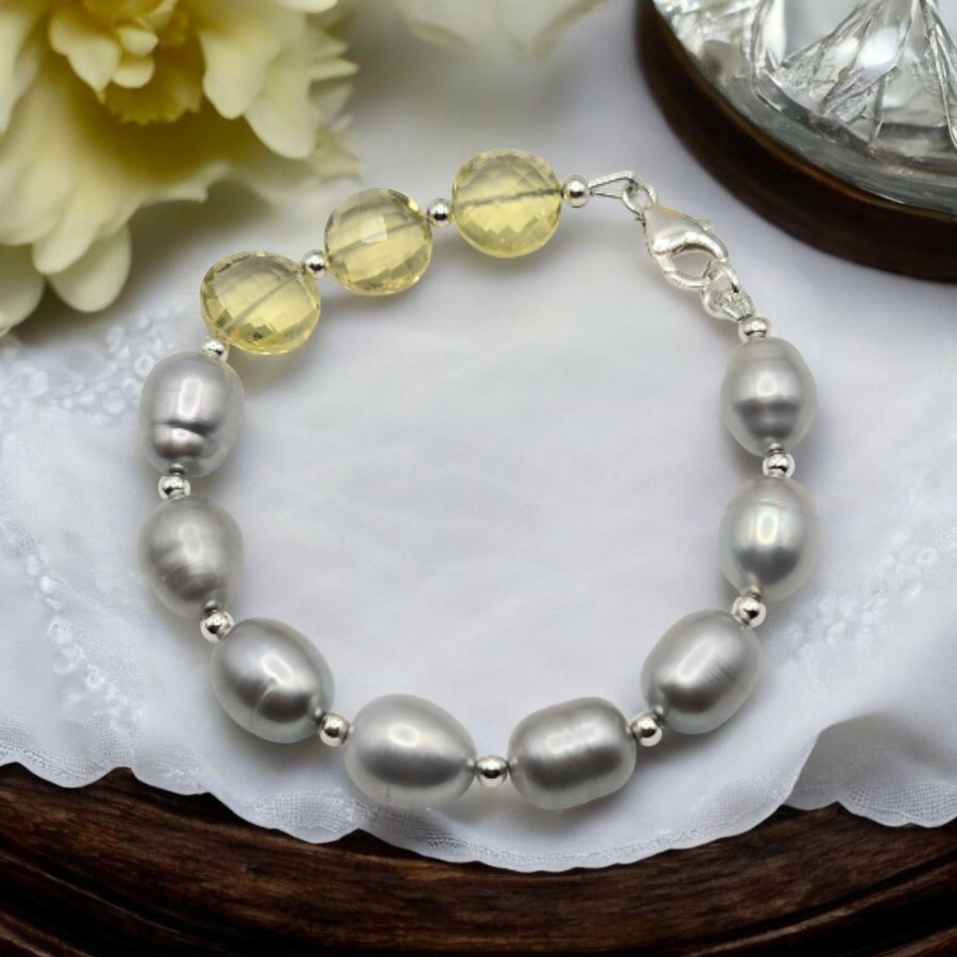 Soft, luminous, and quietly uplifting, this bracelet pairs silvery-gray freshwater pearls with a trio of faceted lemon quartz beads, creating a subtle sparkle that feels like sunlight on a calm morning. Tiny sterling spacer beads separate each gem, giving the design a gentle rhythm and understated elegance. The bracelet is finished with a simple sterling lobster claw clasp for effortless wear.