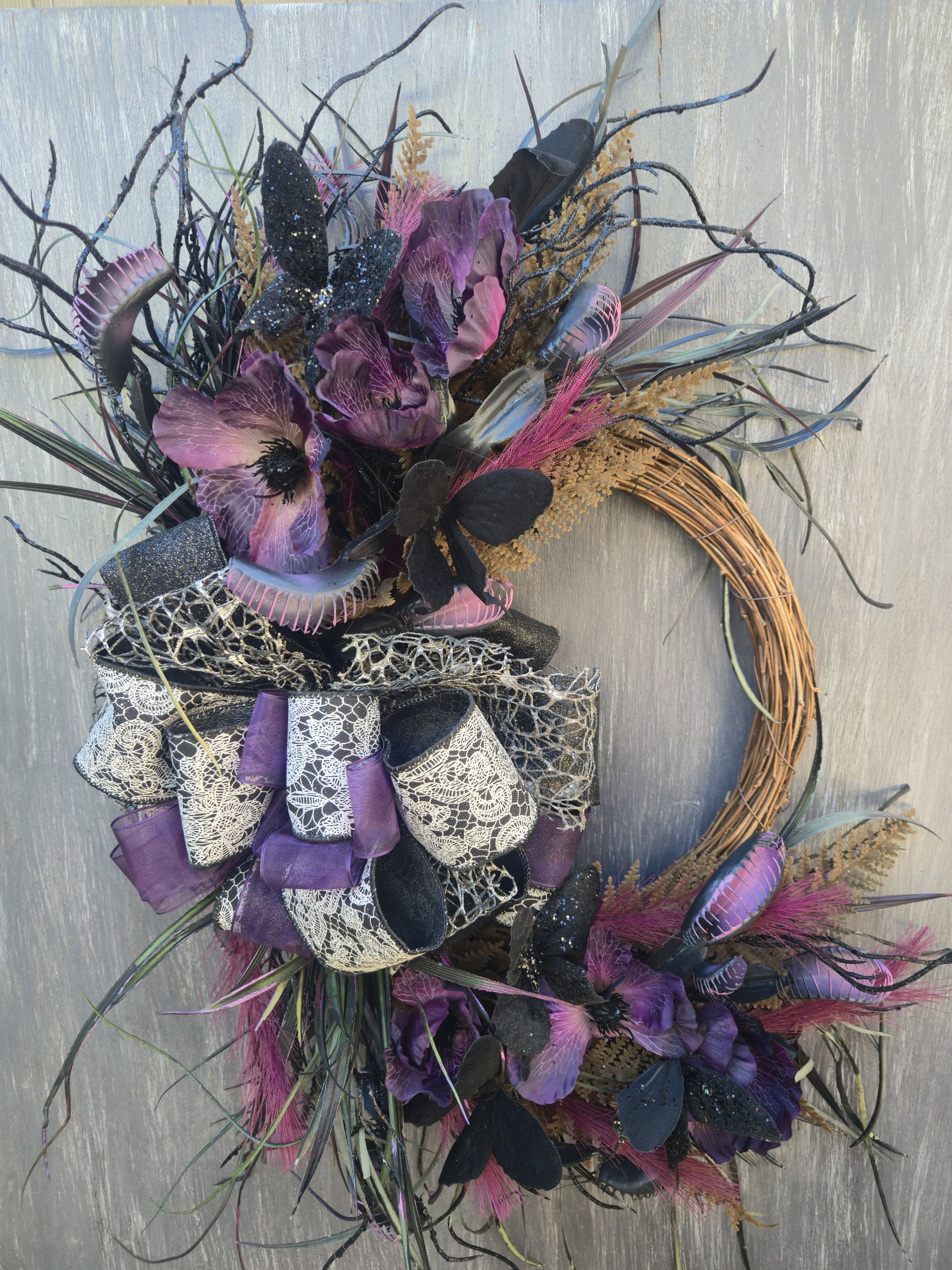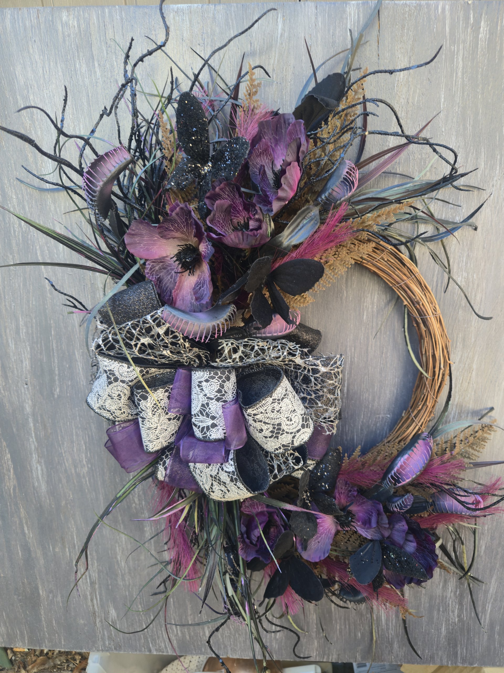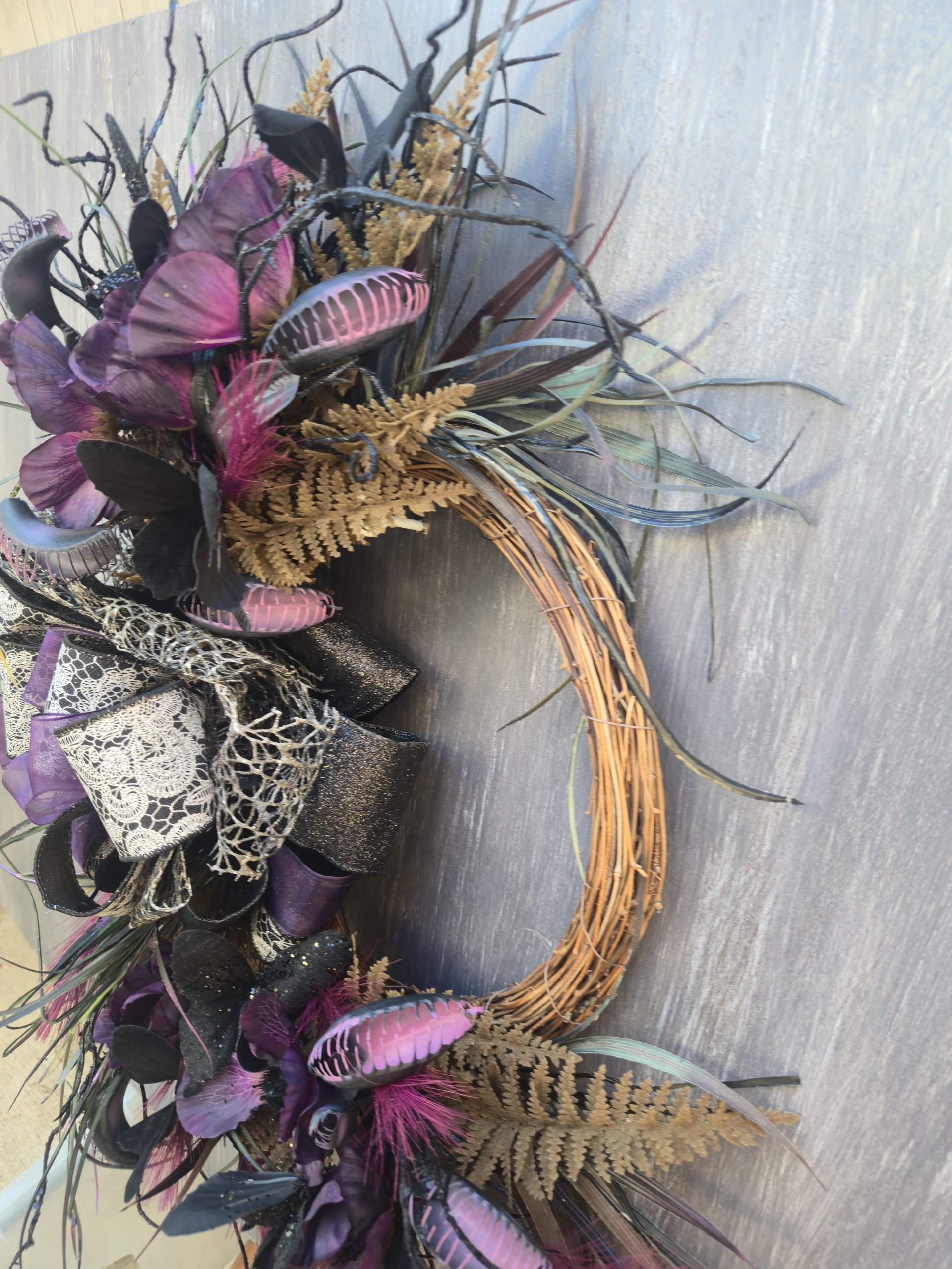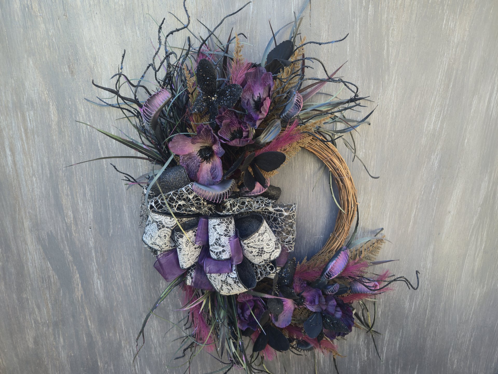 Made on a grapevine base using deep purples and black creating a moody but sophisticated theme. Adorned with deep purple poppy flowers and black sparkly butterflies adds a touchofglam.. Wispy dark foliage and greenery adding an eerie overgrown feel. A multi-layered bow of deep purples and black and white lace adding elegance to the gothic theme. This wreath evokes a sense of dark beauty and mystery making it a stylish and spooky halloween decoration