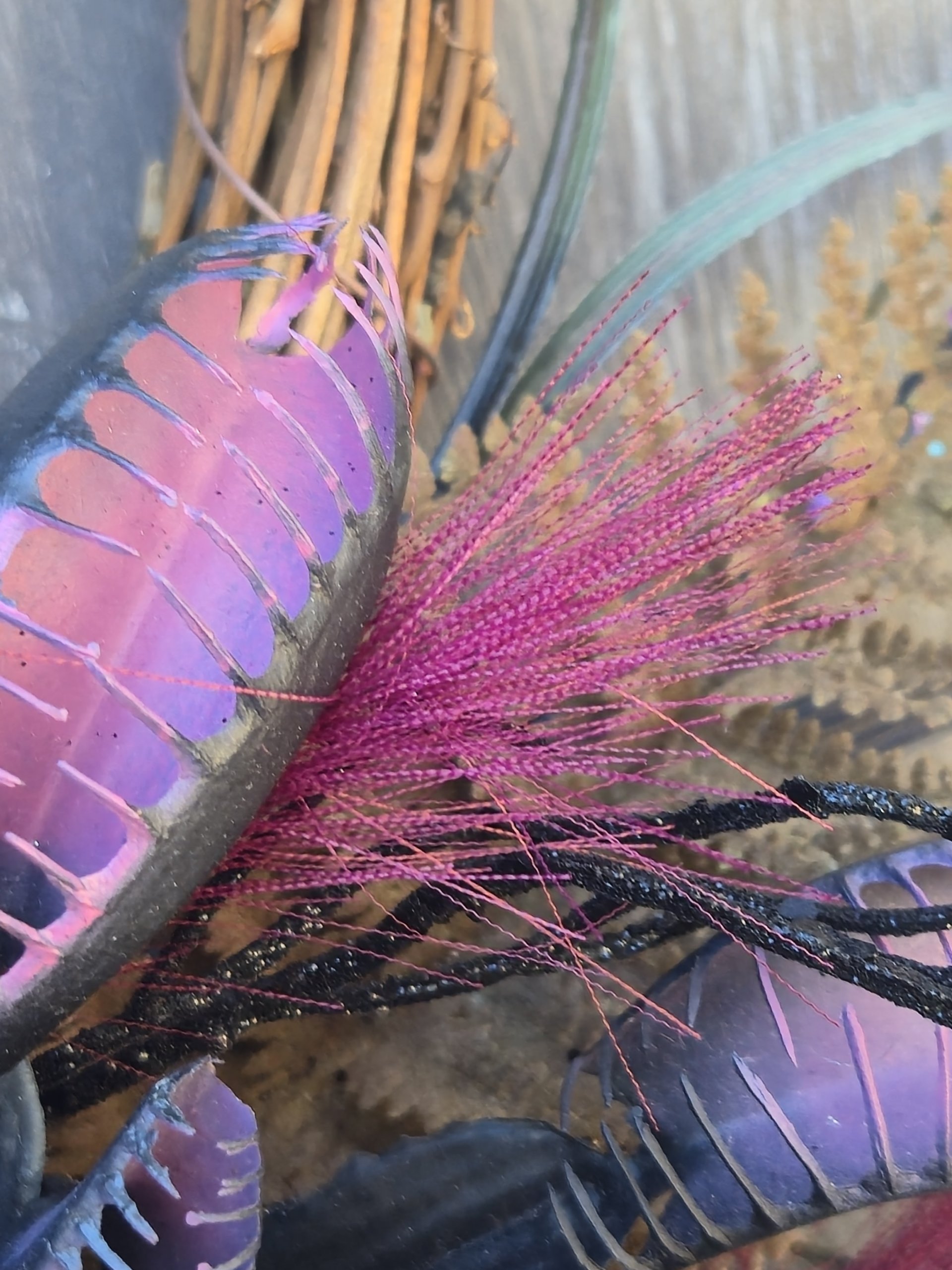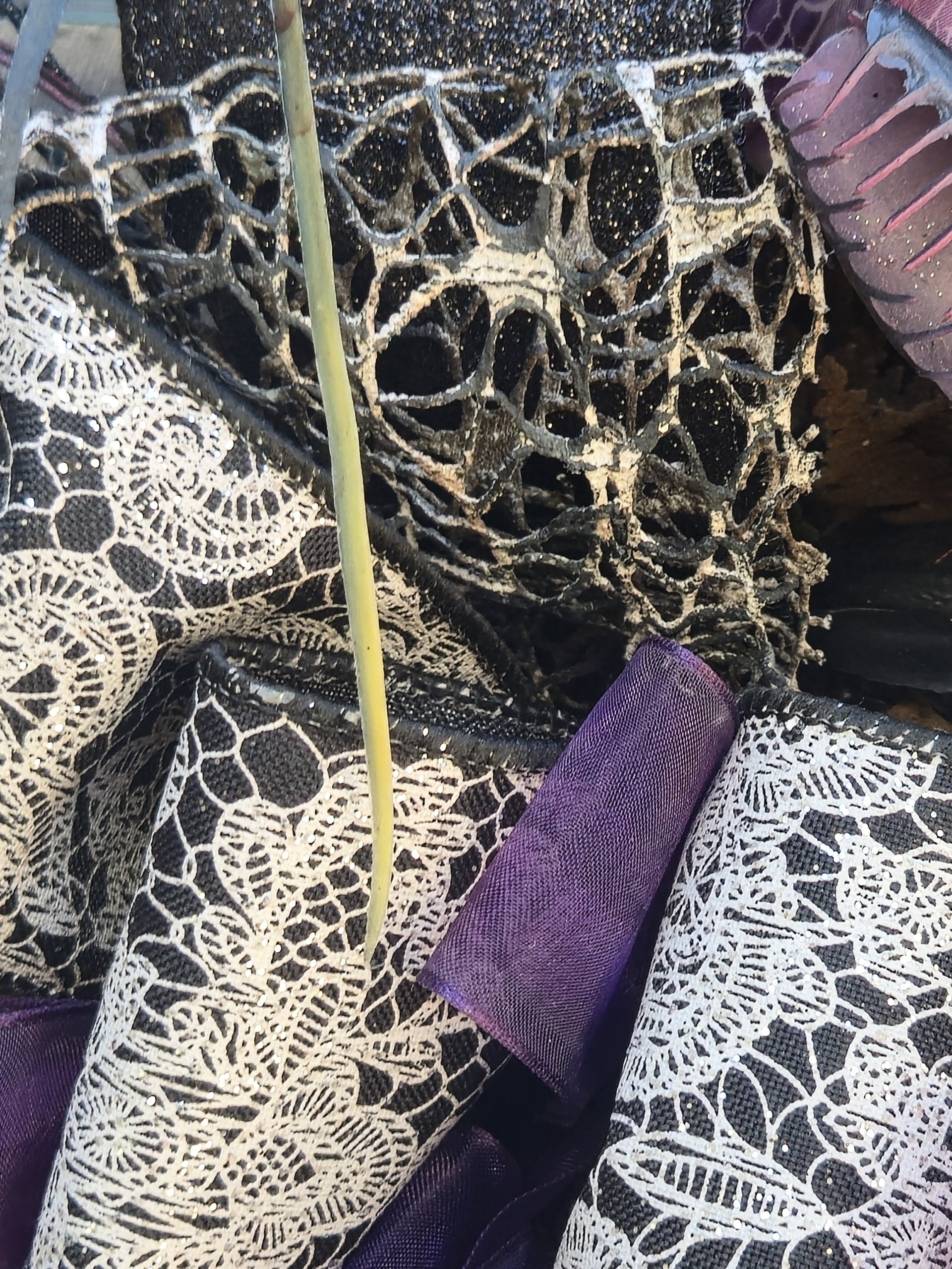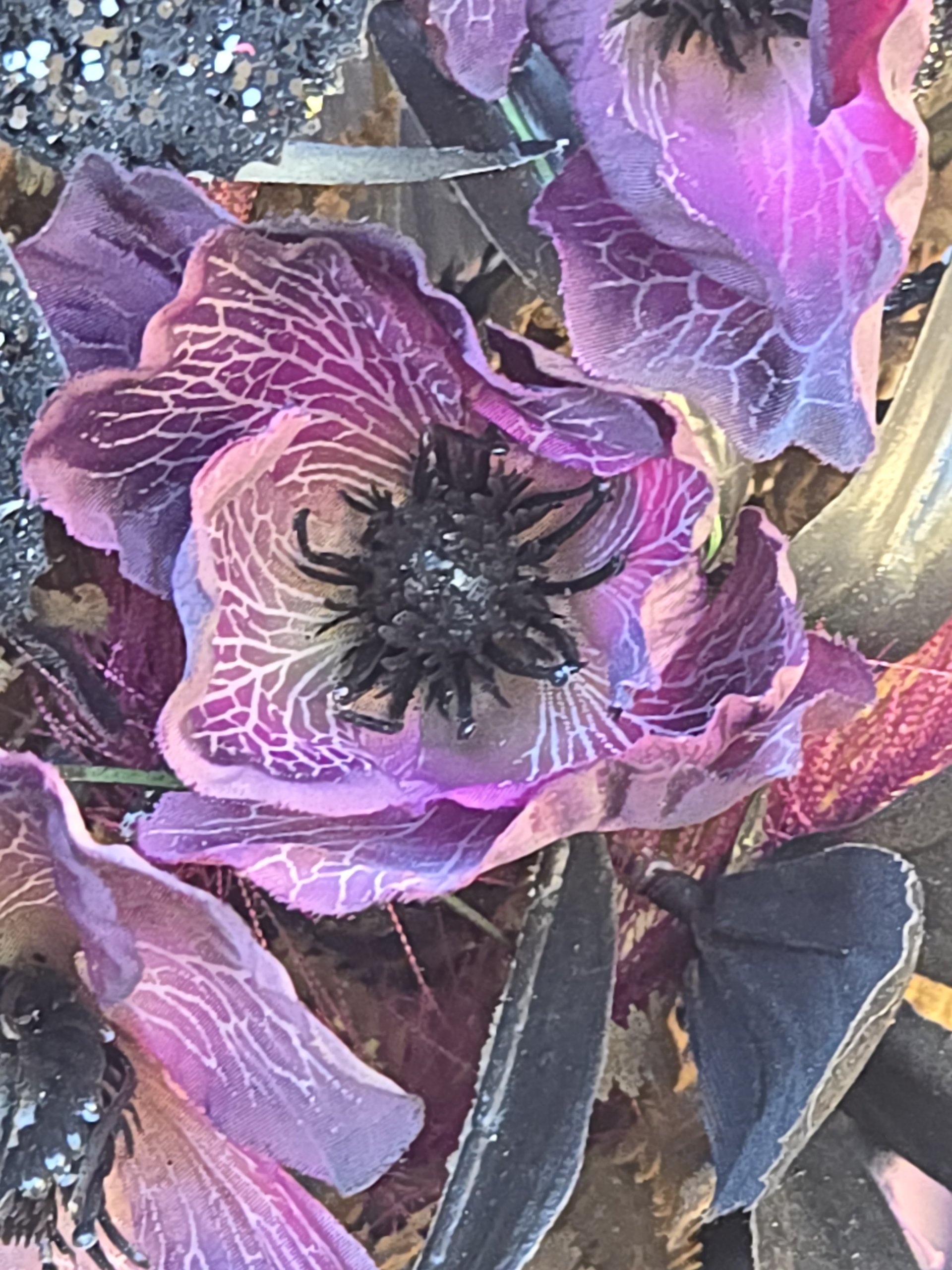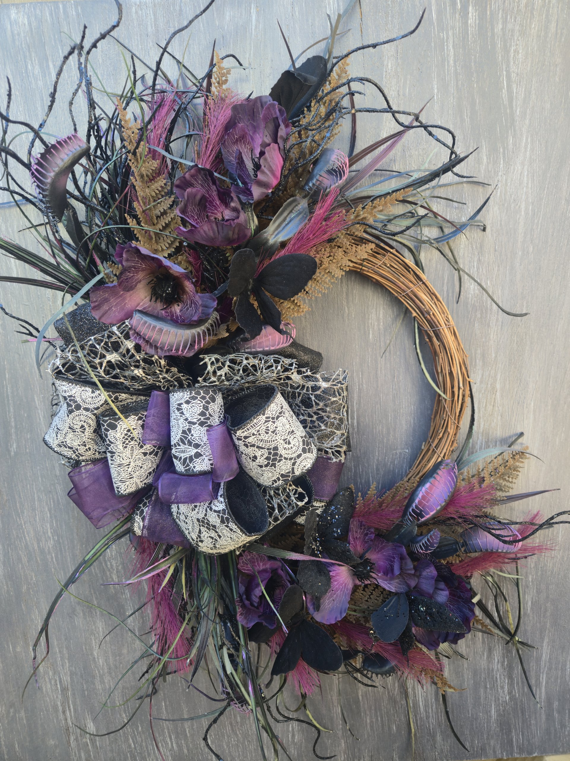 Made on a grapevine base using deep purples and black creating a moody but sophisticated theme. Adorned with deep purple poppy flowers and black sparkly butterflies adds a touchofglam.. Wispy dark foliage and greenery adding an eerie overgrown feel. A multi-layered bow of deep purples and black and white lace adding elegance to the gothic theme. This wreath evokes a sense of dark beauty and mystery making it a stylish and spooky halloween decoration