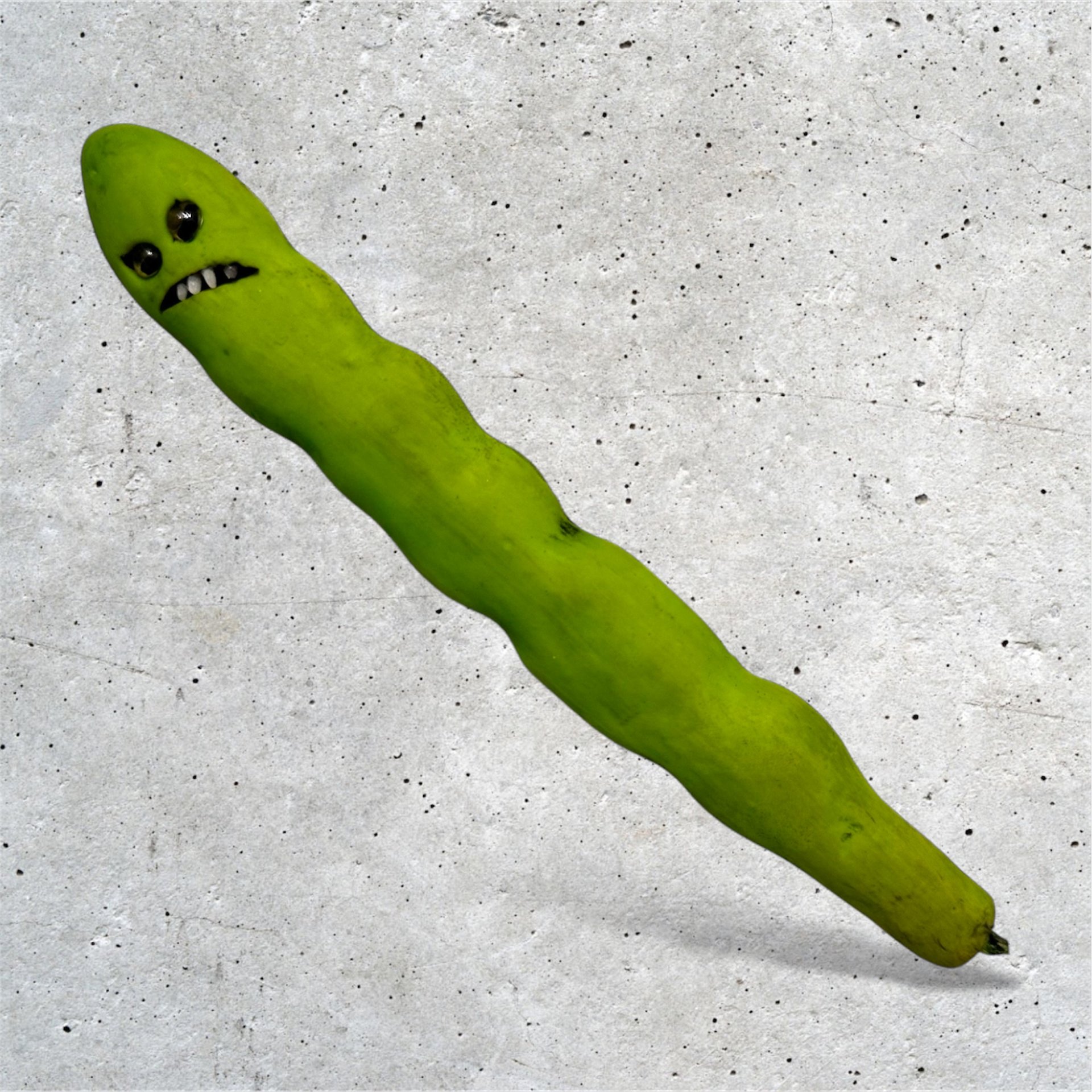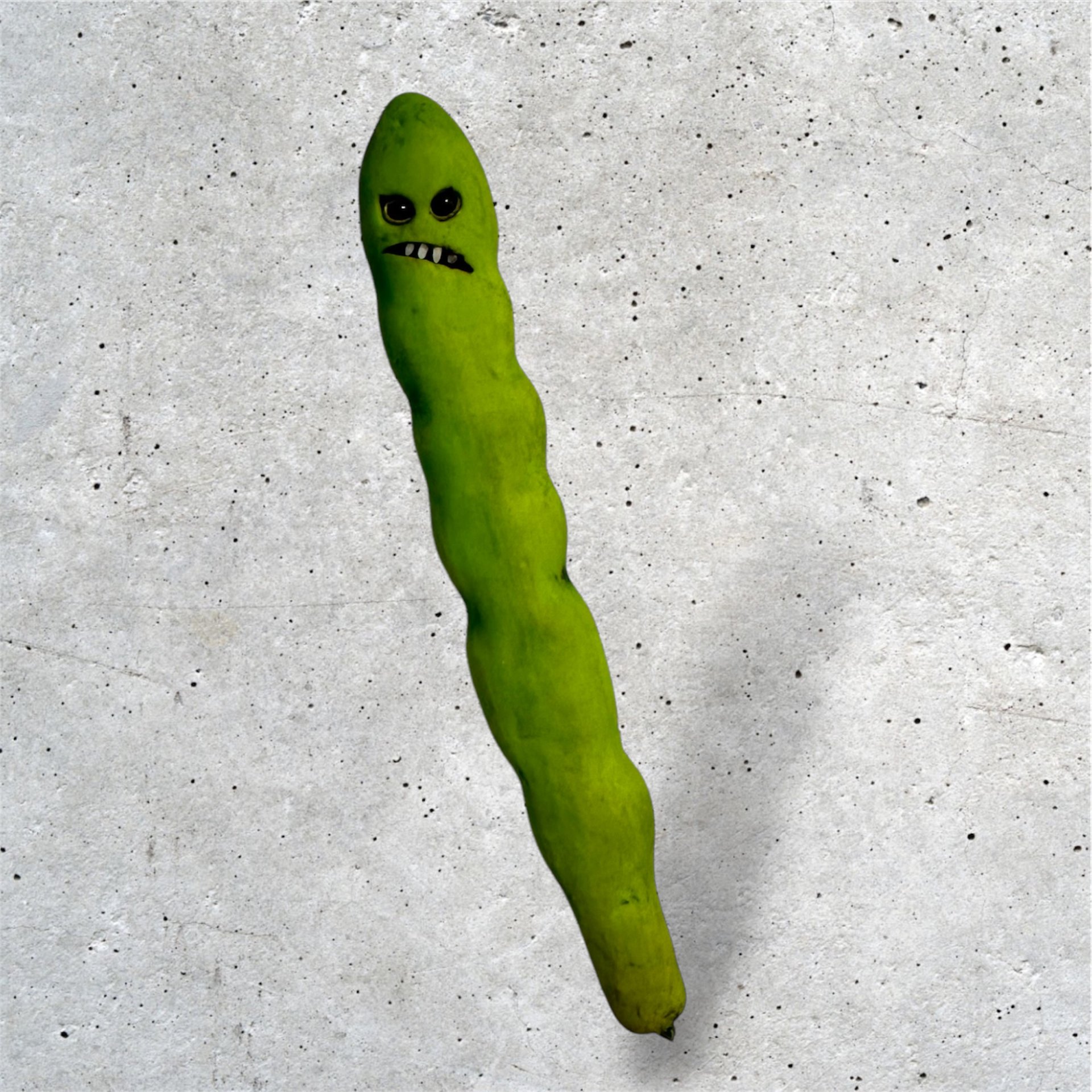 Green Bean, string bean, edamame, lima bean? You choose! They all look about the same to me! Super realistic bean pod with yellow eyes made of glass and a growly mouth with rice for teeth. Intentionally bruised and painted to look a bit rotten. No reason to have this bean pod except to just merely have it, I guess!! My items are good for a laugh, a joke, or just to have something no one else has. Hi measures 7" tall.